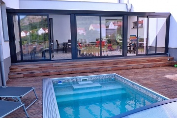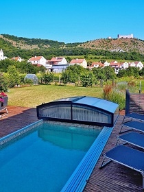 Chalupa Pálava s bazénem se nachází v samém srdci Pálavy pod hradem Děvičky v malebné vesničce Pavlov, která díky dobrému vínu, přírodě, blízkým památkám UNESCO, cyklostezkám a nedalekému Aqualand Moravia patří mezi turisticky oblíbené destinace. Těšit se můžete na pobyt v nově vybudovaných a moderně vybavených apartmánech s vlastní kuchyní, koupelnou a klimatizací a s krásným výhledem na hrad Děvičky a vodní nádrž Nové Mlýny. Užívat si budete relaxování ve wellness místnosti se saunou a vířivkou nebo v letních měsících koupání ve venkovním bazénu. Apartmánová chalupa nabízí ubytování pro až 20 osob v pěti samostatně pronajímaných apartmánech, celkem je k dispozici 10 pevných lůžek a 10 přistýlek řešených rozkládací pohovkou. Po domluvě lze objekt pronajmout jako celek. Za příplatek lze zajistit snídaně. Součástí každého apartmánu je manželská postel, rozkládací pohovka (pro 2 osoby), TV, jídelní stůl, koupelna a WC a plně vybavená kuchyň (rychlovarná konvice, lednička, mikrovlnná trouba a nádobí). Dětská postýlka je k zapůjčení. Pro všechny ubytované je k dispozici společenská místnost s vybavenou kuchyní (varná deska, varná konvice, kávovar, myčka, nádobí, atd.), posezením, TV a stolním fotbalem. Všichni ubytování si mohou užívat odpočinek ve wellness místnosti se saunou a vířivou vanou. Pro společné chvíle slouží také zimní zahrada s několika jídelními stoly. Sociální zařízení zahrnuje celkem šest koupelen a šest WC. Vytápění je řešeno elektrickým topením. V celém objektu je k dispozici WIFI připojení na internet. U domu lze volné chvíle trávit u venkovního bazénu s lehátky nebo si užívat květinovou zahradu. K dispozici je gril. Pro děti je připravená trampolína a pískoviště. Součástí domu je půjčovna kol a elektrokol. Parkovat lze přímo u objektu. V okolí apartmánů možnost turistiky, cykloturistiky, koupání, houbaření a rybaření. V blízkosti je jízdárna, půjčovna kol, tenisové kurty a golfové hřiště. V nedalekém okolí lze projít několik vinařských stezek a navštívit spousty dobrých vinařství. Mezi možnosti koupání patří např.: vodní nádrž Nové Mlýny, lom Mariánský mlýn, aquapark Pasohlávky Aqualand Moravia, koupaliště Mikulov - Riviéra, bazén Hustopeče, koupaliště Hustopeče, koupaliště Březí, rybník Šutrák, koupaliště Horní Bojanovice, koupaliště Němčičky, atd. V nedalekém okolí lze projít několik vinařských stezek a navštívit spousty dobrých vinařství. K výletům v okolí láká Archeopark Pavlov, Yachclub Pavlov - Nové Mlýny, přístav, vyjížďky parníkem, Pálavské vrchy - CHKO Pálava, Hrad Děvičky, Lednicko - Valtický areál (UNESCO), Svatý kopeček v Mikulově, Siročí hrádek a Stolová hora nad obcí Klentnice a další. Těšíme se na Vás u nás.