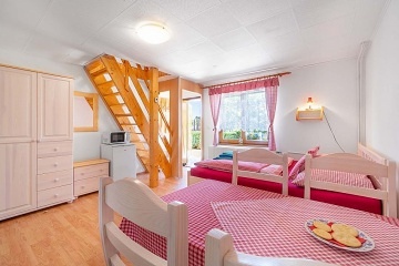 Apartmánová chalupa Mateřídouška s bazénem - Chlum u Třeboně se nachází v srdci Třeboňska v Chlumu u Třeboně, kousek od rybníka Hejtman, lokalita obcí Hamr a Staňkov. Wellness apartmánová chalupa s venkovním bazénem a saunou jsou svoji polohou ideálním výchozím bodem pro cykloturistiku kolem třeboňských rybníků. Jedná se o 6 samostatných a plně vybavených apartmánů pro až 27 osob s vlastním posezením na terase, které si můžete pronajmout samostatně, popř. celou chalupu jako celek. Každý apartmán má TV, Wi-Fi připojení, vlastní sociální zařízení se sprchovým koutem, WC a plně vybavenou kuchyň (nádobí, lednice, mrazák, mikrovlnná trouba, rychlovarná konvice, dvouplotýnková varná deska/vařič). Apartmán 1-4: mezonetové čtyřlůžkové apartmány s jednou ložnicí (2x jednolůžko) a v obývací části s dvoulůžkem. Apartmán 5: pětilůžkový s jednou ložnicí (1x dvoulůžko) a v obývací části s dvoulůžkem a jednolůžkem. Apartmán 6: šestilůžkový apartmán o velikosti 3+1 se dvěma třílůžkovými ložnicemi (1x dvoulůžko, 1x jednolůžko). Možnost zapůjčení dětské postýlky. Součástí apartmánu je větší obývací pokoj s krbovými kamny a prostorná kuchyň, kde je navíc oproti ostatním apartmánům myčka a trouba. Objekt je vytápěn elektrickými přímotopy. Všichni ubytovaní mají možnost využívat společenskou místnost s krbem a krásnou, prostornou zahradu, kde je k dispozici: venkovní bazén, sauna, zastřešené posezení s grilem, ohniště, dětské hřišťátko s domečkem, skluzavkou, pískovištěm a houpačkami. Možnost úschovy kol v uzamykatelné kolárně. Parkování přímo u objektu pro 6 aut. V okolí se nachází velké množství cyklostezek i turistických tras. Tipy na výlety: Jindřichův Hradec - historické centrum, město Třeboň se zámkem, plavba parníkem po rybníku Svět, ZOO Horní Pěna, Litschau - městečko v Rakousku. Možnosti koupání: rybník Hejtman, Staňkovský rybník nebo pískovna Cep. Další zajímavé lokality - Červená Lhota, Hluboká nad Vltavou, České Budějovice, Český Krumlov. Těšíme se na Vás u nás.