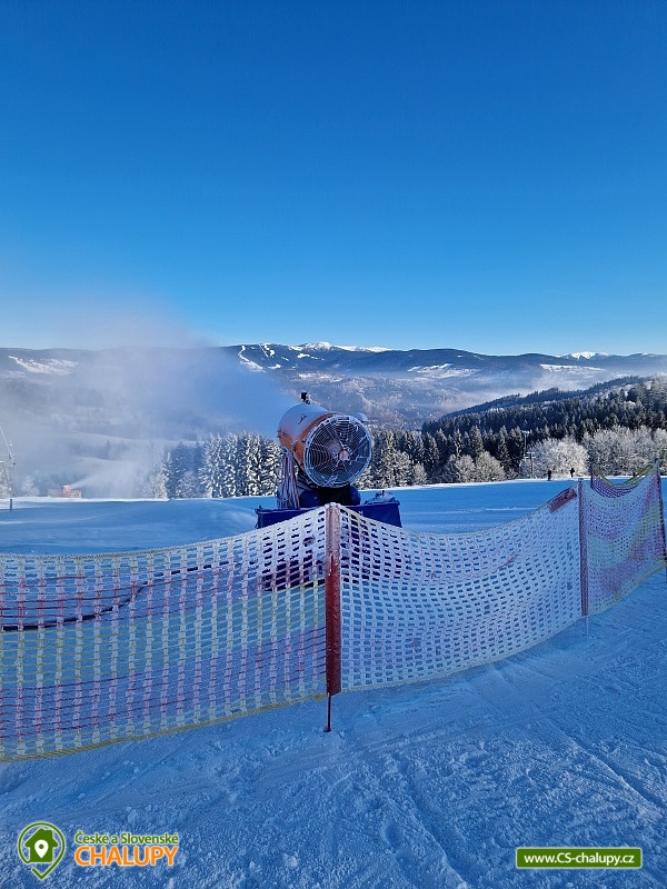 Chalupa s bazénem nedaleko areálu Kamenec - Vysoké nad Jizerou - Horní Tříč. Zastřešený bazén se slanou vodou je k dispozici v letní sezóně - 10x4 m. Hloubka 1,3 m. Chalupa k pronajmutí poskytuje ubytování pro až 18 osob v 5 ložnicích. Klidná příroda, 5 pokojů, 6 koupelen, 5 lednic, zahradní krb, dětské hřiště se skluzavkou, pískoviště. Vybavená kuchyň s myčkou, společenská místnost, wi - fi. Venkovní posezení u domu. Billiard, stolní fotbálek, šipky - zdarma. Ideální místo na dovolenou pro 3 - 5 rodin, skupinu přátel, školení, firemní teambuilding. Pronajímáme samostatně uzavřené 1. patro v rodinném domě. Majitel bydlí celoročně v přízemí (společný je pouze vchod v zimě) - denně odnáší hostům odpad, v zimě denně topí. Venkovní posezení přímo u domu. Uzamykatelná garáž na kola. V létě je k dispozici vlastní vchod. Na patře se nachází 5 vybavených pokojů. V každém pokoji najdete 3 - 4 lůžka, koberec, skříň, stůl a židle, lampičky, poličky nebo noční stolky. Wi - fi po celém objektu. Z každého pokoje je vchod do vlastní koupelny. + k zapůjčení je 1 dětská postýlka a 1 dětská krmící židlička. Sociální zařízení: Na každém pokoji se nachází sociální zařízení (sprcha, WC, umyvadlo) + 6.koupelna je společná na chodbě (WC + vana). Pro 5 pokojů tedy máme 6 koupelen. Topení je ústřední a zajišťuje ho majitel. Parkoviště u domu je zdarma = 6 parkovacích míst. Společenská místnost, vybavená kuchyně (2 sporáky, myčka, mikrovlnka, automatický kávovar Krups na zrnka, kávovar na kapsle DOLCE GUSTO, kávovar, varné konvice, 2x topinkovač, toustovač, nádobí). Celoročně: herna - stolní fotbálek, elektronické šipky a billiard - využití všech uvedených zařízení je samozřejmě zdarma. Wi - fi po celém objektu zdarma. Léto: Zahradní krb, gril, ohniště. Venkovní posezení přímo u domu. Venkovní stolní tenis. Houpačka, pískoviště. Dětské hřiště (pro děti ve věku 3 - 12 let) je k dispozici od 1.dubna do září. Ubytování v soukromí, v klidné přírodě. Skiareály: Kamenec - (300 metrů od domu do mírného kopce k horní části vleku, zpět je možné přijet v případě dobrých sněhových podmínek na lyžích až k domu - Jablonec nad Jizerou), Šachty, Petruškovy vrcha- 2 km autem (Vysoké nad Jizerou). Pro běžkaře je zde více než 35 km značených a upravovaných běžeckých tratí. Sáňkovat či bobovat, případně stavět sněhuláky je možné přímo u domu na loukách. Uzamykatelná garáž na lyže, sáňky a boby. Další lyžařské vleky jsou například v Pasekách nad Jizerou (7 km), Rokytnici nad Jizerou (9 km) nebo v Harrachově (17 km).