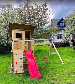 Chalupa s bazénem - Králický Sněžník - Kunčice - Staré Město. Užijte si wellness dovolenou v podhůří Králického Sněžníku. Chalupa je vhodná pro rodiny s dětmi nebo skupinu přátel, která chce strávit dovolenou se vším komfortem a soukromím. Chalupu lze pronajmout jako celek jedné skupině klientů. Chalupa je maximálně pro 23 osob - 15 lůžek a 8 přistýlek. Přistýlky nejsou započítány v celkové ceně. Každý apartmán má plně vybavený kuchyňský kout, ložnici (kromě apartmánu 4) a obývací část s jídelním stolem. Apartmány mají vlastní koupelnu se sprchou a wc, k dispozici máte ručníky, osušky, fén a toaletní potřeby. Rozkládací sedačku v obývací části je možné použít jako přistýlku pro 1 - 2 osoby. Najdete u nás venkovní vyhřívaný bazén, venkovní vířivou vanu, finskou saunu, infrasaunu, velkou oplocenou zahradu, dětské hřiště, venkovní posezení, ohniště, gril, lyžárnu / kolárnu, vnitřní posezení se šipkami a malým pingpongovým stolem. Od jara do podzimu posezení ve stodole s hernou - billiard, stolní fotbálek, air hokej (nelze využít přes zimu). Parkování přímo u chalupy. Apartmány jsou vytápěné elektrickými přímotopy. Chalupa se nachází u lyžařské sjezdovky. V okolí chalupy je udržovaná louka, na které se v letním období pasou koně. Kunčice jsou malou horskou vesnicí rozkládající se na úpatí masivu Kralického Sněžníku a Rychlebských hor nabízející podmínky pro zimní sporty, cykloturistiku, pěší turistiku ale i relaxaci a odpočinek. Chalupa se nachází u sjezdovky. Těšíme se na Vás. V blízkosti doporučujeme navštívit velkou zajímavost: přečerpávací vodní elektrárna Dlouhé stráně, jež je jedním z divů, protože se jedná se o nejvýkonnější vodní elektrárnu v Česku uvnitř chráněné krajinné oblasti. Dominantou Staroměstska je Kralický Sněžník (1424 m), na jehož vrcholu kdysi stávala rozhledna. Blízká lyžařská střediska v okolí: Skitech Kunčice, Stříbrnice - Návrší, Hynčice - Kraličák, Paprsek, Branná, Jonas park Ostružná, Petříkov, Na Hájovně Branná, Petříkov, X-park Františkov, Zetocha Petříkov, Malá Morava - Vysoká a Ski klub Ramzová pod Klínem. Další možnosti koupání mimo náš bazén: Hynčice pod Sušinou - rybník Úžas, lom Žulová - Brankopy, koupaliště Králíky, Arcibiskupský lom, lom Vycpálek, lom Žulová, termální koupaliště Velké Losiny, Velké Losiny - termály, bazén Domašov - Bělá pod Pradědem, bazén Jeseník - Priessnitz, lom Rampa, koupaliště Jeseník, lom Vaněk, koupaliště Rapotín, bazén Mezilesí.