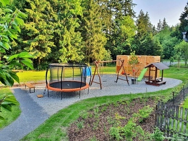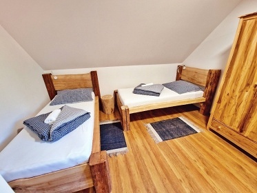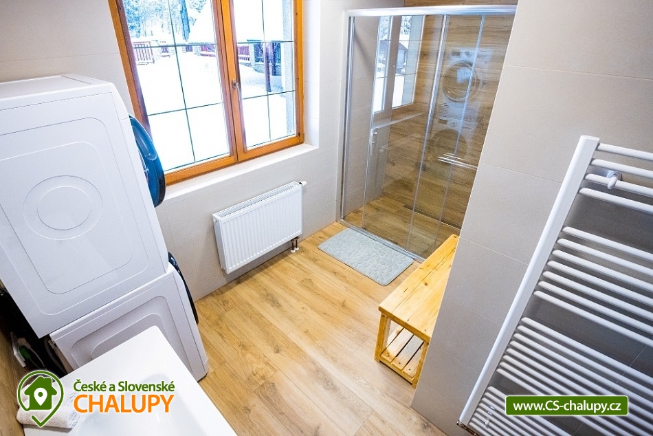 Chalupa s wellness u Kněhyně - Beskydy - Bečva. Stylová wellness chalupa s polohou na okraji lesa v obci Prostřední Bečva v Beskydech. U chalupy je velká zahrada a v blízkosti protéká potok Kněhyně. Areál chalupy je kompletně oplocený a skýtá tak oázu klidu pro Vaší rekreaci a pohodový pobyt. Atraktivní turistická místa v blízkém okolí z nichž nejznámější jsou 7 km vzdálené Pustevny. Nově k dispozici v chalupě vlastní wellness (finská sauna, whirlpool). Chalupa k pronajmutí poskytuje ubytování pro 8 osob ve 3 ložnicích: 3 ložnice v patře chalupy ( 1x 4 lůžková ložnice + 2 x 2 lůžková ložnice). Kompletně vybavená kuchyně: kombinovaná chladnička, kapslové espresso, myčka (tablety do myčky jsou v ceně pobytu), vestavná trouba, mikrovlna trouba, indukční varná deska, multirobot, rychlovarná konvice a topinkovač. Ostatní vybavení: WiFi připojení, krb, TV, rádio, pračka, sušička, společenské hry, úschovna kol a lyží. Obývací pokoj: prostorná sedačka a TV. Sociální zařízení: Koupelna přízemí - prostorný sprchový kout, samostatné WC. Koupelna v patře - vana, sprchový kout a WC. Ručníky jsou k dispozici v ceně pobytu. Vytápění elektrické - radiátory a krb v obývacím pokoji. V okolí doporučujeme: Pustevny patří mezi nejatraktivnější místa v Beskydech. Najdete zde typické dřevěné stavby v lidovém slohu. Z Pusteven se dostanete snadno širokým chodníčkem k soše pohanského boha Radegasta, která leží v polovině cesty na Radhošť v nadmořské výšce 1129 m. Radhošť, nejznámější hora Beskyd, nabízí okouzlující výhledy na celé Beskydy, Jeseníky, Valašsko, Malou a Velkou Fatru. Dále Valašské muzeum v Rožnově pod Radhoštěm a Gibon park Rožnov pod Radhoštěm. Těšíme se na Vás u nás.