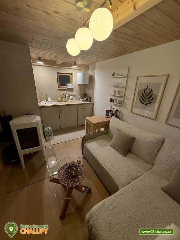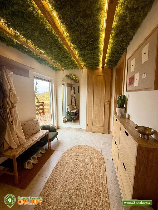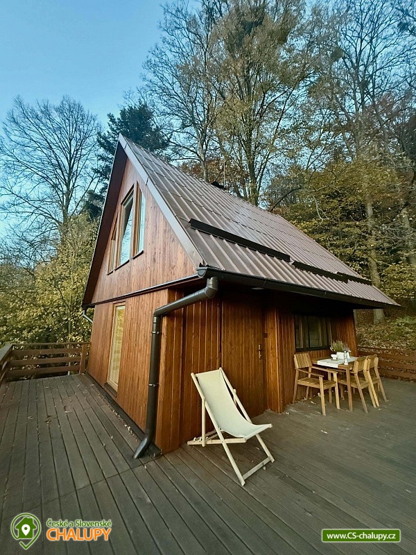 Chata s vyhřívaným koupacím sudem se nachází v srdci Hostýnských vrchů v obci Chvalčov s fenomenálním výhledem na západ slunce. Chata se pronajímá celoročně. Chata se nachází přímo pod poutním místem Svatý Hostýn a nedalekými rozhlednami Kelčský Javorník a Maruška. V jeho okolí se dále nachází známý Masarykův chodník, zámek Bystřice pod Hostýnem a zámek Holešov. Chata se skládá z předsíně, koupelny, obývacího pokoje s krbovými kamny a kuchyňským koutem. V prvním patře je chill zóna s ložnicí. Venku je prostorná terasa s posezením a koupací sud. Kapacita max 4 osoby - jedna manželská postel v prvním patře a jedna rozkládací pohovka v přízemí. POPIS: V Chatě se nachází předsíň, ve které je botník, lavice věšák a informační nástěnka, kde mimo jiné naleznete heslo k wifi a povolenku pro vjezd na poutní místo Svatý Hostýn. V Chatě se dále nachází koupelna, ve které využíváme dešťovou vodu na splachování toalety. Umyvadlo a sprchový kout využívá vodu z nádrže na pitnou vodu, kterou na chatu dovážíme. V obývacím pokoji se nachází krbová kamna a rozkládací pohovka, která slouží na spaní pro další dvě osoby. Součástí obývacího pokoje je kuchyňský kout, ve kterém naleznete dvou plotýnkovou indukční varnou desku s digestoří, ledničku s mrazákem, granitový dřez, mikrovlnou troubu a rychlovarnou konvicí. Kuchyňský kout je plně vybaven nádobím. Součástí obývacího pokoje je i koutek s kávovarem. V prvním patře se nachází ložnice s chill zónou. V ložnici se nachází manželská postel o velikosti 160 cm x 200 cm, chytrá televize, internet a klimatizace. V chill zóně naleznete dvě křesílka s výhledem na obec Chvalčov, gramofon a vinotéku. Zde naleznete i dostatek úložného prostoru. Pro každého hosta máme nachystaný welcome drink. Relax a pohodu si můžete užít i na velké terase s posezením a výhledem do přírody, ve které naleznete i luxusní koupací sud s aero systémem a LED osvětlením. Pozemek o velikosti 400 m2 není oplocen. Parkování je možné 50 metrů od chaty, kdy k tomuto se dostanete po nezpevněné komunikaci. Další možnost parkování je u klasické asfaltové komunikace ulice Dědina v místě u studánky a to ve vzdálenosti cca 250 metrů od chaty. Okolí: Zavítat můžete na nově zrekonstruovaný hrad Helfštýn, Zbrašovské jeskyně, Hranickou propast, známou zlínskou ZOO Lešná či vyhlášenou Květnou a Podzámeckou zahradu v Kroměříži. Chata je obklopena místními lesy, kde si můžete vychutnat klidnou procházku. Romantický pobyt můžete okořenit projížďkou na koních. Nechybí občanská vybavenost včetně letního kina, koupaliště a lyžařských středisek Tesák a Troják s velkým množstvím běžkařských i cyklistických tras. Těšíme se na Vaši návštěvu. Zamilujte si Hostýnské vrchy stejně, jako je milujeme my.