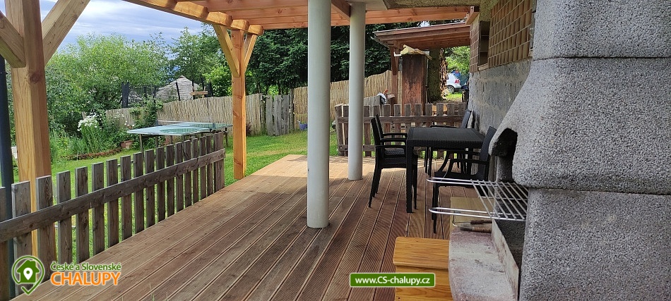 Celoročně obyvatelná chata se nachází v krásné pošumavské přírodě s jedinečným výhledem na Šumavu. Chata po celkové rekonstrukci se zastřešeným venkovním bazénem, zimní zahradou, infrasaunou, klimatizací a plně vybavenou domácností, vhodná pro rodinou rekreaci (rodiče + 2 - 3 děti). Chata má 2 podlaží. V přízemí se nachází kuchyně, obývací pokoj, WC a koupelna, v horním patře je předsíň s infrasaunou a 2 ložnice – jedna s manželskou postelí a druhá s palandami a přistýlkou. Na přání doplníme do ložnice rodičů komplet vybavenou dětskou postýlku (a případně i vaničku nebo nočník). Oba pokoje mají svoji klimatizaci. Obě ložnice mají samostatný vstup na společný balkon (z dětského pokoje je vchod uzamykatelný). V dětském pokoji je k dispozici polohovatelné křeslo a menší psací stůl, v ložnici rodičů pak 2 křesla a menší stolek na notebook nebo hraní deskových her. Vstup na schodiště je opatřen uzavíratelnou ohrádkou. V obývací pokoji s klimatizací je pohodlný gauč a 2 křesla. Z obývacího pokoje je vstup do zimní zahrady, ze které je nádherný výhled na Šumavu. Zimní zahrada má podlahové vytápění a zastínění markýzou. Celý objekt je nekuřácký, domácí mazlíčky pouze po telefonické domluvě. Objekt je vybaven lékárnou a hasicím přístrojem, plus detektorem oxidu uhelnatého ve všech pokojích. Sociální zařízení: Koupelna je v přízemí, je vybavena velkým sprchovým koutem a pračkou. WC s umyvadlem je zvlášť. K dispozici jsou velké osušky, ručníky, mýdlo. Vytápění: V zimně se dá topit v krbových kanadských kamnech nebo přitápět klimatizací a přímotopy. Vedle chaty je na zahradě zastřešený bazén (6 x 3 x 1,2 m) s protiproudem a vyhříváním přes solární kolektory a tepelné čerpadlo. Provoz bazénu garantujeme pouze v letní sezóně. Za chatou je menší zastřešené posezení a ohniště pro opékání buřtů nebo masa na grilu ze žulového kamene. K dispozici je menší zahrada okolo chaty, část zahrady je oplocená, děti mohou využívat herní prvky (trampolína, houpačky, stolní tenis). Hned u chaty je příjezdová cesta a za ní les, kde v houbařské sezoně najdete mnoho pokladů :-). Nedaleko je známá rozhledna sv. Markéty, která nabízí pohled na Domažlicko, Klatovsko i na vrcholky Šumavy. V Beňovech je pískovna, kde se dá v létě (i v zimě :-) ) vykoupat. Možnosti koupání kromě vl. bazénu: aquapark Kdyně, bazén Klatovy, koupaliště Stanětice, koupaliště Nýrsko, Biotop Mokrouš, koupaliště Roupov, bazén Domažlice, rybník Bušek. Těšíme se na Vás u nás.