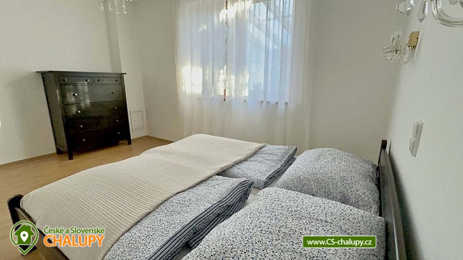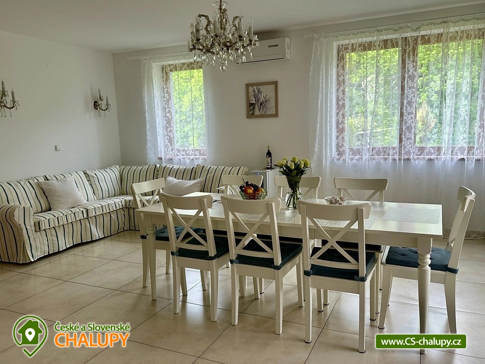 Chata s vířivkou se nachází v obci Hlohovec na Jižní Moravě přímo v srdci Lednicko-valtického areálu (UNESCO) jen pár metrů od Hraničního zámečku a hlohoveckého rybníka. V blízké Lednici si můžete užívat krásy zámecké zahrady nebo plout loďkou po kanálu a během plavby si vychutnat několik jedinečných staveb celého zámeckého areálu. Chata s vířivkou a klimatizací nabízí bezbariérové ubytování pro 6 osob ve třech dvoulůžkových ložnicích (3x manželská postel). Po domluvě možnost přistýlky (rozkládací pohovka). K zapůjčení je rozkládací dětská postýlka a dětská jídelní židlička. Chatu lze po domluvě využívat také pro pořádání denních seminářů, společenských setkání, fotografování, rodinných oslav apod. Společné chvíle můžete trávit v obývací místnosti s krbovými kamny, rohovou sedací soupravou, křesly, jídelním stolem pro 8 osob a TV se SAT příjmem. K zapůjčení jsou společenské hry. Na obývací část navazuje plně vybavená kuchyň (lednice, mrazák, elektrická varná deska, trouba, varná konvice, mikrovlnná trouba, myčka, plně automatický kávovar De Longi na zrnkovou kávu se zásobníkem plným zrnkové kávy, menší vinotéka a veškeré nádobí). Součástí všech tří ložnic je manželská postel 160x200 cm, komoda, křeslo, vnitřní závěsy a světla. Ve třetí ložnici je umístěná rozkládací pohovka 140x200 cm, která po domluvě může sloužit jako přistýlka pro jednu dospělou osobu nebo dvě děti. Celá chata včetně ložnic je vybavená venkovními zatemňovacími žaluziemi. V celém objektu je k dispozici WIFI připojení na internet. Sociální zařízení zahrnuje jednu koupelnu se sprchovým koutem, vanou a WC. K dispozici jsou ručníky a nočník pro děti. Vytápění je řešeno plynovým kotlem, podlahovým topením, krbovými kamny a k dispozici je klimatizace. Přímo z obývacího pokoje lze vstoupit na oplocenou zahradu. Její součástí je zastřešená terasa s posezením pro 8 osob, grilem a krásnými výhledy do vzrostlé zeleně zahrady nebo na les. Na terase je možné také relaxovat ve vířivce nebo si odpočinout v houpacím křesle či na lehátku. K zapůjčení jsou kola. Parkovat lze přímo u objektu. K dispozici jsou 3 parkovací místa. V okolí chaty možnost turistiky, cykloturistiky, koupání, houbaření a rybolov. V blízkosti je také fotbalové hřiště, tenisové kurty, minigolf a wellness. Mezi možnosti koupání patří např.: Mlýnský rybník, Lom Mariánský mlýn, Koupaliště Břeclav, Bazén Břeclav, Vodní nádrž Nové Mlýny, Bazén Hustopeče, Koupaliště Hustopeče, Aqualand Moravia atd. K výletům v okolí láká Přírodní rezervace Lednické rybníky, barokní Zámek Valtice známý také pro Národní vinařské centrum, Bylinková zahrada Lu & Tiree Chmelar, Biosférická rezervace Dolní Morava, CHKO Pálava, historická města Mikulov, Břeclav, Pavlov, Dolní a Horní Věstonice nebo termální lázně ve městě Laa an der Thaya v Rakousku. Těšíme se na Vás u nás.