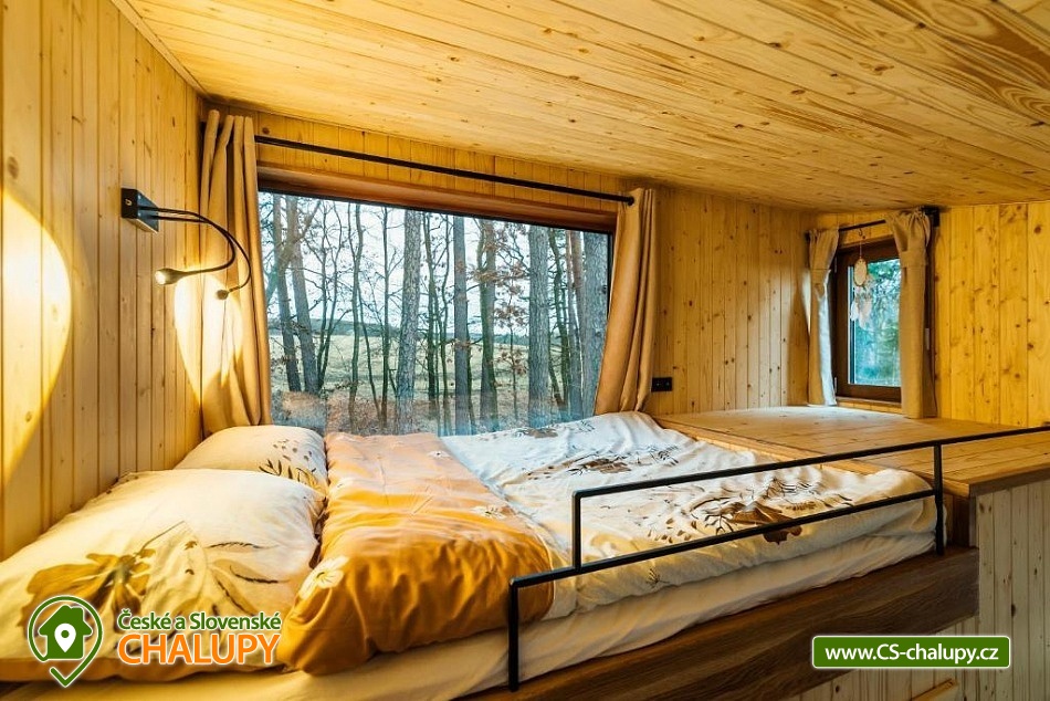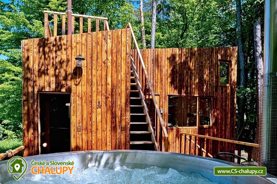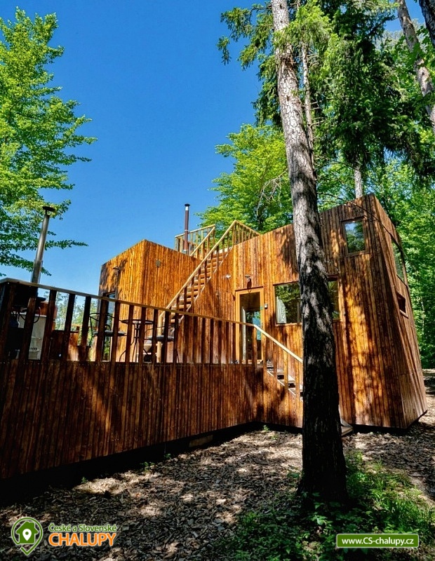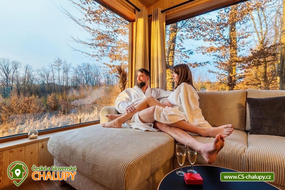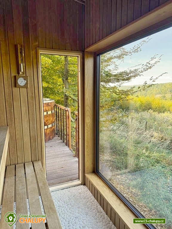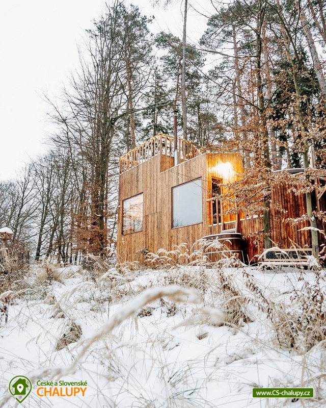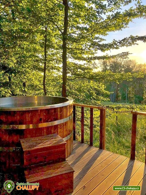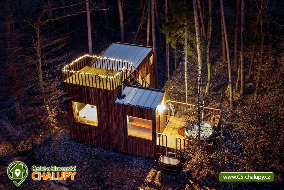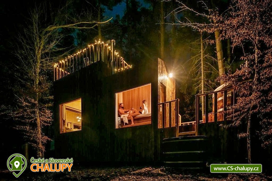 Netradiční ubytování - Glamping s wellness (sauna a koupací vyhřívaný sud) u CHKO Bílé Karpaty. Chata s výhledem na okolní přírodu, kde zažijete šumění listů i zpěv ptáků, má kapacitu až 4 osoby. Celkem je k dispozici 1x manželská postel a 2x přistýlka (rozkládací pohovka). Popis: Interiér chaty je útulný a téměř celý ze dřeva. V přízemní části se nachází komfortní obývací pokoj s krbovými kamny, která dotvářejí příjemnou atmosféru, dále je zde sedací souprava a kuchyňský kout s barovým posezením (kempinkový plynový vařič, rychlovarná konvice, lednice a kuchyňské nádobí). Celé místnosti dominují velká panoramatická okna, která celý prostor prosvětlují a můžete si díky nim po celý pobyt užívat krásné výhledy do okolní přírodní krajiny. Po dřevěných schodech vystoupáte do podkrovní ložnice s velkým letištěm na spaní, ze kterého můžete koukat do korun stromů. Sociální zařízení zahrnuje jednu stylovou koupelnu se sprchovým koutem, umyvadlem a WC. K dispozici jsou měkké župany, ručníky, fén na vlasy a přírodní sprchový gel, šampon na vlasy, mýdlo - speciální kosmetika z důvodu ekologické separace odpadů. Dále jsou k zapůjčení prostěradla do sauny a přezůvky pro možnost chození po terase (zahrnuto v ceně pobytu). Vytápění je řešeno plynovým topením. V celém objektu je k dispozici WIFI připojení na internet. V objektu je zajištěná pitná voda (v pet lahvích). Venku si lze užívat příjemné chvíle na vyvýšené terase s posezením, lehátky, plynovým grilem a koupacím sudem. Z terasy lze vstoupit do finské sauny s velkým panoramatickým oknem. K dispozici je úschovna pro kola a lyže. Parkovat lze přímo u objektu. K dispozici je 1 parkovací místo. Nutné je zohlednit, že k chatě vede cesta se ztíženým přístupem. Z těchto důvodů je možné ponechat automobil na odstavném parkovišti v obci Rudimov. Na přesun hostů k chatě je možné zajistit převoz Jeepem. V okolí objektu možnost turistiky, cykloturistiky, koupání, lyžování, běžkování, rybaření a houbaření. V blízkosti jsou tenisové kurty. Mezi možnosti koupání patří např.: Aquaparku Defín Uherský Brod, Koupaliště Duha Pozlovice, Vlachovice či Štítná nad Vláří, Městská plovárna Luhačovice atd. V zimním období jsou k dispozici lyžařské areály: Dubečky, Újezd nebo skiareál Pechancovy Lúky. K výletům v okolí láká historické centrum lázeňského města Luhačovice, Vizovické vrchy, Zříceniny hradů Světlov, Sehradice a Pulčín, Hvězdárna Uherský Brod, Rozhledny Doubrava a Královec, sportovní a rekreační areál Brumov-Bylnice, Zlín - město Tomáše Bati - zámek, muzea a zoo; dále historické centrum města Uherské Hradiště. Těšíme se na Vás u nás.