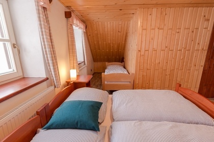 Roubená chalupa se saunou a vlastním rybníkem se nachází v krajinné oblasti Železných hor, v severní části Vysočiny obklopena krásami přírody. Chalupa je vzdálena 5 km od přírodní rezervace Maštale - tato přírodní rezervace chrání pískovcové skalní město Toulovcovy Maštale. Chalupa k pronájmu poskytuje ubytování pro až 14 osob ve 4 ložnicích. POPIS: Ložnice - 1x přízemí (manželská postel + patrová postel), 1x v podkroví (manželská postel + 2x jednolůžko + dětská postýlka), 2x v podkroví (manželská postel + jednolůžko). Sociální zařízení - koupelna: přízemí (sprchový kout, toaletní stolek s umyvadlem, pračka), patro (vana, toaletní stolek s umyvadlem a sauna s možností osvěžení v nově vybudovaném rybníku). Plně vybavená kuchyň (sklokeramická varná deska, horkovzdušná i mikrovlnná trouba, lednice s mrazákem, myčka, rychlovarná konvice, nádobí a veškeré kuchyňské vybavení). Veškerý KOMFORT MODERNÍ DOMÁCNOSTI ve spojení s atmosférou starých časů a venkovským stylem. Vytápění chalupy - ústřední topení elektrokotlem, je možné topit také v krbové vložce dřevem s rozvodem do ústředního topení. V chalupě je TV a wifi internet. U chalupy k dispozici rozlehlý pozemek s travnatou plochou např. pro hraní míčových her, skotačení dětí a možností opékání či grilování. Pro děti - houpačky, pískoviště, dětská židlička a postýlka. Celý objekt je NEKUŘÁCKÝ! U chalupy je Vám k dispozici vlastní rybník ke koupání nebo rybaření (rybník s nasazenými siveny, amury, candáty a kapry) - loďka k dispozici. Parkování přímo u chalupy. V okolí se nachází velké množství značených turistických tras a cyklotras. K oblíbeným výletním cílům patří rozhledna Terezka, skalní město Toulcovy Maštale a Peklo čertovina. Okolí skýtá mnoho možností ke koupání například na koupalištích Skuteč, Dolní Újezd, Bor u Skutče či v rybníku Krejcar. Lyžaři jistě ocení blízkost lyžařského střediska Hlinsko. Nedaleko obce se nacházejí celkem 4 lyžařské areály, nabízí lyžařské vleky dětské vleky (tzv. lanové), lyžařskou školu, půjčovnu lyžařského vybavení, občerstvení s útulným posezením. Těšíme se na Vás u nás.