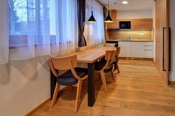 Chalupa pod Pradědem se saunou, Karlov pod Pradědem - Malá Morávka. Chalupa nabízí komfortní ubytování pro až 20 osob ve 3 apartmánech v nejkrásnějším turistickém středisku Jeseníků v obci Karlov pod Pradědem. Objekt nabízí ubytování ve 3 samostatných apartmánech pro 8 a 8 a 4 osoby - chalupu je možné si pronajmout jako celek v soukromí, stejně tak je možné se ubytovat a užít pronájmu jednotlivých apartmánů. Ve společných částech objektu, které jsou přístupné pro všechny 3 apartmány naleznete společenskou místnost a plně vybavenou kuchyňskou linku (včetně vinotéky a nabídky vín ke konzumaci). Atmosféru Vám bude zpříjemňovat vestavěný krb a možnost sledovat velkoplošnou projekci - a to jak tu televizní, tak díky celoprosklené stěně i tu reálnou v přírodě. Apartmán Sophia (6+2): apartmán s dvěma ložnicemi, obývacím pokojem a plně vybavenou kuchyní (lednice, trouba, myčka, mikrovlnná trouba), vlastní koupelnou a WC. Celková plocha apartmánu 70m². Apartmán Stela (6+2): apartmán s dvěma ložnicemi, obývacím pokojem a plně vybavenou kuchyní (lednice, trouba, myčka, mikrovlnná trouba), vlastní koupelnou a WC. Celková plocha apartmánu 70m². Apartmán Petronela (2+2): apartmán s jednou ložnicí s obývacím koutem a plně vybavenou kuchyní (lednice, trouba, mikrovlnná trouba), vlastní koupelnou a WC, samostatnou terasou. Celková plocha apartmánu 40 m². Odpočinout si a nabrat energii můžete ve finské sauně. K ochlazení Vám poslouží sprchový kout s vodopádovým efektem nebo ze sauny přímo přístupná zahrada vily plná sněhu. Lyže a kola uložíte v lyžárně/kolárně, kde si na sušácích také vysušíte vaši sportovní obuv. V létě můžete využít 2 venkovní terasy vybavené kvalitním grilem, zatímco si vaše děti budou užívat přímo před vašima očima volného pobytu v přírodě. Pokud hledáte přírodu, relax a pohodlí, už dále hledat nemusíte. Nabízíme Vám zázemí pro strávení klidné rodinné dovolené, pro pobyty přátel, turistickou základnu pro výpravy po krásách Jeseníků, stejně jako možnost organizovat oslavy nebo pracovní setkání či školení. Umístění vily je jednou z největších předností, které svým hostům Rasola nabízí. Vila leží v samotném srdci Karlova pod Pradědem, v těsné blízkosti největšího lyžařského střediska na Moravě - Ski Arény Karlov, ze kterého dojedete na lyžích až k samotné vile. Stačí u nás jen zaparkovat a auto budete znovu potřebovat až při svém odjezdu. V naší vile si budete užívat pocit soukromí a zároveň budete jen pár kroků od nejbližší lanovky, restaurace, běžkařské stopy nebo turistické trasy, lanového centra, wellness, nebo dětského hřiště.