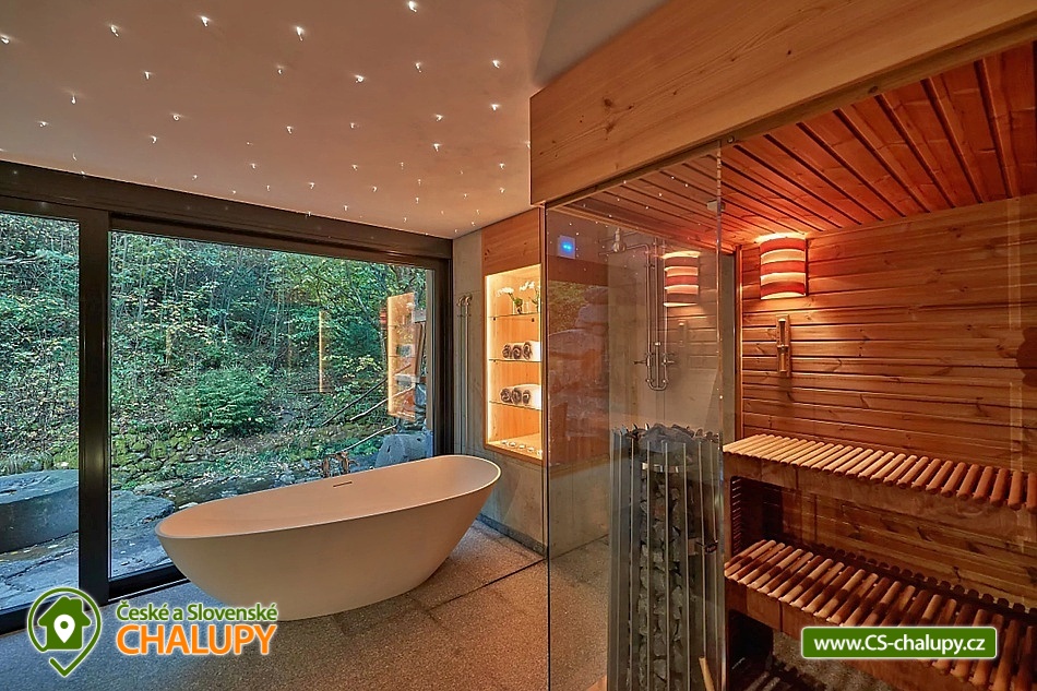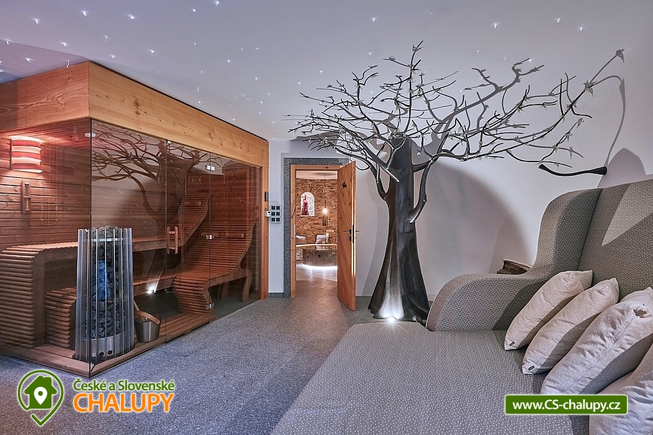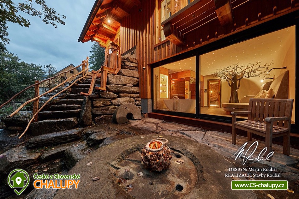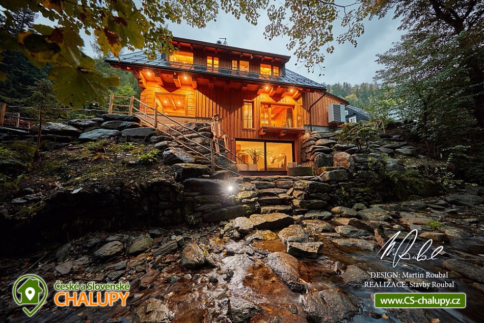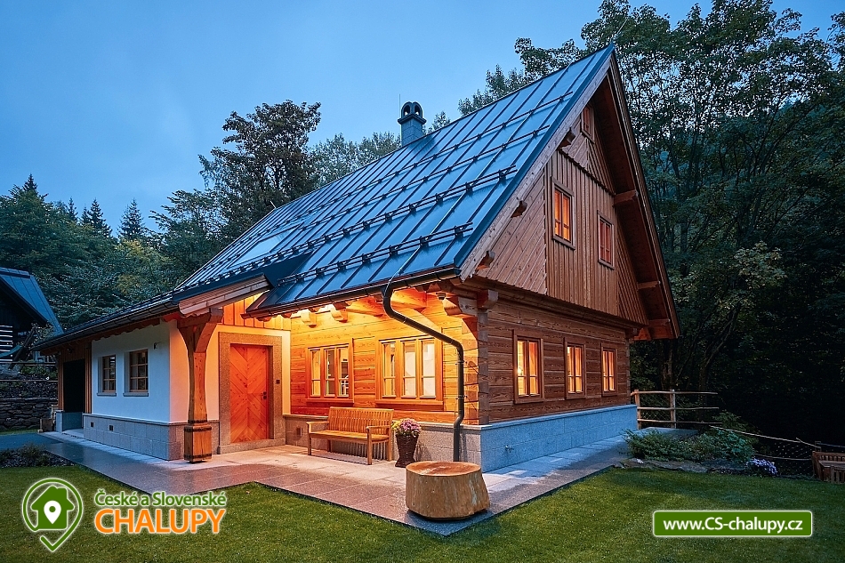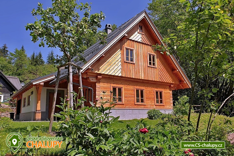 Mimořádný zážitek - Nadstandardně vybavená luxusní Wellness chalupa Krkonoše - roubená chalupa se saunou, vyhřívaným koupacím sudem a kachlovými kamny se nachází pod Černou horou nedaleko janských Lázní, středisko Černý důl v okrese Trutnov. Kapacita chalupy je až 12 osob ve 4 ložnicích. V chalupě jsou k dispozici dva 4-lůžkové apartmány a dva 2-lůžkové pokoje. Roubenka je postavena z jehličnatého stromu - borovice douglasky, je v moderním čistém stylu a tudíž má větší prosklená okna, než je zvykem u klasických roubenek. Díky nim Vám poskytne nádherný výhled do korun stromů. Interiér chalupy je v moderním provedení za použití materiálů žuly, skla a železa. Chvíle pohody Vám zpříjemní kachlová kamna a sauna s venkovním koupacím sudem. Součástí roubenky je i vinný sklípek. Příjemný pocit z relaxace navodí svým celodenním příjemným šumem i blízký horský potok. Okolní příroda vybízí k turistice a cykloturistice, v zimě jsou zde ideální podmínky pro lyžování. Poloha chalupy zaručuje romantické ubytování uprostřed krásné krkonošské přírody. Turisté zde najdou mnoho zajímavých turistických cílů, okolí je hustě protkáno značenými trasami vedoucími např. rozhlednu na Černé hoře, ze které se Vám naskytne nádherný pohled na panorama Krkonoš, Jeseníky, Orlické hory, Českomoravskou vrchovinu, dominanty Českého ráje i krajinu v sousedním Polsku. Další Vaše kroky můžou vést na nejvyšší horu Krkonoš Sněžku, kam se necháte vyvézt lanovkou nebo vyšlápnete pěšky. Za výlet stojí zajisté i návštěva horských středisek Pec pod Sněžkou a Janské Lázně i nedaleké město Vrchlabí, které vás okouzlí svým renesančním zámkem.
