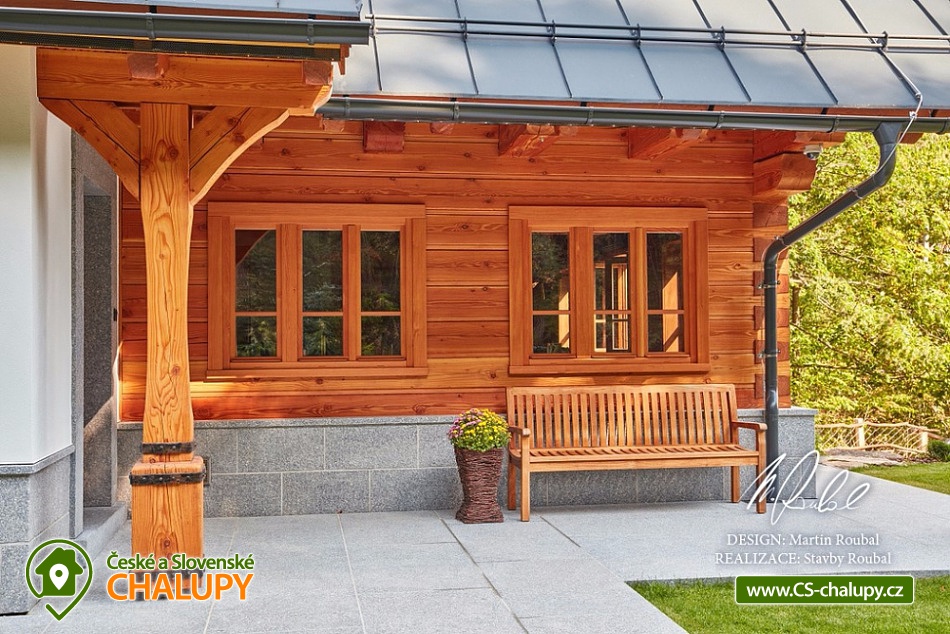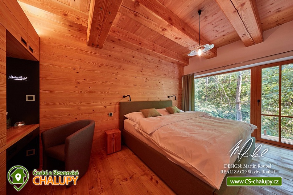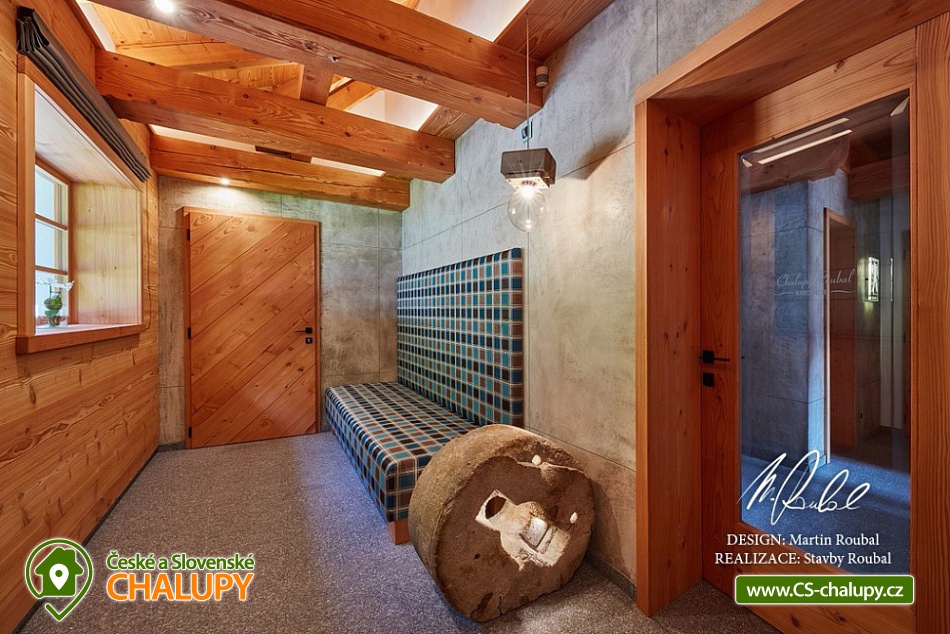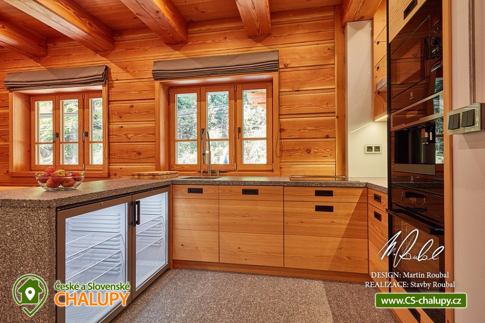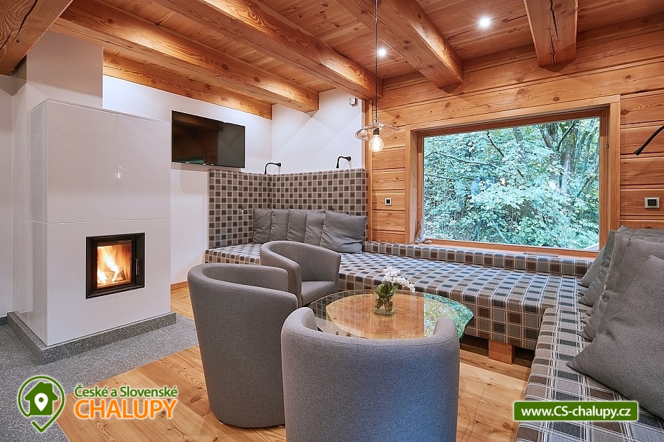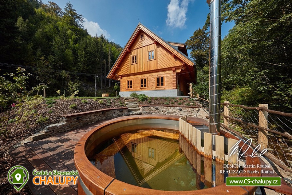 „Designová roubenka s kachlovými kamny, saunou a koupacím sudem“