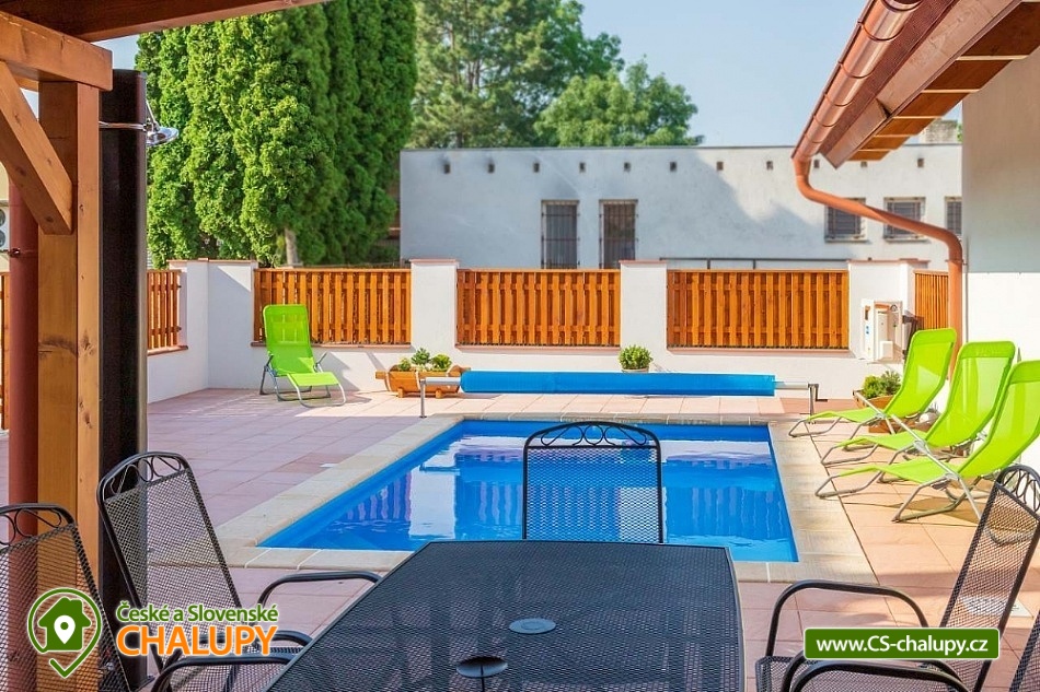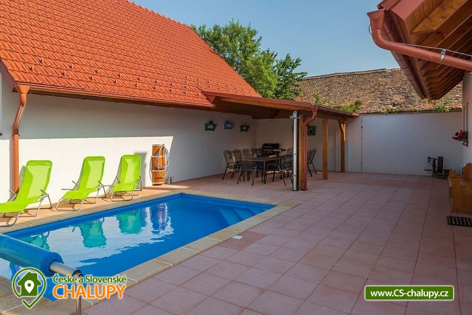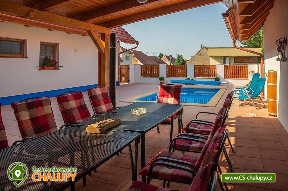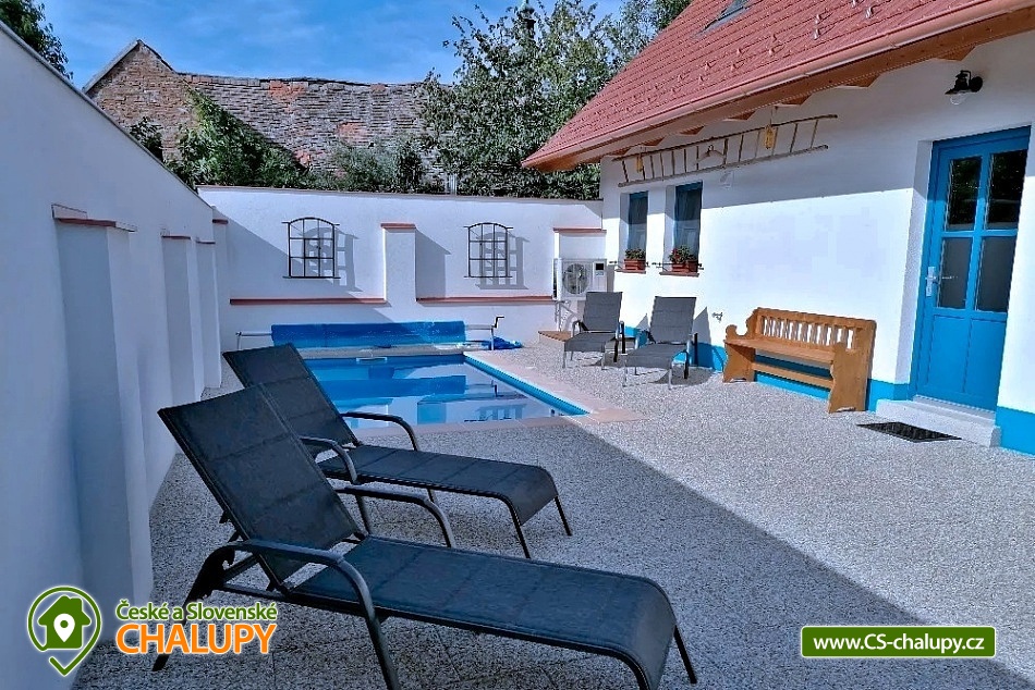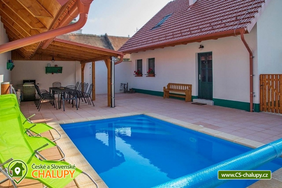 Chalupa s vyhřívaným bazénem pod Pálavskými vrchy u Novomlýnské nádrže - CHKO Pálava. Chalupa je zařízená ve venkovském stylu, klimatizována a s venkovním bazénem 5 x 3 m, který je vyhřívaný tepelným čerpadlem. V chalupě s kapacitou až 13 osob jsou 3 samostatné pokoje (4+1,4,4) každý pokoj je s vlastním sociálním zařízením (WC, sprchový kout) a TV. Kapacitu je možné rozšířit o dalších 13 osob v naší sousední chalupě 1M-187. Společenská místnost je s jídelnou a vybavenou kuchyní: myčka, mikrovlnná trouba, lednice s mrazákem, horkovzdušná trouba, kávovar Nespresso, rychlovarná konvice, pračka a vinotéka. Ve společenské místnosti jsou vnitřní krbová kamna, která zajišťují vytápění celého objektu a v každém pokoji je navíc el. topení. Chalupa má kryté venkovní posezení (pergola 6x5m) s možností grilování. Ze dvora (rozměr 16x9m) je přístup do kuchyně a společenské místnosti. V celém objektu i na dvoře je přístupná WI-FI. Chalupa je vhodná i pro rodiny s dětmi. Přítluky jsou malou vinařskou obcí. Čeká vás tady několik sklepů pro večerní koštování, vinic jsou kolem širé lány a víno nám šmakuje jako na celé Pálavě. Místní poklidný ráz je stvořený pro dovolenou. V blízkosti se nachází Novomlýnské nádrže, Lednicko - Valtický areál, Pálavské vrchy, známé vinařské obce Velké Pavlovice, Zaječí, Rakvice, Velké Bílovice, Pavlov, Bulhary, Horní Věstonice, Dolní Věstonice atd., které jsou navzájem propojené cyklistickými stezkami a kde je možnost navštívit velké množství vinných sklepů a rodinných vinařství a sjednat i řízenou degustaci vín.
