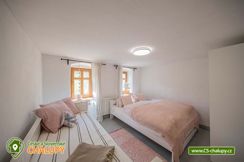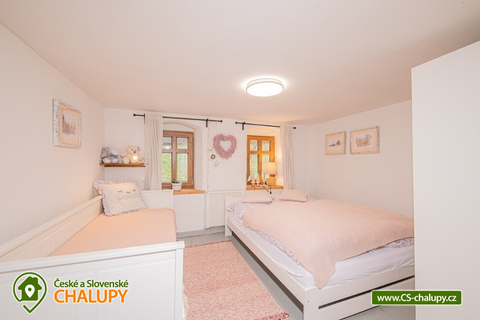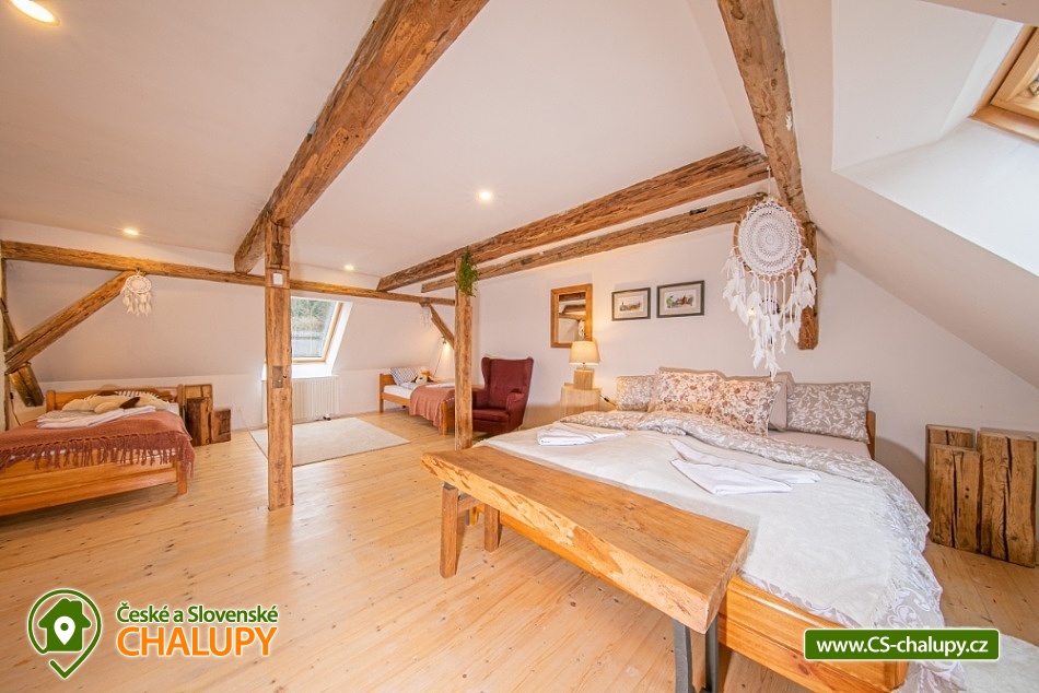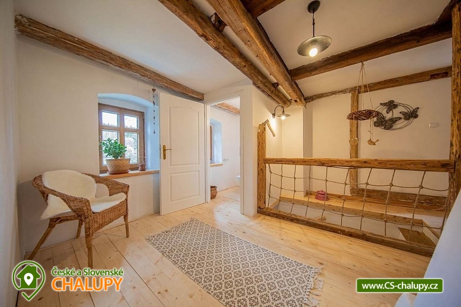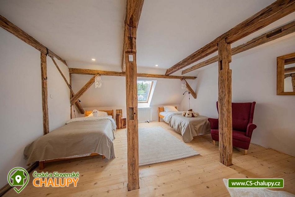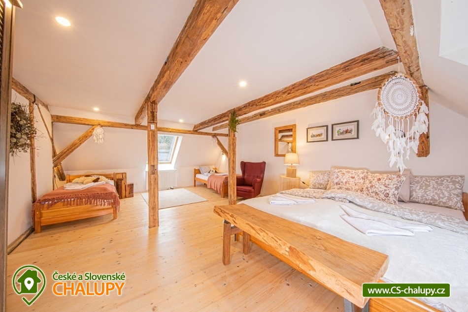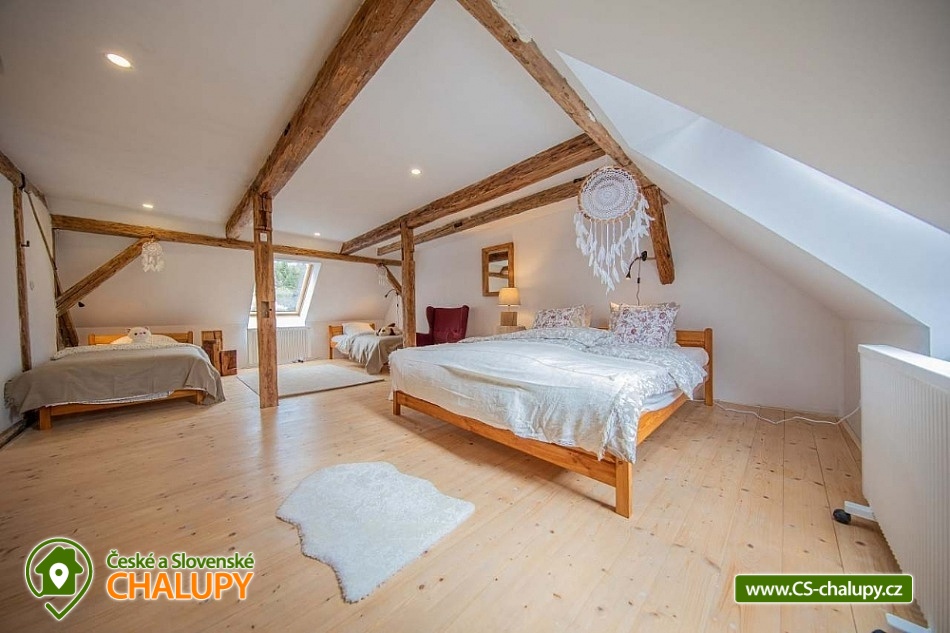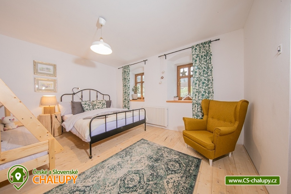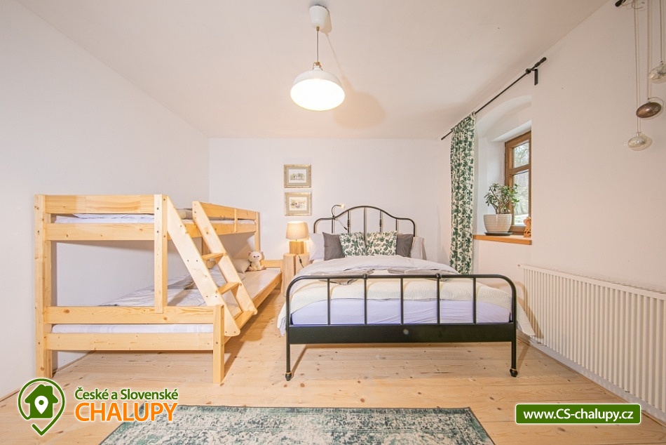 Komfortní chalupa se saunou se nachází 15 km od Karlovy Studánky, která je považována za místo s nejčistším ovzduším v České republice. Chalupa v osadě Skrbovice prošla kompletní rekonstrukcí. Nabízíme Vám útulné ubytování s kapacitou až 12 lůžek, ideální pro rodiny s dětmi. V chalupě jsou k dispozici tři ložnice - každá s kapacitou 4 lůžek. V přízemí chalupy se nachází velkorysá společenská místnost, která je vybavena moderní kuchyní, velkým jídelním stolem, sedačkou a televizí. Na tuto místnost navazuje větší veranda. V přízemí je rovněž jeden pokoj pro 4 - 5 osob (patrová postel) a velká moderní koupelna vybavena jak sprchovým koutem, tak pohodlnou vanou určenou nejen pro relaxaci. Z chodby po původním schodišti vystoupáme do podkroví chalupy, kde se nachází další dva pokoje. Jeden větší, pro 4 osoby, druhý menší, rovněž pro 4 osoby s rozkládací postelí. V patře se také nachází druhá toaleta s malým umyvadlem. Pro hospodyňky: myčka s tabletami, lednička s mrazákem, mikrovlnná trouba, elektrická trouba, sklokeramická deska, presso na zrnkovou kávu (k dispozici 1kg kávy), kompletní vybavení nádobím a základním kořením. Kuchyň je taktéž vybavena jarem, houbičkou na nádobí a utěrkami. Pro maminky: možnost dětské cestovní postýlky, krmící židličky, dětská jídelní sada, vanička, nočník (prosíme o upozornění předem). Pro děti je k dispozici dětský koutek ve společenské místnosti s dřevěnými hračkami. V chalupě je elektrické vytápění, parkování je u objektu a je pod dohledem kamer. Chalupa leží přímo na cyklostezce, kromě romantických procházek po okolí a sběru lesních plodů a hub se Vám proto nabízejí i vzdálenější místa na probádání. Určitě si u nás vyzkoušejte i "den bez auta" - jen 2 km od nás je vlaková zastávka Skrbovice. Výlet vlakem bude jedinečným zážitkem nejen pro děti, ale i dospělé. Fanoušci památek si přijdou na své prohlídkou muzea a zámku Bruntál. Horké letní dny strávíte ideálně u vody - Koupaliště Bruntál, Rybník Andělská Hora, Vodní nádrž Slezská Harta atd. Lyžaři a snowboardisté si zase zamilují zasněžené svahy středisek Ski Annaberg, Arena Vrbno, Vleku Vraclávek, Ski areálu Ludvíkov, Čerťák a mnoha dalších.