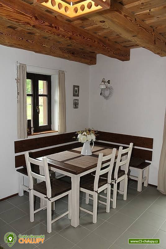 Chalupa s bazénem a saunou Zlaté Hory - Horní Údolí - Rejvíz. Chalupa na prosluněném pozemku v malebné vesničce Horní Údolí v Jeseníkách. Sedm kilometrů od pověstmi opředeného Rejvízu a stejnou vzdálenost od prvního obchodu v městečku Zlaté Hory. Chalupa poskytuje ubytování pro až 9 osob ve 3 ložnicích: pro 2, 3 a 4 osoby. V největší z nich lze před spaním sledovat i televizi. V ložnicích jsou úložné prostory pro vaše oblečení. Po dohodě vám klasické polštáře vyměníme za anatomicky tvarované a pro vaše nejmenší doplníme cestovní postýlku. Srdce chalupy - tak přesně tady, v srdci naší chalupy, se můžete všichni setkávat. Těšit se vůní připravovaného jídla a pití a společně vše ochutnávat u jídelního stolu, sledovat film v televizi, či uklidňující plamen v krbu, lenošit s knížkou v ruce, hrát hry, no prostě vše, co vám udělá radost. Koupelna v horním patře nabízí klasický standard pro hygienu. Příjemná vyhřívaná podlaha, prostorný sprchový kout a jako bonus nádherný výhled z okna na blízký les a třeba i pasoucí se ovečky. Vytápění v naší chalupě je výkonnou krbovou vložkou s výměníkem. Celé spodní patro je navíc vytápěné do podlahy. V podkroví jsou radiátory, které jsou také napojeny na krb. Pokud by jste si nechtěli topit sami v krbu, lze zapnout elektrokotel. U chalupy je venkovní posezení s krbem a dětské hřiště - trampolína, domeček s klouzačkou, houpačky, šipky, badminton, míče, líný tenis, dětské pískoviště se spoustou hraček, ale i houpací síť pro dva. Lenošárna: v příjemné a útulné místnosti můžete relaxovat nejenom po sauně. Relaxační lehátka nabídnou pohodlí i při poslechu hudby či čtení. Ale jsou samozřejmě nedělitelnou součástí saunování ve finské sauně pro 4 osoby. K dispozici je ochlazovací vědro ve velikém sprchovém koutě a východ přímo na terasu, na čerstvý vzduch. Stejně jako celé spodní patro chalupy, má i lenošárna vyhřívanou podlahu. Procházky lesem, výlety za zajímavostmi okolí, za kterými stojí za to se vracet i několikrát, cyklistické a běžecké tratě, ve kterých se najde každý, rodinné lyžařské vleky v blízkém okolí; veřejné wellness, dvě bowlingové dráhy, hřiště na tenis i fotbálek ve vedlejší vesničce Dolní Údolí. V blízkém i vzdálenějším okolí najdete řadu turisticky zajímavých míst. Například Zlatorudné mlýny s naučnou stezkou „Údolí ztracených štol“ (7 km), rozhlednu na Biskupské kupě (15 km), poutní místo Panny Marie Pomocné (12 km) či Rejvíz s naučnou stezkou k Mechovému jezírku (8 km).