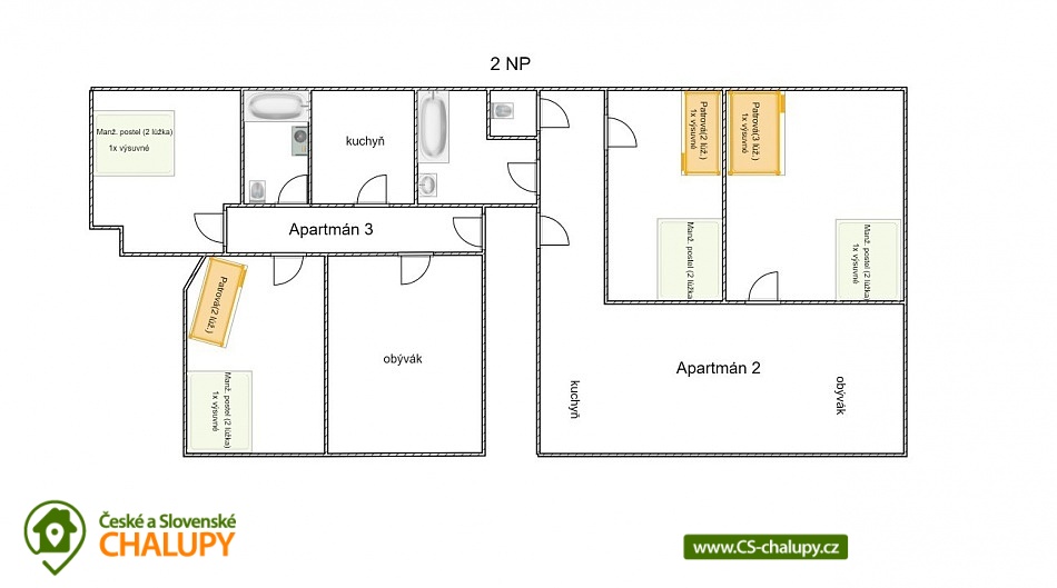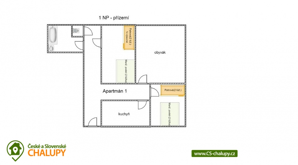 - 6 ložnic: 1x 4+2, 2x 4+1, 2x 4, 1x 2+2