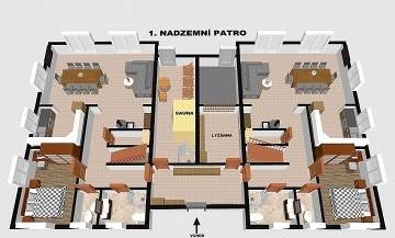 Chalupa Fun a Relax s vířivkou u areálu Bukovka a obce Mlýnický Dvůr, která je součástí obce Červená Voda. Areál Bukovka se nachází se v Přírodním parku Suchý Vrch - Buková Hora v Orlických horách. Chalupa je postavena s respektem k životnímu prostředí. Je nízkoenergetická, vytápěná tepelným čerpadlem s vysokou účinností, rekuperací vzduchu, kvalitně zateplená a okna mají trojsklo. Veškeré spotřebiče v domě jsou třídy A a o světelnou pohodu se stará úsporné LED osvětlení. Dešťovou vodu recyklujeme k zalévání zahrady. Nabízíme 2 apartmány o celkové kapacitě max. 20 osob. K dispozici je Vám: Prostorná terasa s grilem, posezením a výhledem do krajiny, Dětské hřiště na zahradě, Vířivka s výhledem do údolí pro každý apartmán, Zastřešená kolárna, Elektrická přípojka vedle parkovacích míst, kde si můžete dobýt svůj elektromobil, Prostorná oplocená zahrada. Nadstandardně vybavená chalupa je rozdělena na dvě zcela samostatné části - apartmány Fun a Relax. Do těchto apartmánů je vstup ze společné chodby, na kterou navazuje společná lyžárna. Ve druhém nadzemním patře je prostorná herna, ve které lze odemknout spojovací dveře a oba apartmány takto propojit. Každý apartmán je tvořen: čtyřmi ložnicemi, třemi koupelnami, prostorným obývacím pokojem a plně vybavenou kuchyní. Apartmá RELAX má domácí finskou saunu pro 5 osob s odpočívárnou. Apartmá FUN má k dispozici prostornou hernu o rozloze 45 m2 vybavenou pingpongovým stolem, televizi s úhlopříčkou 164 cm a šipkami. V herně je k dispozici herní konzole Xbox 2020. Hernu lze během pár minut přeměnit na konferenční místnost pro 20 osob! Rozkládací stoly a židle jsou k dispozici ve vestavné skříni přímo v herně. Herna je také vybavená malou kuchyňkou. Apartmán Relax (1 - 10 osob) se 4 ložnicemi, 3 x dvoulůžkový pokoj, 1 x rodinný pokoj se 4 lůžky, 3 x koupelna s toaletou, 1 x samostatný záchod, kuchyň, obývací pokoj s krbovými kamny, finská sauna, lyžárna. Ložnice ve spodním patře je bezbariérová. Apartmán FUN (1 - 10 osob) se 4 ložnicemi, 3 x dvoulůžkový pokoj, 1 x rodinný pokoj se 4 lůžky, 3 x koupelna s toaletou, 1 x samostatný záchod, kuchyň, obývací pokoj s krbovými kamny, prostorná herma, lyžárna. Ložnice ve spodním patře je bezbariérová. Vybavení - Kuchyně: myčka nádobí, indukční varná deska, elektrická trouba, digestoř (vše Bosch A+). Prostorná lednice a mrazákem. Kávovar Krups na kapsle Nespresso. Varná konvice. Multifunkční ruční mixér. Kompletní vybavení příbory, talíři, skleničkami, hrnce…, Vinotéka, Pračka Hoover 13 kg prádla, sušák na prádlo. Žehlící prkno, žehlička. Televize s uhlopříčkou 164 cm připojená na Internet je umístěna v obývacím pokoji. Krbová kamna s prosklenými dvířky, v luxusním provedení, s obložením přírodním pískovcem. Lyžárna se sušákem na boty je umístněná u společného vchodu a slouží oběma apartmánům. Vytápění: Podlahové vytápění tepelným čerpadlem, krbová kamna, rekuperace vzduchu. Parkování je bezplatné na čtyřech parkovacích místech přímo u chalupy. Pokud potřebujete větší kapacitu na parkování, je možno využít bezplatné parkoviště Ski areálu vzdálené cca 150 m. V lyžařském areálu se nachází i snowpark, lyžařská a snowboardová škola, lyžařská školka, půjčovna lyží a snowboardů. Jsou zde i desítky kilometrů strojově upravovaných běžeckých tratí v oblasti Buková hora, Červenovodské sedlo, Suchý vrch,... Jaro, léto a podzim lze využít pro pěší turistiku, cykloturistiku a výlety po okolí. Těšíme se na Vás u nás.