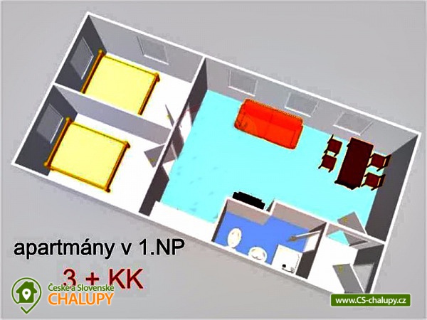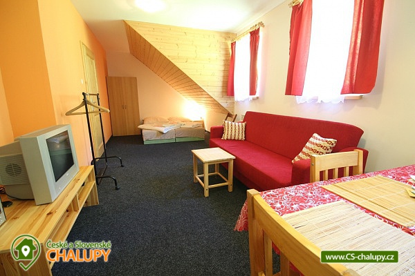 Chalupa Churáňov nedaleko lokality Mechová jezírka na Šumavě, poloha nedaleko střediska Zadov v okrese Prachatice. Je Vám k dispozici celkem 7 apartmánů (2x 4 lůžka + 5x 5 lůžek). V každém z apartmánů naleznete kuchyňský kout vybavený el. dvouplotýnkovým vařičem, ledničkou, mikrovlnnou troubou a nádobím, obývací pokoj s TV a koupelnu se sprchovým koutem, umyvadlo a WC. Dva shodné apartmány nacházející se v přízemí mají každý dvě ložnice (2+2 lůžka), další 2 totožné apartmány v přízemí mají každý 2 ložnice (2+3 lůžka) a 3 stejné apartmány v patře mají každý jednu 3-lůžkovou ložnici a 2 lůžka v obývacím pokoji. Objekt není vhodný pro větší skupiny, protože v objektu není žádná společenská místnost, pouze jednotlivé apartmány. Objekt je vytápěn elektrickými přímotopnými panely, v celém objektu je k dispozici Wi-Fi internet. Příjemné posezení poskytuje v létě prostorná venkovní terasa nebo pergola s krbem - možnost grilování. U apartmánů je taktéž zahradní domek na úschovu kočárku, kol a lyží, a také ohniště a venkovní posezení. Apartmány jsou celoročně dobře dostupné po silnici, která vede u objektu a zaručí Vám bezproblémový příjezd i v zimních měsících. Součástí objektu je i 1 další neobývaný technický apartmán využívaný správcem. Okolí objektu je vhodné pro turistiku, cykloturistiku, houbaření i lyžování. V okolí chalupy doporučujeme navštívit krásnou přírodu CHKO Šumava. Hustě značená síť turistických tras i cyklostezek Vás zavede do známých turistických center jako je např. údolí řeky Vydry, Horská Kvilda, Jezerní slať nebo Zadov. Nedaleko naleznete i rozhlednu Churáňov, která se nachází se na vrcholku bývalého skokanského můstku a v rámci rekonstrukce zde byla na jihozápadní straně věže vybudována i lezecká stěna. Za návštěvu stojí historické město Vimperk se svým opevněním, zámkem a středověkými domy na náměstí. Milovníci historie si přijdou na své i na gotickém hradě Kašperk, který nabízí krásný výhled do okolí. Velmi zajímavý je i výlet přes Kvildu a Bučinu do Německa - skanzenu zemědělských usedlostí ve Finsterau.
