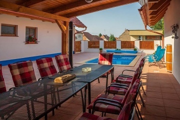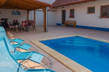 Chalupa s vyhřívaným bazénem v obci Přítluky - Pálava - jižní Morava. Chalupa je zařízená ve venkovském stylu s klimatizací a venkovním bazénem 5 x 3 m, který je vyhřívaný tepelným čerpadlem. Chalupa je vhodná i pro rodiny s dětmi. Přítluky jsou malou vinařskou obcí. Čeká vás tady několik sklepů pro večerní koštování, vinic jsou kolem širé lány a víno nám šmakuje jako na celé Pálavě. Místní poklidný ráz je stvořený pro dovolenou. V chalupě pro až 13 osob jsou 3 samostatné pokoje (4+1,4, 4 lůžka), každý pokoj je s vlastním sociálním zařízením (WC, sprchový kout) a TV. Společenská místnost je s jídelnou a vybavenou kuchyní: myčka, mikrovlnná trouba, lednice s mrazákem, horkovzdušná trouba, kávovar Nespresso, rychlovarná konvice, pračka a vinotéka. Ve společenské místnosti jsou vnitřní krbová kamna, která zajišťují vytápění celého objektu a v každém pokoji je navíc el. topení. Chalupa má kryté venkovní posezení (pergola 6x5m) s možností grilování. Ze dvora (rozměr 16x9m) je přístup do kuchyně a společ. místnosti. V celém objektu i na dvoře je přístupná WI-FI. Kapacitu je možné rozšířit o dalších 13 osob v naší sousední chalupě 1M-188. V blízkosti se nachází Novomlýnské nádrže, Lednicko - Valtický areál, Pálavské vrchy, známé vinařské obce Velké Pavlovice, Zaječí, Rakvice, Velké Bílovice, Pavlov, Bulhary, Horní Věstonice, Dolní Věstonice atd., které jsou navzájem propojené cyklistickými stezkami a kde je možnost navštívit velké množství vinných sklepů a rodinných vinařství, kde je možné sjednat i řízenou degustaci vín.