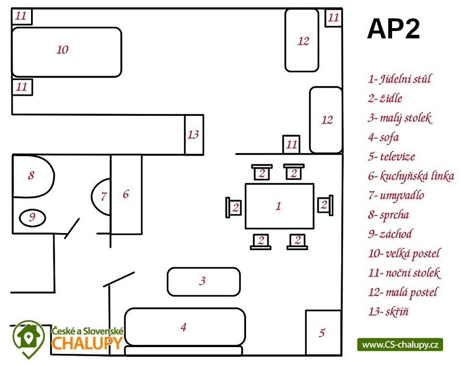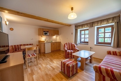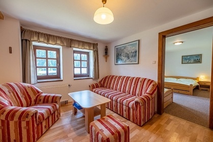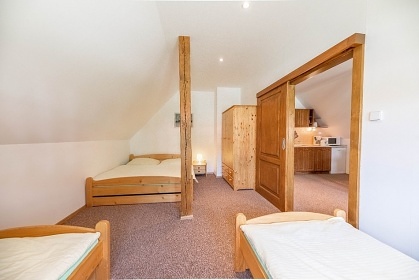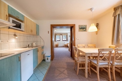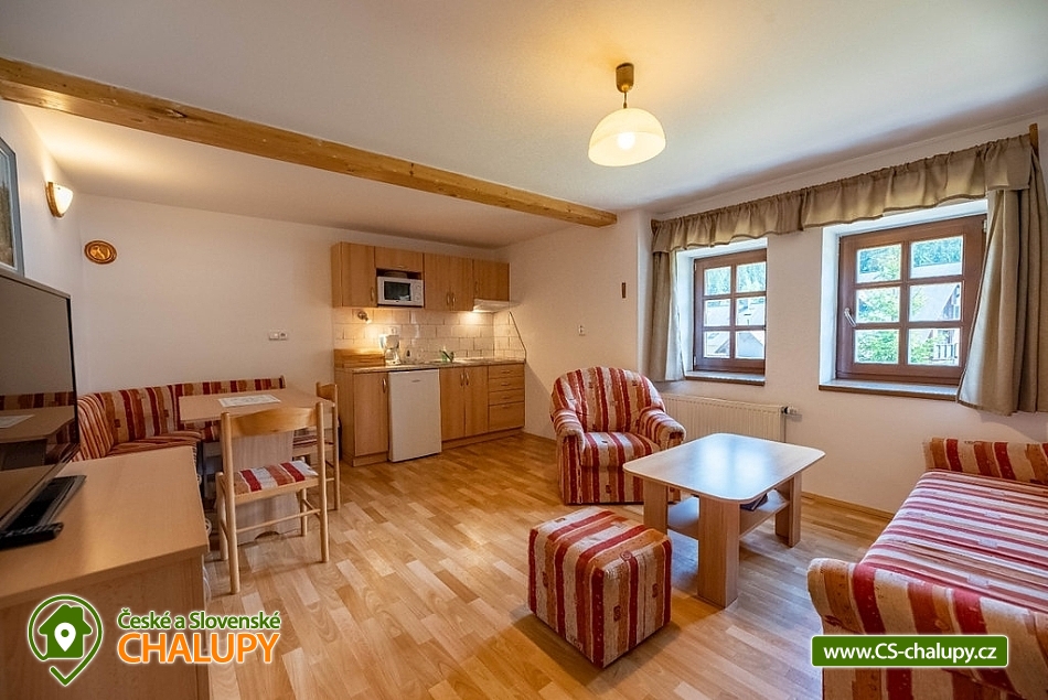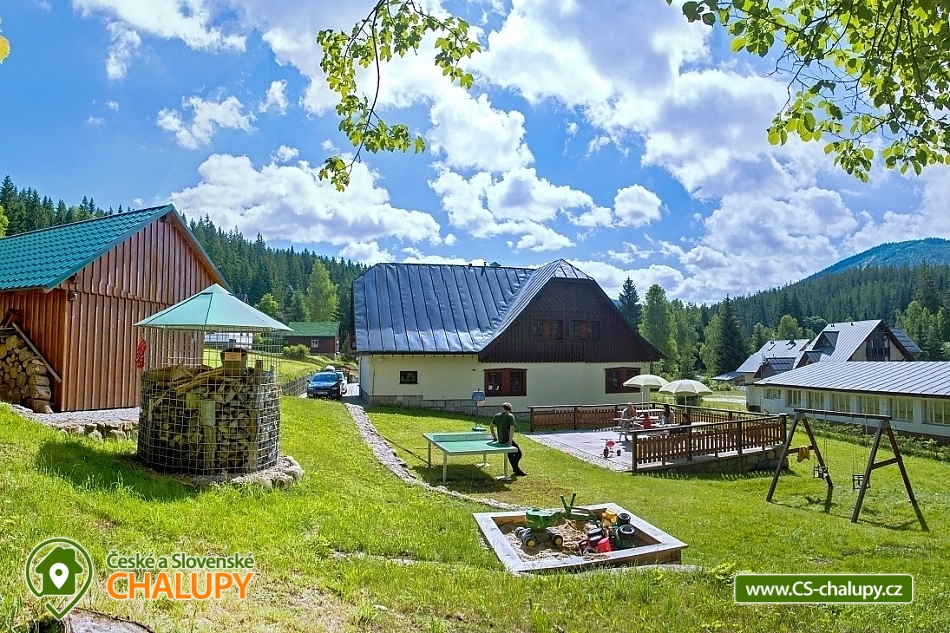 Prostorná nadstandardně vybavená chalupa přímo v srdci Krkonoš - v Harrachově. Harrachov leží v údolí řeky Mumlavy (Mumlavský vodopád) v západní části Krkonoš. Objekt lze pronajmout jako celek (preferujeme pronájem celé chalupy 1 skupině klientů) nebo po jednotlivých apartmánech. Chalupa má kapacitu 22 lůžek a 6 přistýlek. POPIS: Apartmán 1 (manželská postel, dvě samostatná lůžka), Apartmán 2 (manželské postel, dvě samostatná lůžka, patrová postel), Apartmán 3 (manželská postel, dvě samostatná lůžka, dvě přistýlky na gauči), Apartmán 4 (manželská postel, dvě samostatná lůžka, dvě přistýlky na gauči) a Apartmán 5 (studio s manželskou postelí, palandou, dvěma přistýlkami na gauči). V letní sezóně k dispozici venkovní gril, stolní tenis, ohniště, pro děti trampolína, houpačky, pískoviště a venkovní posezení. V každém apartmánu je k dispozici WiFi připojení na internet. Součástí každého AP je koupelna (umyvadlo, sprchový kout, toaleta, ručníky) a obytná kuchyň (keramická varná deska, mikrovlnná trouba, rychlovarná konvice, lednička, kávovar, jídelní sezení, gauč, satelitní televize). Apartmán 3 je možné využít jako společenskou místnost. V objektu se nachází úschovna na lyže a kola. Okolí nabízí množství turistických atrakcí. Mezi nejoblíbenější patří lanovka na Čertovu horu, Bobová drah Harrachov, Vertical Park Harrachov, či výlet k Mumlavskému vodopádu. Zajímavá je i návštěva Pivních lázní Harrachov či Muzea skla Harrachov. V zimě si můžete vybrat z množství lyžařských středisek. Blízko našich apartmánů je Skiareál Hilbert, Skiareál Harrachov či Ski Resort Harrachov - Amálka. Z Harrachova také můžete podnikat zajímavé výlety do sousedních Jizerských hor a do polské části Krkonoš. Těšíme se na Vás u nás.