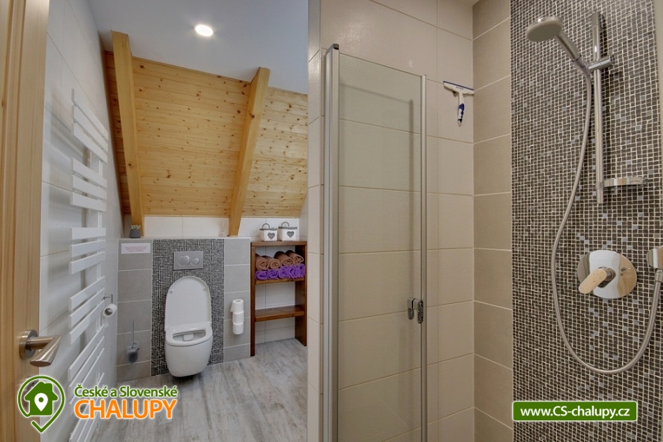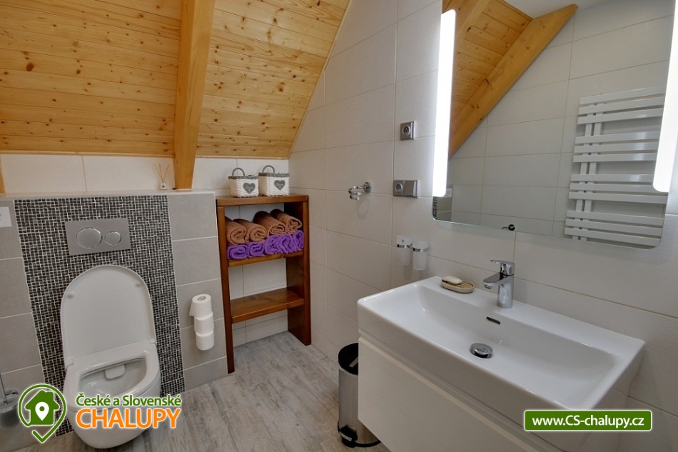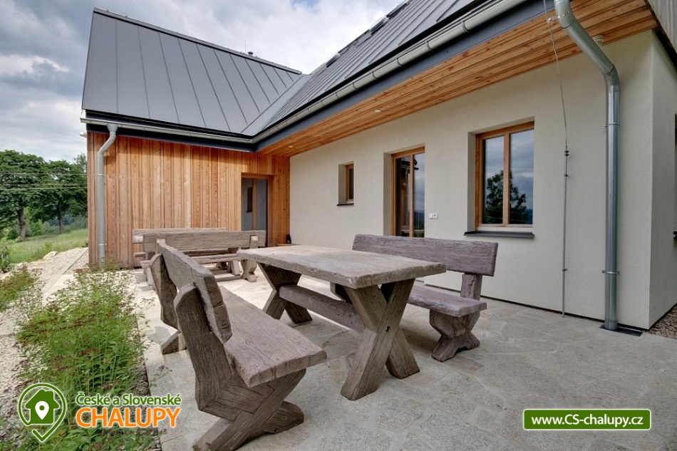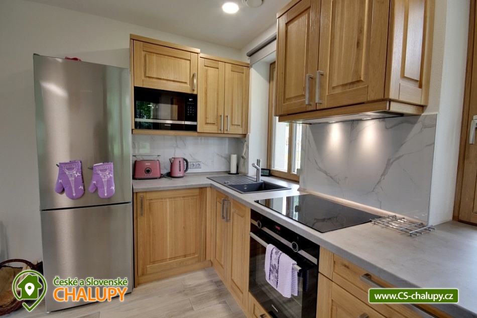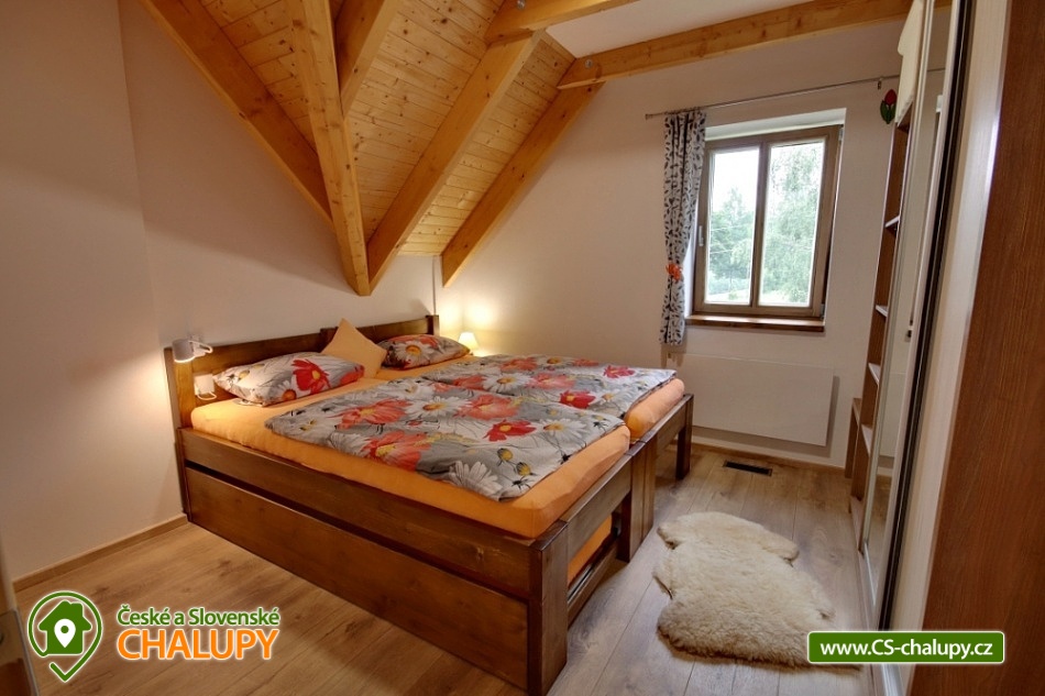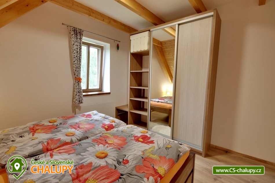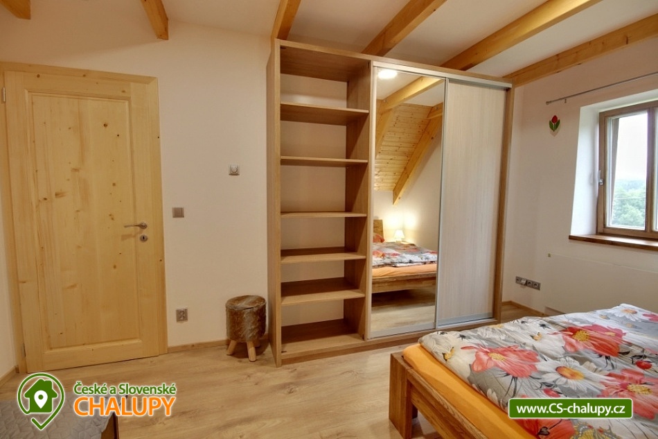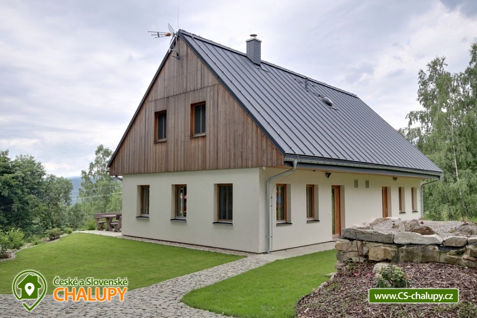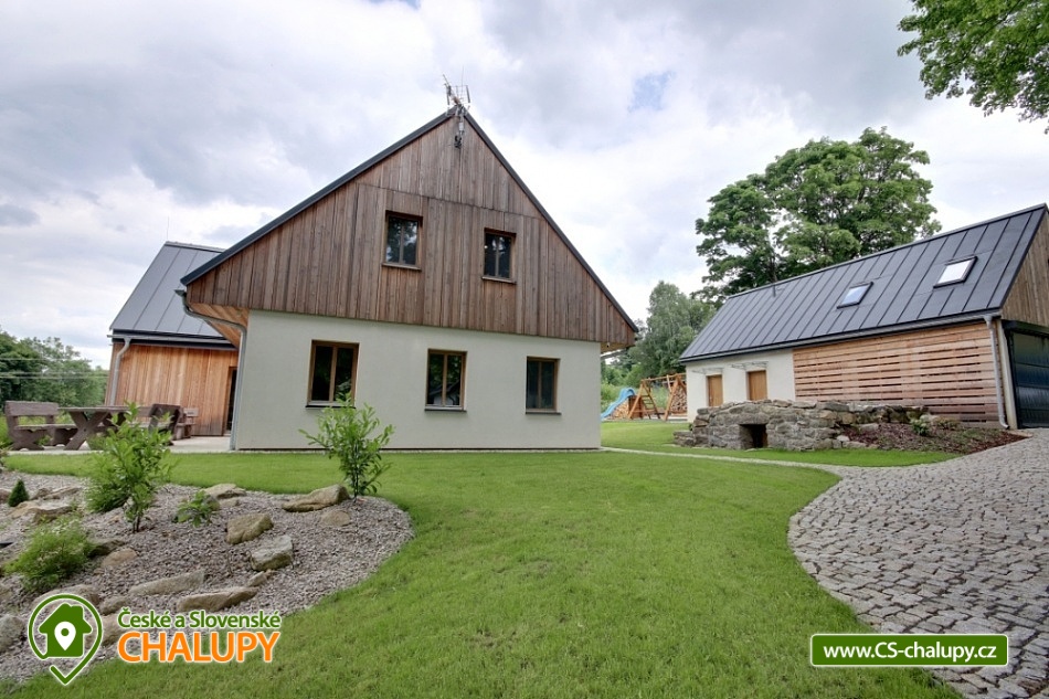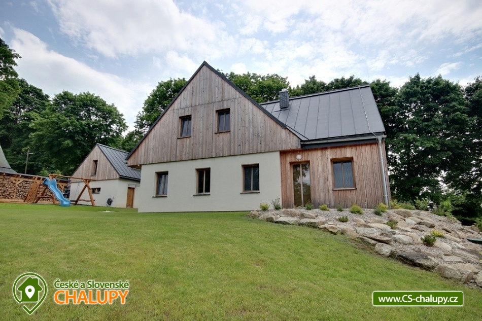 Chalupa v CHKO Jizerské hory - Vyhlídková cesta u obce Kořenov a Příchovice na místě, kde stála původní stará chalupa z filmu Obsluhoval jsem anglického krále. Jedná se o zděnou novostavbu v nadmořské výšce cca 700 m na krásném klidném místě. Uvnitř chalupy jsou dva nadstandardně vybavené apartmány, jeden o kapacitě 4 + 1 osoby a druhý o kapacitě 8+1 osob. V menším apartmánu č.1 je obývák s krbovými kamny, výstupem na terasu a plně vybavenou kuchyní (myčka, elektrická trouba, mikrovlnná trouba, varná deska, rychlovarná konvice, lednice s mrazákem, kávovar, topinkovač...), koupelna se sprchovým koutem a samostatná toaleta. V patře dva prostorné dvoulůžkové pokoje, šatna a toaleta. Ve větším apartmánu č.2 je v přízemí prostorný obývací pokoj s krbem, jídelním koutem a opět plně vybavenou kuchyní , koupelna, samostatná toaleta, šatna a jeden dvoulůžkový pokoj. Z obývacího pokoje jsou přístupné dvě terasy s možností grilování /mimo zimní období/. V patře se nachází čtyřlůžkový pokoj a dvoulůžkový, s možností kvalitní přistýlky a koupelna s toaletou. Každý apartmán má svůj vlastní vchod a jsou plně oddělený. V případě pronájmu celé chalupy lze apartmány propojit jinak uzamčenými dvojitými dveřmi. Je zde příjemné venkovní posezení na terase s možností grilování (mimo zimní období). Ohniště pro milovníky opékání špekáčků se nachází na zahradě. V letních měsících je možnost přespat v Téépéé, které má dřevěnou podlážku. V celém objektu využijete Wifi připojení (omezené) , televize je vždy v obývacích pokojích. Objekt lze vytápět elektrickými přímotopy nebo krbovými kamny. U domu je parkovací stání pro několik aut. Pro bezpečné uložení kol, lyží, kočárků atd. je uzamykatelná místnost. Kolem chalupy je prostorný udržovaný trávník a okrasné jezírko se skalkou. Chalupa se nachází na polosamotě u lesa, kde si odpočinete od ruchu města pod korunami stromů, za zpěvu ptáků, šumění vody u jezírka a lze pozorovat hvězdnou oblohu nezkreslenou světly měst. Okolí Vám dává možnost výběru různých sportovních aktivit, ať už se jedná o turistiku, jízdu na kole (jsou zde i bikeparky), běžecké lyžování (blízký nástup na Jizerskou magistrálu) a sjezdové lyžování za "rohem" (Příchovice U Čápa, Tanvaldský Špičák, Harrachov). Pokud milujete klid, přírodu, pohodu u jezírka, turistiku, kolo, běžecké lyžování a sjezdovky, jste na správném místě!!!! Těšíme se na Vás u nás.