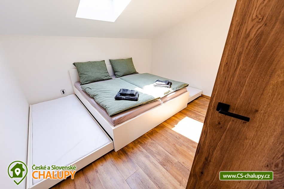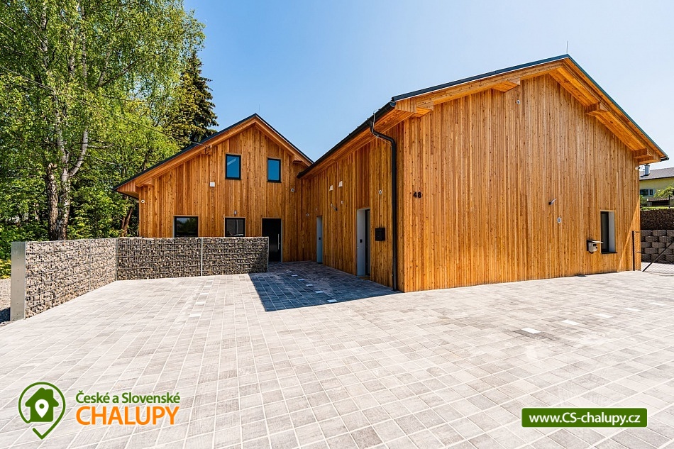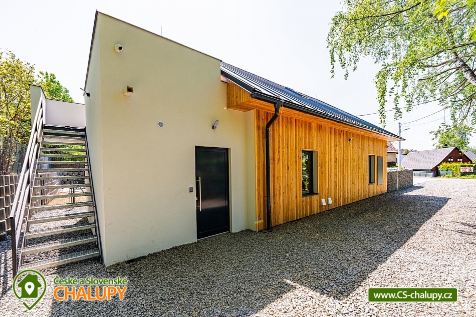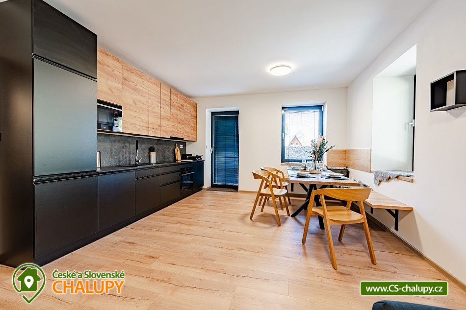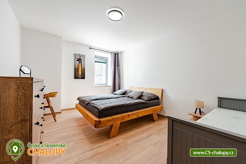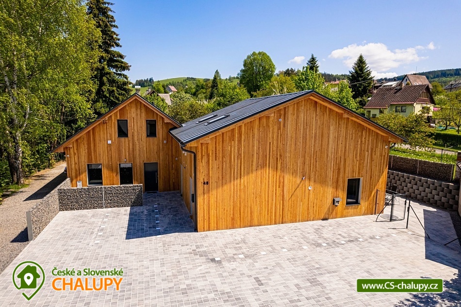 Luxusní chalupa Králický Sněžník nedaleko Dolní Moravy - Nabízíme moderní rodinné ubytování v chalupě se 3-mi apartmány (každý AP pro až 8 osob) nacházející se v podhůří Králického Sněžníku a v blízkosti vyhledávaného horského lyžařského střediska Dolní Morava. Jedná se o 3 samostatné a plně vybavené apartmány s vlastními vchody a předzahrádkami, které si můžete pronajmout samostatně, popř. celou chalupu jako celek. Každý apartmán má vlastní parkovací stání. Kromě toho máme také společnou kolárnu s lyžárnou. Apartmány je možné rezervovat samostatně v kapacitě 4 dospělí a 4 děti, případně kombinovat více apartmánů. Celková kapacita všech tří apartmánů je 24 lůžek (12x dospělí a 12 dětí). Každý apartmán má dvě samostatné ložnice vybaveny vždy po manželské posteli a přistýlkách (4x dospělí a 4x děti). V každém apartmánu je k dispozici minimálně jedna koupelna a dvě WC. Koupelny jsou vybaveny walk - in sprchovým koutem, samozřejmostí je fén. Objekt je vytápěný moderním podlahovým systémem na elektřinu. Vybavení apartmánů tvoří: kuchyňská linka s vestavnými spotřebiči (chladnička s mrazákem, velká myčka nádobí, elektrická trouba, indukční varná deska, mikrovlnka, digestoř), dalšími spotřebiče (kávovar, rychlovarná konvice, toustovač, multifunkční mixér). Veškerým vnitřním vybavením: nádobí, hrnce, příbory, pánvičky, dětské nádobí atd. K dispozici je WiFi pokrytí v celém apartmánu, smart TV s online vysíláním TV. Technická místnost je vybavena pračkou a sušičkou. Město Králíky je plně sociálně vybavené s centrem v podobě krásného náměstí v jehož okolí najdete pekárny, kavárny, restaurace a mnoho obchodů. Apartmány mají plně vybavenou kuchyň, kde si můžete připravit jídlo dle vlastních preferencí. Lokalita Kralického Sněžníku je známá velkým množstvím skiareálů v dojezdu kolem 10km. Např. Ski areál Větrný vrch, Dolní Morava, Králičák Kunčice, České Petrovice, Čenkovice, Proskil Branná, Ostružná, Přemyslov, Petříkov, Ramzová a Červenohorské sedlo. Dále upravenými běžeckými trasami a velkým množstvím cyklostezek.