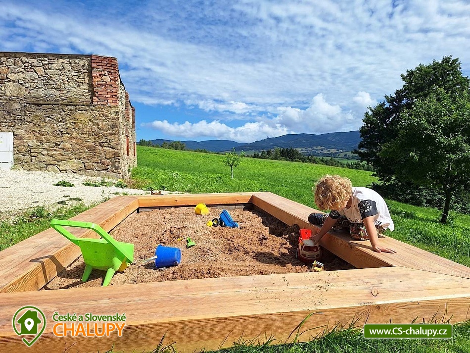 Chalupa Kralický Sněžník s vířivkou u Dolní Moravy - ubytování Jeseníky. Nabízíme k pronájmu chalupu pro až 10 osob. Chalupa nabízí nádherný panoramatický výhled na panorama Králického Sněžníku, který si můžete vychutnat přímo z vyhřívané vířivky. V přízemí chalupy je postel pro 2 osoby v obytné místnosti a v ložnici velká postel pro 3 osoby přes celý pokoj. V patře jsou 2 obytné pokoje se 2 a 3 lůžky. K dispozici je plně vybavená kuchyň spojená s velkým obývacím prostorem a televizí. Chata je vybavena i pro rodiny s dětmi: Dvířka pod schody, dětská postýlka, jídelní židlička, herní koutek, koupací vanička, nočník a dětský pisoár. V objektu je koupelna se sprchovým koutem a WC. V letní sezóně je možné přitápění krbovými kamny. V zimním období kombinace elektrokotle s podlahovým vytápěním a krbová kamna. Parkování je možné přímo u chalupy, kde je i posezení na kryté terase, ohniště a gril. Našich 9 slepic se Vám denně postarají o čerstvá vejce k snídani. Pěšky odsud dojdete k poutnímu místu s klášterem Hora Matky Boží Králíky. Po cestě se zastavíte na oblíbené rozhledně Val, odkud dohlédnete na pásmo Orlických hor, Hrubého Jeseníku i Králického Sněžníku. Ve vzdálenosti 5 kilometrů je také známý areál Dolní Morava. Nejbližší soused je ve vzdálenosti 200m. Možnost rybaření v areálu rybářské bašty Malá Morava. Pěšky lze dojít lesem na Severomoravskou chatu ve vzdálenosti 5km, kde je restaurace. Těšíme se na Vás u nás.