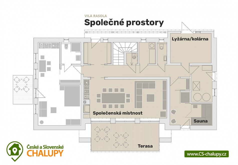 Chalupa pod Pradědem se saunou, Karlov pod Pradědem - Malá Morávka. Chalupa nabízí komfortní ubytování pro až 20 osob ve 3 apartmánech v nejkrásnějším turistickém středisku Jeseníků v obci Karlov pod Pradědem. Objekt nabízí ubytování ve 3 samostatných apartmánech pro 8 a 8 a 4 osoby - chalupu je možné si pronajmout jako celek v soukromí, stejně tak je možné se ubytovat a užít pronájmu jednotlivých apartmánů. Ve společných částech objektu, které jsou přístupné pro všechny 3 apartmány naleznete společenskou místnost a plně vybavenou kuchyňskou linku (včetně vinotéky a nabídky vín ke konzumaci). Atmosféru Vám bude zpříjemňovat vestavěný krb a možnost sledovat velkoplošnou projekci - a to jak tu televizní, tak díky celoprosklené stěně i tu reálnou v přírodě. Apartmán Sophia (6+2): apartmán s dvěma ložnicemi, obývacím pokojem a plně vybavenou kuchyní (lednice, trouba, myčka, mikrovlnná trouba), vlastní koupelnou a WC. Celková plocha apartmánu 70m². Apartmán Stela (6+2): apartmán s dvěma ložnicemi, obývacím pokojem a plně vybavenou kuchyní (lednice, trouba, myčka, mikrovlnná trouba), vlastní koupelnou a WC. Celková plocha apartmánu 70m². Apartmán Petronela (2+2): apartmán s jednou ložnicí s obývacím koutem a plně vybavenou kuchyní (lednice, trouba, mikrovlnná trouba), vlastní koupelnou a WC, samostatnou terasou. Celková plocha apartmánu 40 m². Odpočinout si a nabrat energii můžete ve finské sauně. K ochlazení Vám poslouží sprchový kout s vodopádovým efektem nebo ze sauny přímo přístupná zahrada vily plná sněhu. Lyže a kola uložíte v lyžárně/kolárně, kde si na sušácích také vysušíte vaši sportovní obuv. V létě můžete využít 2 venkovní terasy vybavené kvalitním grilem, zatímco si vaše děti budou užívat přímo před vašima očima volného pobytu v přírodě. Pokud hledáte přírodu, relax a pohodlí, už dále hledat nemusíte. Nabízíme Vám zázemí pro strávení klidné rodinné dovolené, pro pobyty přátel, turistickou základnu pro výpravy po krásách Jeseníků, stejně jako možnost organizovat oslavy nebo pracovní setkání či školení. Umístění vily je jednou z největších předností, které svým hostům Rasola nabízí. Vila leží v samotném srdci Karlova pod Pradědem, v těsné blízkosti největšího lyžařského střediska na Moravě - Ski Arény Karlov, ze kterého dojedete na lyžích až k samotné vile. Stačí u nás jen zaparkovat a auto budete znovu potřebovat až při svém odjezdu. V naší vile si budete užívat pocit soukromí a zároveň budete jen pár kroků od nejbližší lanovky, restaurace, běžkařské stopy nebo turistické trasy, lanového centra, wellness, nebo dětského hřiště.