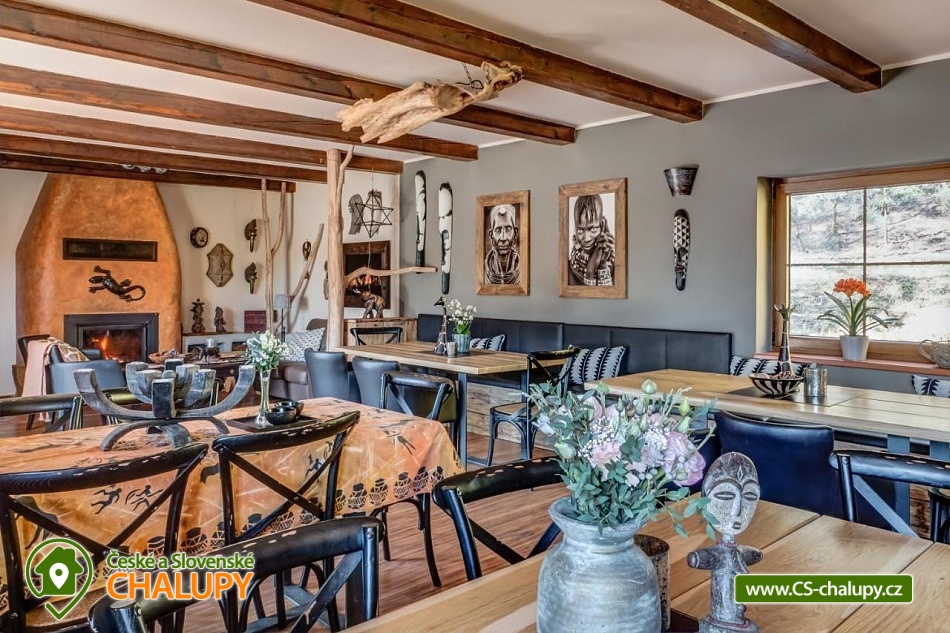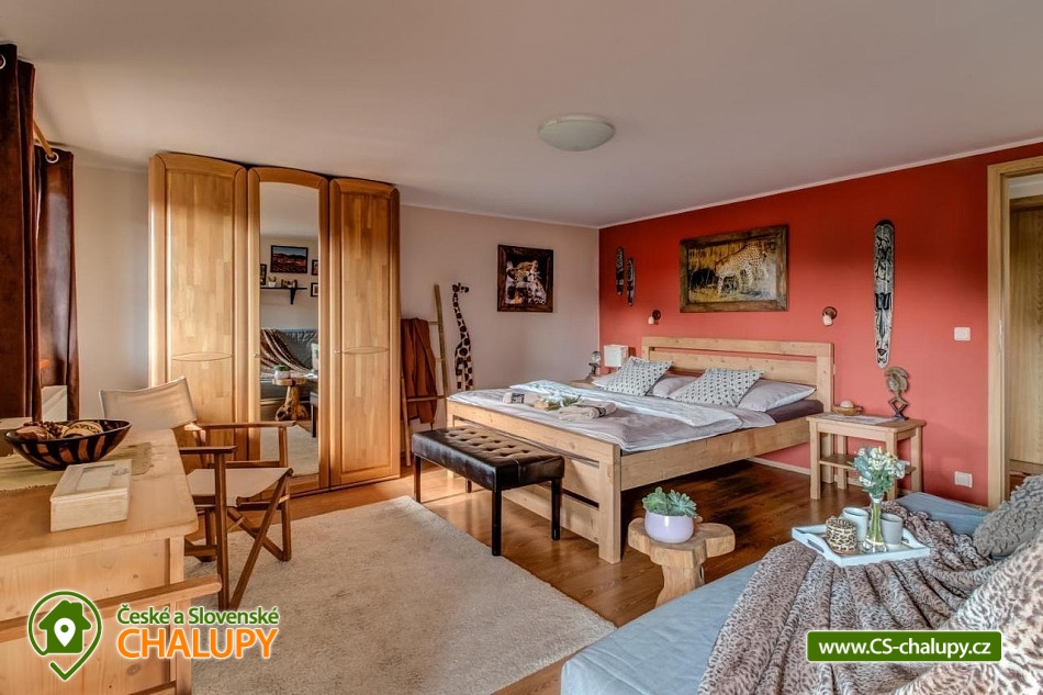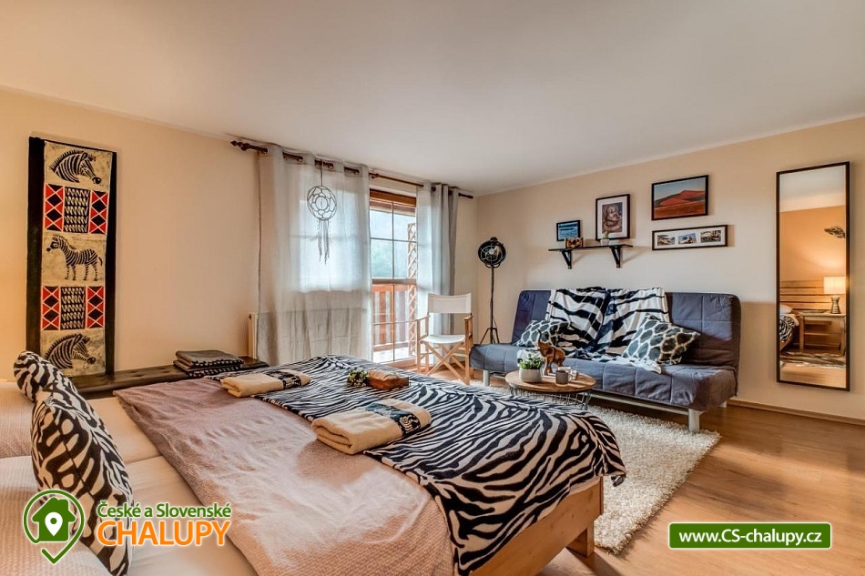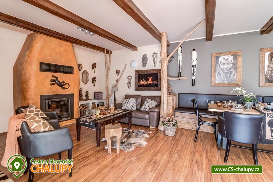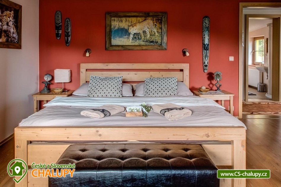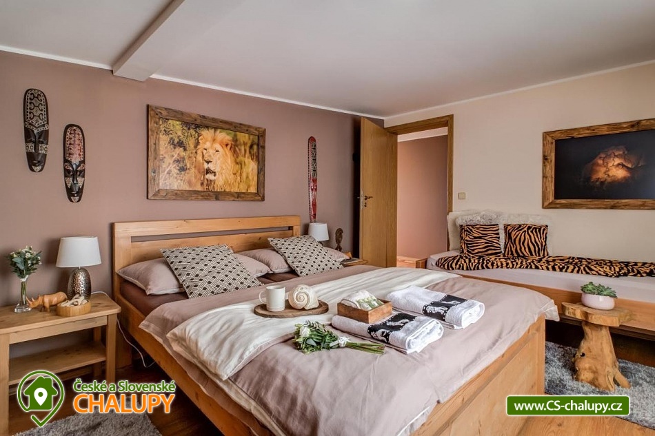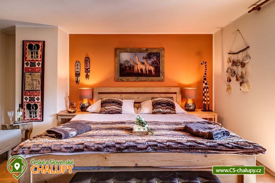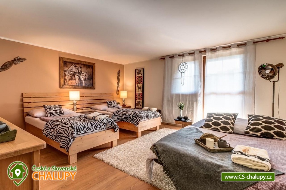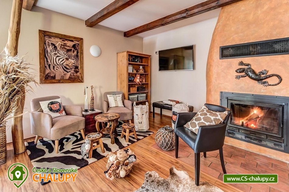 Chalupa pro rodiny s dětmi nedaleko od ZOO Zlín Lešná (druhá nejnavštěvovanější zoologická zahrada v ČR) a hradu a skal Lukov. Chalupa je kompletně vybavena v originálním africkém stylu včetně mnoha fotografií a artefaktů, které si majitelé přivezli ze svých cest po Jihoafrické republice, Mosambiku, Namibii, Botswaně, Zimbabwe, Zambii a dalších zemích afrického kontinentu. Chalupa je vzhledem ke své poloze vhodná pro rodiny s dětmi, ale i ostatní skupiny ocení velký uzavřený areál u rybníka, na okraji lesa, stranou civilizace. Chalupa k pronájmu poskytuje ubytování pro až 19 osob v 5 ložnicích. Vyberte si z pěti pokojů s motivy afrických zvířat. Tedy 4x čtyřlůžkový pokoj (Gepard, Žirafa, Zebra a Slon) plus 1x Třílůžkový pokoj (Lev). Hostům jsou k dispozici 4 koupelny, každá se sprchovým koutem a WC, nacházející se na stejném patře jako pokoje plus dvě samostatná WC ve společenské části objektu. K dispozici je plně vybavená kuchyně s velkou lednicí a myčkou nádobí, společenská místnost s krbem, WIFI a TV. U chalupy je kryté venkovní posezení, gril a ohniště na opékání, dětské a sportovní hřiště a parkování u chalupy v areálu. Budeme rádi, když si u nás uspořádáte nevšední setkání, narozeninovou oslavu, firemní večírek či nazapomenutelnou svatbu v africkém prostředí. V okolí: ZOO Zlín, Hrad a skály Lukov, Koupaliště a Lázně Kostelec, Tenisové hřiště Vršava, Větrný Mlýn Štípa, Rybník Ostrata, Dětské centrum Galaxie, Baťův kanál - rekreační vodní cesta, Baťův mrakodrap a Obuvnické muzeum Zlín. Těšíme se na Vás u nás.