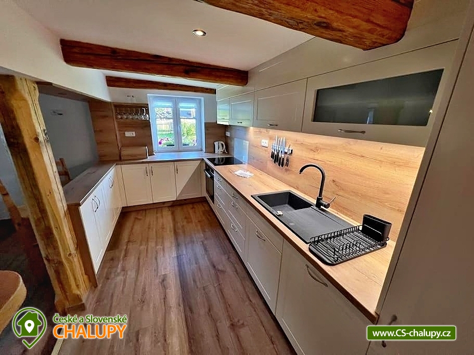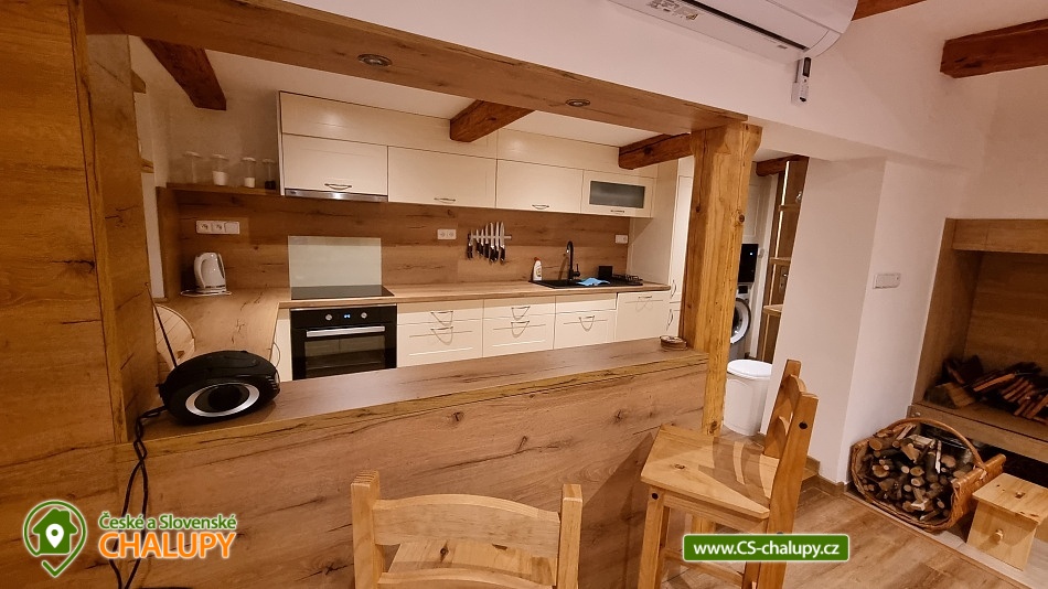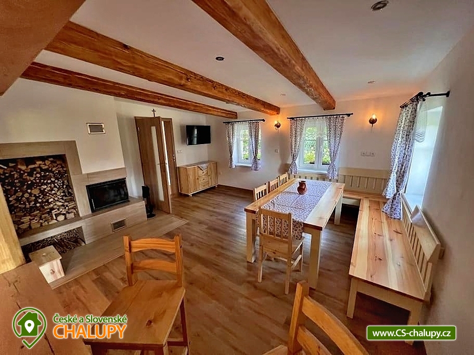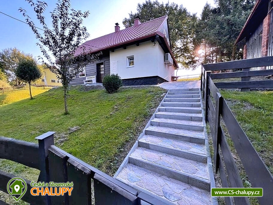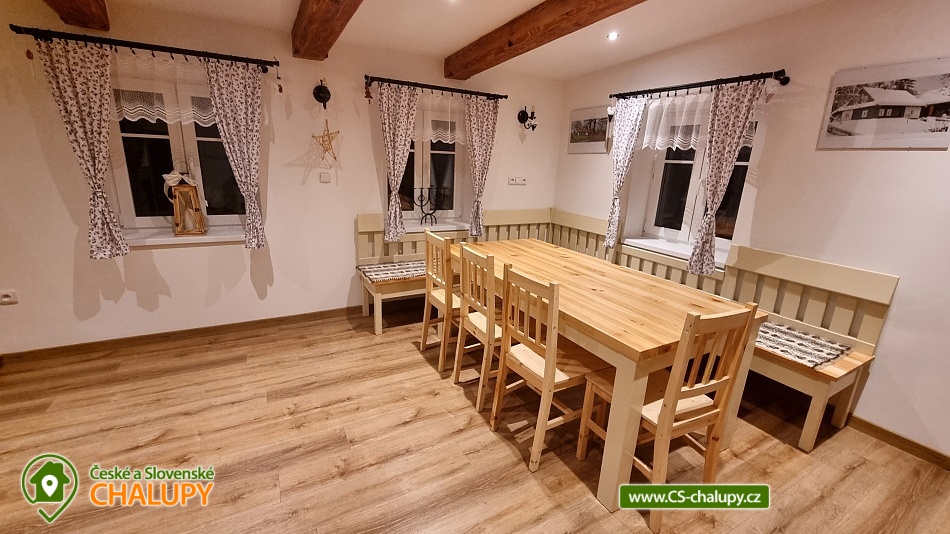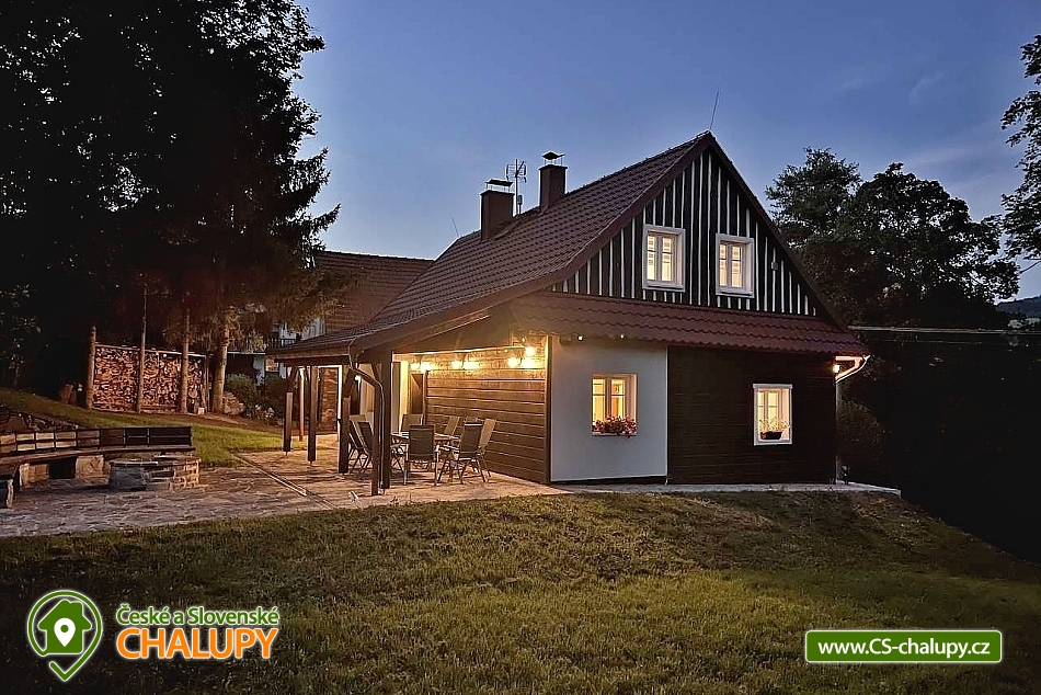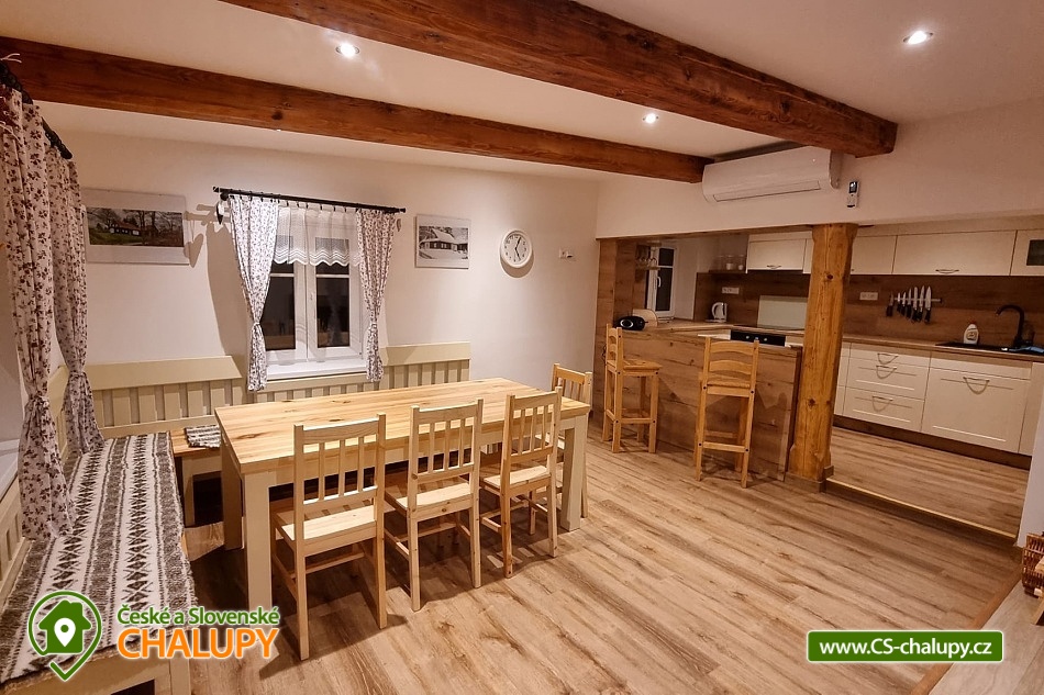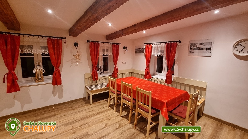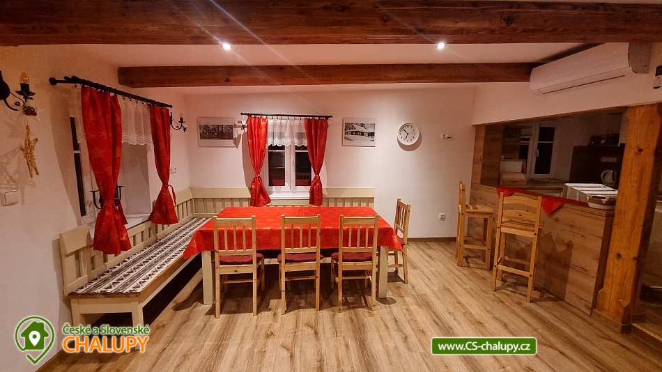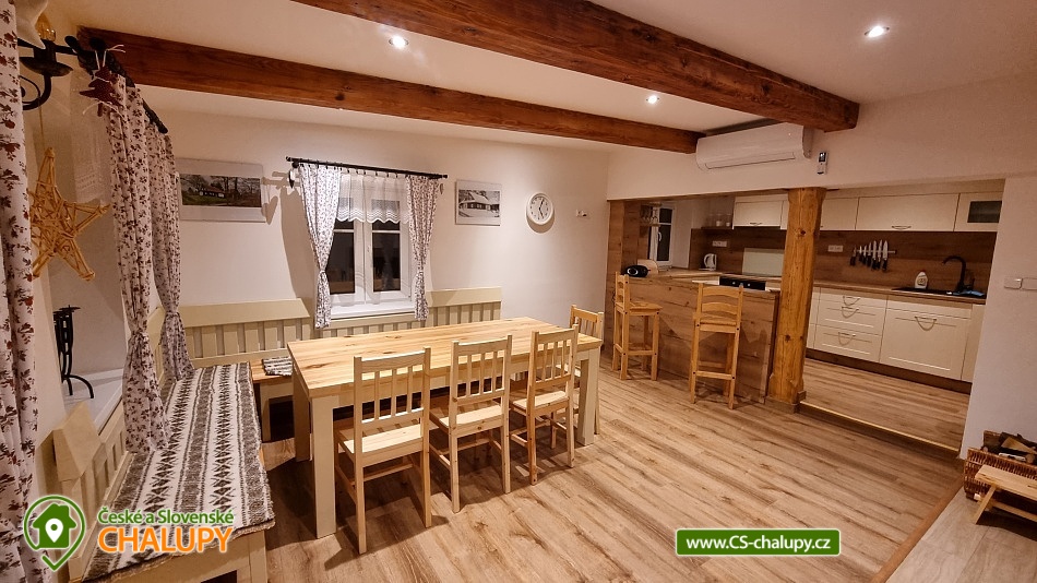 Chalupa s bazénem a hernou se nachází v Moravskoslezském kraji, v malebné vesničce Kozlovice, dědině valašských Vojvodů v podhůří moravskoslezských Beskyd, jež je klidnou zastávkou v dnešní uspěchané době. Chalupa leží 3 km od zříceniny hradu Hukvaldy, 10 km západně od města Frýdlant nad Ostravicí, 12 km jihovýchodně od Příboru a 14 km jihozápadně od Frýdku - Místku. Nabízíme týdenní a víkendové pobyty. Chalupa je po celkové rekonstrukci a poskytuje ubytování pro až 12 osob ve 3 ložnicích. Je kompletně zařízená pro chvíle pohody a odpočinku, a to především během rodinných dovolených v letním či zimním období. Každý host se u nás bude cítit jako doma. V plně vybavené chalupě najdete vše, co potřebujete pro ničím nerušený pobyt. Chalupa disponuje plně vybavenou kuchyní (sklokeramická deska, trouba, myčka, mikrovlnná trouba, varná konvice, veškeré nádobí a pračka). V přízemí se dále nachází stylově vybavená jídelna, obývací pokoj pro 10 až 12 osob s velkým stolem, televizí a plně funkčním krbem. V přízemí se dále nachází koupelna se sprchovým koutem a toaletou a také společenská místnost se stolem a krbem, která je také až pro 12 osob. Na patře jsou tři samostatné ložnice. Jedna s manželskou postelí, a dvěma samostatnými postelemi. V dalších dvou jsou vždy tři samostatné postele a možnost jedné přistýlky. Na patře je také k dispozici druhá toaleta. Vstup do všech třech ložnic je možný jen po Mlynářském schodišti. Koupelna s toaletou v přízemí, a druhá toaleta v patře. Vytápění: Vytápění je možné tepelným čerpadlem a krbem s rozvodem do všech pokojů. Zahrada chalupy disponuje krytým posezením pro 12 osob, ohništěm s posezením a grilem s kompletním vybavením. Čas na prostorné zahradě si můžete zpestřit hraním kuželek. K chalupě také patří stodola, která je vybavenou vířivkou a hernou, skládající se z kulečníku, profi fotbálku, stolního tenisu či nástěnných šipek. Celá chalupa je klimatizovaná a pokrytá signálem WIFI. Výlety: Z Kozlovic se můžete vydat na tři krásné Ondřejníky – Skalku, Solárku a Starou Úboč, ze kterých je vidět do širého okolí i na nejvyšší horu Beskyd – Lysou horu. Vesnička oplývá mnohými stráněmi, pastvinami a každý domeček je do ní pěkně zasazen. V okolí je mnoho turistických cílů, ke kterým se dostanete i na jízdním kole, např. zřícenina hradu Hukvaldy 3 km, kopřivnické automobilové muzeum 10 km, jeskyně Šipka 13 km, rozhledna Štramberská Trúba 14 km, Pustevny se sochou boha Radegasta, Lanový park Tarzánie 14 km a Valašské muzeum v přírodě 20 km. Těšíme se na Vás u nás.