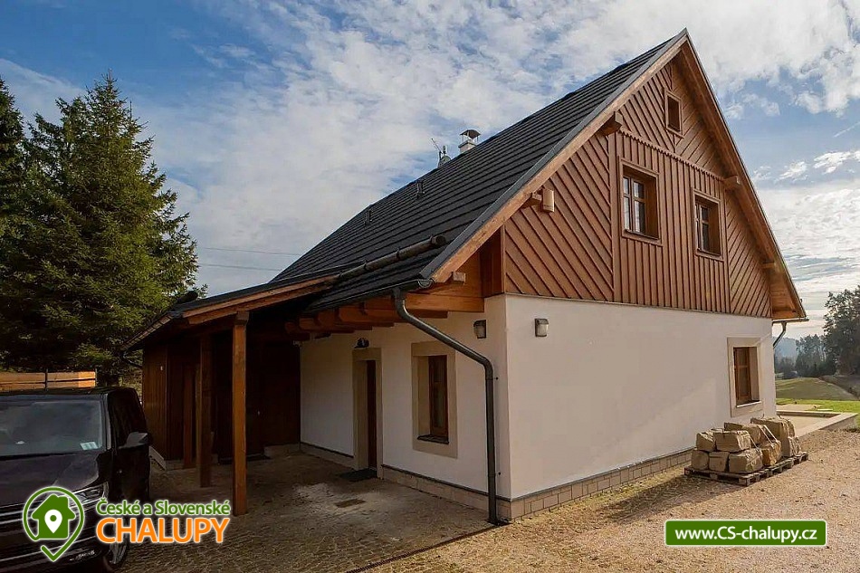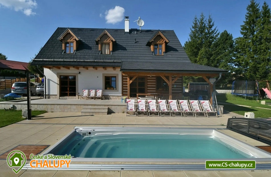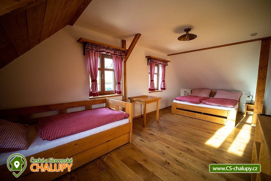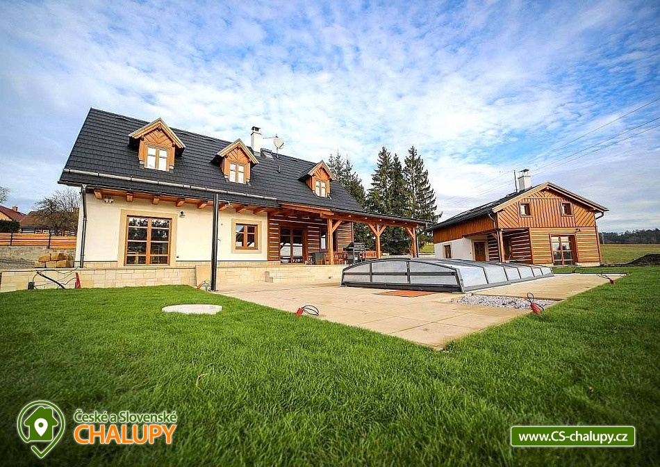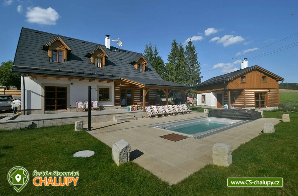 Luxusně zařízená chalupa se nachází v samotném srdci Českého ráje, v malebné části obce Mladějov, nedaleko Prachovských skal. Svoji lokalitou je tak ideálním místem pro turistiku, cyklistiku i zasloužený odpočinek. Těšit se můžete na vyhřívaný bazén, terasu, rozlehlou zahradu i dostatek soukromí. Chalupa poskytuje ubytování pro 15 osob ve 4 ložnicích. V prvním patře se nacházejí tři prostorné ložnice. Modrá a červená ložnice jsou 4-lůžkové (1x manželská postel, 1x jednolůžko, 1x přistýlka) a žlutá ložnice je 2-lůžková (2x samostatné jednolůžko) s možností přistýlky pro dítě. Dále je k dispozici obytné podkroví se čtyřmi matracemi (pohodlně se zde vejdou čtyři dospělé osoby nebo více dětí), které je navrženo jako zábavný prostor pro děti, kde si mohou hrát. K dispozici je dětská postýlka. Každá ložnice je vybavená TV a vlastní koupelnou se sprchovým koutem, umyvadlem a toaletou. V přízemí je navíc velká koupelna s toaletou, pračkou a žehličkou. Pro společné chvíle je k dispozici prostorný obývací pokoj, jehož dominantou jsou stylová kachlová kamna, která dodávají chalupě příjemnou atmosféru. Dále je zde k dispozici pohovka, využitelná jako přistýlka pro jednu osobu, TV a společenské hry. Na obývací pokoj volně navazuje plně vybavená kuchyň (indukční varná deska, elektrická trouba, mikrovlnná trouba, rychlovarná konvice, lednice, mrazák, myčka a nádobí) s posezením u masivních dubových stolů a TV. Vytápění celé chalupy je řešeno podlahovým topením, v obývacím pokoji kachlovými kamny s krbem. V celém objektu je k dispozici WI-FI připojení na internet. Chalupu obklopuje rozsáhlý travnatý pozemek s možností parkování na oploceném, kamerami střeženém parkovišti přímo u objektu (max. 6 aut). Společný volný čas je možné trávit ve velké zčásti zastřešené terase s dřevěným posezením a zahradním grilem. Možnost využít i ohniště. Dominantou zahrady je vyhřívaný krytý bazén s protiproudem a vířivkou zabudovanou ve schodech bazénu (k dispozici od dubna do září). Relaxovat můžete na venkovních lehátkách. Ve volných chvílích si můžete zahrát badminton a pétanque. Ti nejmenší ocení hřiště s houpačkou, skluzavkou a trampolínou, dospělí ocení výčepní zařízení. Pro cyklisty je zde možnost úschovy kol v kolárně. V okolí chalupy možnost turistiky, cykloturistiky, koupání, lyžování, běžkování, rybaření či houbaření. Mezi možnosti koupání patří např.: koupaliště Sobotka, rybník Nebákov, koupaliště Sklář - Ostružno, Jinolické rybníky, rybník Věžák, koupaliště Kníže - Jičín, Roudenský rybník, Aqua Centrum Jičín nebo koupaliště Sedmihorky. V zimě jsou výhodou blízká lyžařská střediska např.: Ski areál Kozákov, Ski areál Zvičina, Ski areál Paseky nad Jizerou, Ski areál Šachty, běžecký areál v Lomnici nad Popelkou atd. K výletům v okolí láká: Prachovské skály, zřícenina hradu Trosky, rybníky Nebákov a Podsemín, zámek Humprecht, hrad Kost, zámek Hrubá Skála, Šolcův statek nebo Jičín - město pohádek. Těšíme se na Vás u nás.