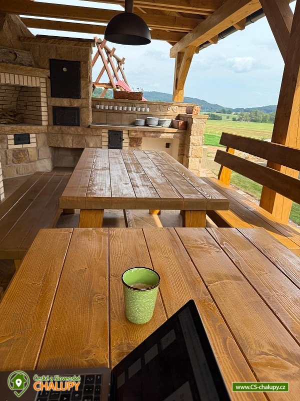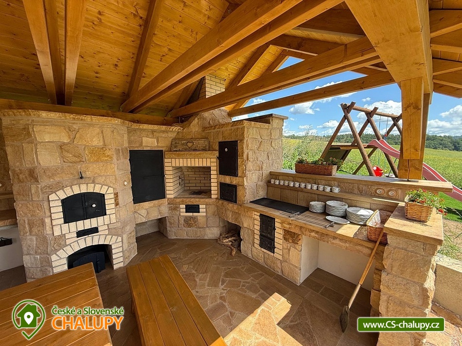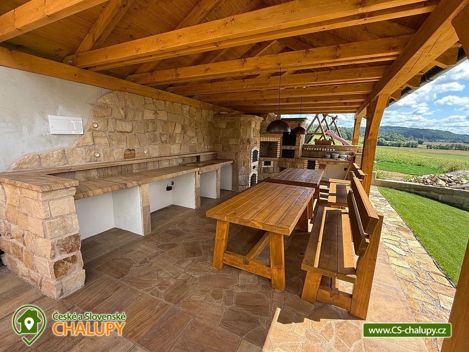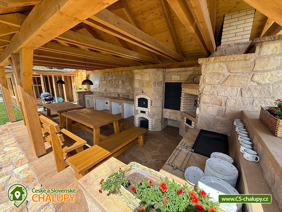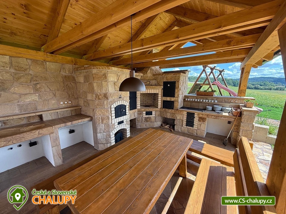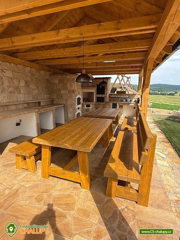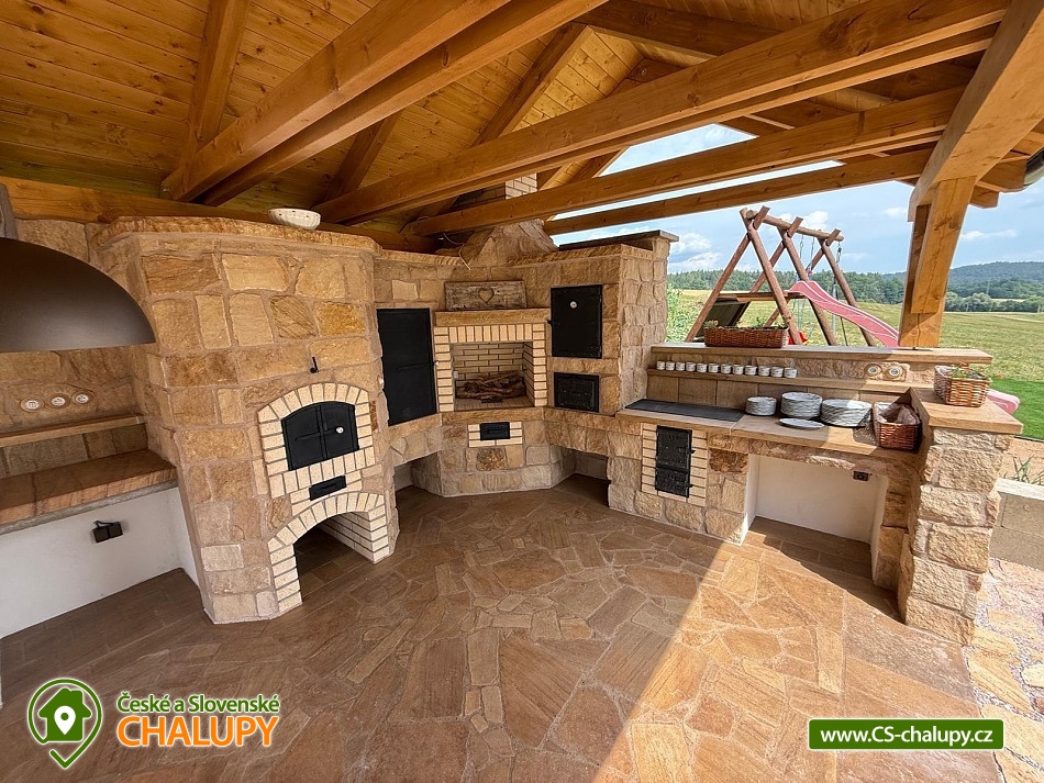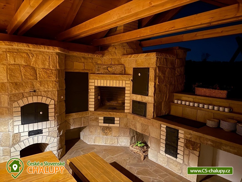 Luxusně zařízená chalupa se nachází v samotném srdci Českého ráje, v malebné části obce Mladějov, nedaleko Prachovských skal. Svoji lokalitou je tak ideálním místem pro turistiku, cyklistiku i zasloužený odpočinek. Těšit se můžete na vyhřívaný bazén, terasu, rozlehlou zahradu i dostatek soukromí. Chalupa poskytuje ubytování pro 15 osob ve 4 pokojích. V prvním patře se nacházejí tři prostorné ložnice. Modrá a červená ložnice jsou 4-lůžkové (1x manželská postel, 1x jednolůžko, 1x přistýlka) a žlutá ložnice je 2-lůžková (2x samostatné jednolůžko) s možností přistýlky pro dítě. Dále je k dispozici obytné podkroví se čtyřmi matracemi (pohodlně se zde vejdou čtyři dospělé osoby nebo více dětí), které je navrženo jako zábavný prostor pro děti, kde si mohou hrát. K dispozici je dětská postýlka. Každá ložnice je vybavená TV a vlastní koupelnou se sprchovým koutem, umyvadlem a toaletou. V přízemí je navíc velká koupelna s toaletou, pračkou a žehličkou. Pro společné chvíle je k dispozici prostorný obývací pokoj, jehož dominantou jsou stylová kachlová kamna, která dodávají chalupě příjemnou atmosféru. Dále je zde k dispozici pohovka, využitelná jako přistýlka pro jednu osobu, TV a společenské hry. Na obývací pokoj volně navazuje plně vybavená kuchyň (indukční varná deska, elektrická trouba, mikrovlnná trouba, rychlovarná konvice, lednice, mrazák, myčka a nádobí) s posezením u masivních dubových stolů a TV. Vytápění celé chalupy je řešeno podlahovým topením, v obývacím pokoji kachlovými kamny s krbem. V celém objektu je k dispozici WI-FI připojení na internet. Chalupu obklopuje rozsáhlý travnatý pozemek s možností parkování na oploceném, kamerami střeženém parkovišti přímo u objektu (max. 6 aut). Společný volný čas je možné trávit ve velké zčásti zastřešené terase s dřevěným posezením a zahradním grilem. Možnost využít i ohniště. Dominantou zahrady je vyhřívaný krytý bazén s protiproudem a vířivkou zabudovanou ve schodech bazénu (k dispozici od dubna do září). Relaxovat můžete na venkovních lehátkách. Ve volných chvílích si můžete zahrát badminton a pétanque. Ti nejmenší ocení hřiště s houpačkou, skluzavkou a trampolínou, dospělí ocení výčepní zařízení. Pro cyklisty je zde možnost úschovy kol v kolárně. V okolí chalupy možnost turistiky, cykloturistiky, koupání, lyžování, běžkování, rybaření či houbaření. Mezi možnosti koupání patří např.: koupaliště Sobotka, rybník Nebákov, koupaliště Sklář - Ostružno, Jinolické rybníky, rybník Věžák, koupaliště Kníže - Jičín, Roudenský rybník, Aqua Centrum Jičín nebo koupaliště Sedmihorky. V zimě jsou výhodou blízká lyžařská střediska např.: Ski areál Kozákov, Ski areál Zvičina, Ski areál Paseky nad Jizerou, Ski areál Šachty, běžecký areál v Lomnici nad Popelkou atd. K výletům v okolí láká: Prachovské skály, zřícenina hradu Trosky, rybníky Nebákov a Podsemín, zámek Humprecht, hrad Kost, zámek Hrubá Skála, Šolcův statek nebo Jičín - město pohádek. Těšíme se na Vás u nás.