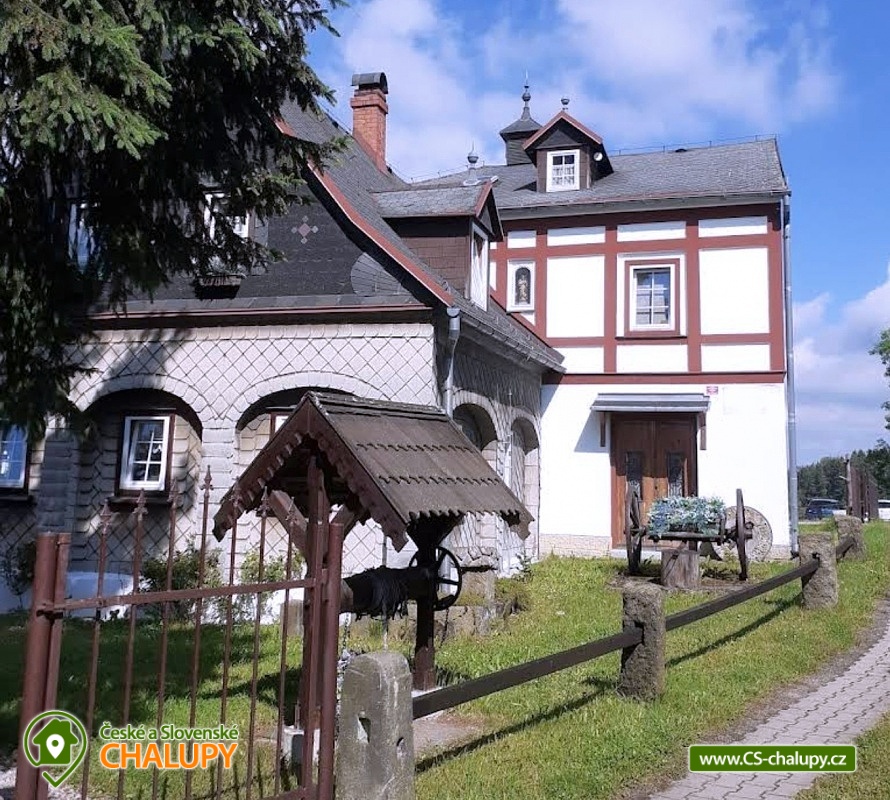 Stylová chalupa s bazénem na zahradě je zasazena do překrásné přírody - poloha na hranici národního parku České Švýcarsko. Chalupa poskytuje ubytování pro až 20 osob (z toho 3 přistýlky) v 8 ložnicích. Při vstupu do chalupy se ocitnete v členěné vstupní chodbě, ze které se vlevo vchází do společenské místnosti zařízené ve starobylém stylu. Z této místnosti je vchod do plně vybavené kuchyně zařízené v tradičním stylu - doplněno o elektrospotřebiče nerozlučně spjaté s moderním stylem života (velká lednice s mrazákem, elektrický sporák, rychlovarná konvice, mikrovlnná trouba...). Na chodbě vpravo je vchod do obývacího pokoje se třemi lůžky a krásnými kachlovými kamny. Tento pokoj sousedí s menší ložnicí pro dvě osoby. Každý z těchto pokojů má vlastní vchod z chodby, ale můžete využít i průchozích dveří. Vlevo na konci chodby se vchází do koupelny, kde je 1 sprcha, 1 vana a 1x WC. Před koupelnou vás ještě překvapí menší místnost, kde se nachází starý kamenný kotel a různé předměty z minulého století. Úplně v rohu na konci chodby je ještě jedno samostatné WC. Z haly po schodišti se dostanete do prvního patra, ve kterém se nachází dalších 6 pokojů. Prvními dveřmi se dostanete do menšího (průchozího) pokoje pro dva hosty. Za tímto pokojem je další, určený pro rodinu s dítětem. Je z něj krásný pohled na vzdálené kopce Šluknovska. V pokoji je manželská postel a postýlka pro dítě. Druhé dveře z chodby vedou do koupelny s 1 sprchovým koutem a 2x WC. Další dveře vedou do dvoulůžkového samostatného pánského pokoje. Na chodbě naproti za dalšími dveřmi vstoupíme do sluncem zalitého dvoulůžkového pokojíčku zařízeného ve stylu Provence. Poslední dveře v chodbě vedou do pokoje pro 3 osoby, opět s výhledem přes horské louky a lesy do dálav. S ním sousedí ještě malý pokojík pro jednu osobu + dvě přistýlky, který ocení především mladí hosté. Vytápění chalupy je elektrické a olejovými radiátory. Parkování u objektu. Vybavení chalupy: Součástí kuchyně je lednice, mikrovlnná trouba, varná konvice, kávovar, elektrický sporák s troubou. toustovač, topinkovač. Ve starodávných kredencích najdete množství nádobí. ve společenské místnosti je televize. V celém objektu je zdarma WiFi. Součástí chalupy je jižní zahrada plná květin, dřevin a malých jezírek. V této části zahrady se nachází také udírna a malé posezení. V západní části zahrady najdete bazén s ohřívanou vodou a hlavně úžasný výhled na hornatý kraj nejsevernějších Čech. V severní části zahrady je stání pro auta. V Krásné Lípě na náměstí najdete Dům Českého Švýcarska, místní muzeum. V tomto kraji je specifická architektura (domy s podstávkou, hrázděné domy, střechy kryté břidlicí, břidlicí vykládané ozdobné štíty starých chalup). Skalní hrádky, Koglerova naučná stezka (nejstarší naučná stezka v ČR), stezky vhodné i pro kočárky. Krásné cyklostezky. Možnosti koupání: Vyhřívaný bazén v zahradě objekt je situován na západ s krásným výhledem do krajiny. Přírodní koupaliště 100 m od chalupy.