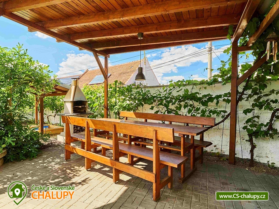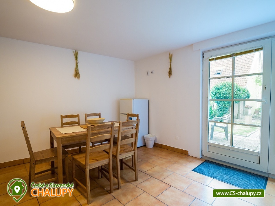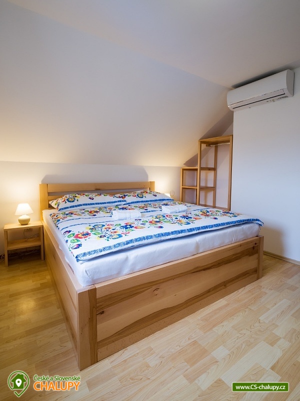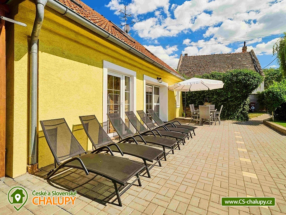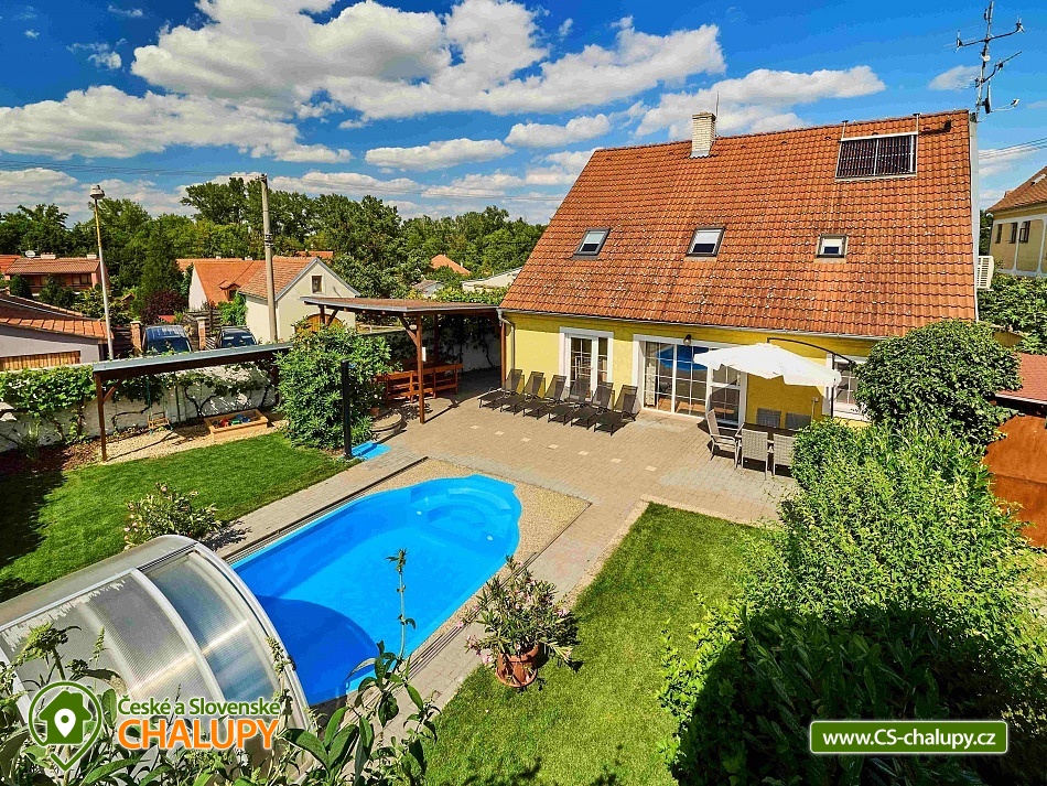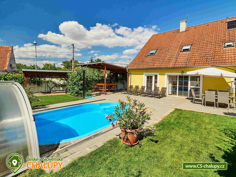 Chalupa s bazénem v CHKO Pálava se skládá z hlavní chalupy (14 osob) a samostatného domku (7 osob) v přilehlé uzavřené zahradě. Celková kapacita je až 21 osob. Součástí zahrady je vlastní bazén s terasou, pergola s možností grilování a dětský koutek. Ve vybavení je klimatizace ve všech pokojích, LED TV a v celém objektu Wi-Fi zdarma. Postele z masivu a luxusní matrace „COCO MAXI 23 CM“, na všech postelích a přistýlkách. V hlavní chalupě se nachází celkem 5 ložnic, každá s vlastním sociálním zařízením. Kapacita je 14 lůžek (2 + 2 + 3 + 4 + 3 osoby). K tomu můžete využít 2 kuchyně a obývací místnost s krbovými kamny. Samostatný domek na zahradě, který je situován odděleně od hlavní budovy, poskytne ubytování další rodině. Ve dvou ložnicích v prvním patře je celkem 7 lůžek (3 + 4). V přízemí potom obývací prostor s kuchyňkou a koupelnou. Máte možnost užívat si soukromí s grilováním pod pergolou a relaxaci na zahradě nebo terase u bazénu. Velkorysá úschovna kol v garáži domu nabízí možnost pohodlného uskladnění kol pro všechny ubytované. V přízemí hlavní chalupy najdete velkou společenskou místnost s krbovými kamny, ve které najdou pohodlí všichni ubytovaní. K dispozici je moderně vybavená kuchyně, kde kromě standardních moderních spotřebičů najdete také myčku a pračku. Vytápění zajišťují krbová kamna, el. přímotopy a podlahové topení. Parkování je možné přímo u objektu. Obec Dolní Věstonice s tisíciletou vinařskou tradicí najdete severně od Pavlovských vrchů asi 10 km na sever od Mikulova na jižním břehu Novomlýnských nádrží. Téměř celou východní část obce tvoří Sklepní ulice s původními i nově vybudovanými vinnými sklepy. Nabízíme možnost degustací v rodinném vinném sklípku. Přímo nad obcí se nachází zřícenina hradu Děvičky a nejvyšší bod Pálavy Děvín. Doporučujeme navštívit: Archeopark Pavlov a zřícenina Sirotčí hrádek, Stezka bosou nohou Schrattenberg – Valtice, Aqualand Moravia, Padleboard - Pavlov, Lednicko Valtický areál a Mikulov - zámek a lom, kde se natáčeli Vinaři a Bobule.