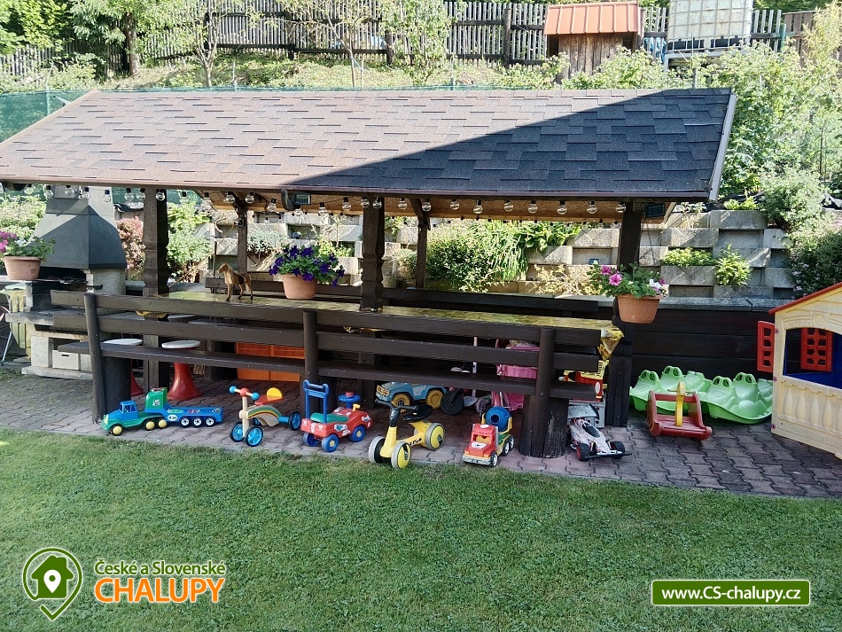 Chalupa s bazénem - Vsetínské vrchy je situována na okraji lesa, přibližně 2 km od centra podhorské rekreační obce Valašská Bystřice v CHKO Beskydy. Chalupa nabízí ubytování pro až 11 osob ve dvou mezonetových apartmánech. Apartmán pro 5 osob (5x jednolůžko, k dispozici dětská postýlka) a apartmán pro 6 osob (6x jednolůžko). Lze si pronajmout každý apartmán samostatně nebo chalupu jako celek. Každý apartmán je vybaven jednou podkrovní ložnicí, TV, Wi-Fi připojením a plně vybavenou kuchyní s jídelním koutem (nádobí, lednice, mrazák, elektrický vařič, rychlovarná konvice a mikrovlnná trouba). Dále pak je k dispozici v každém apartmánu koupelna s umyvadlem, sprchovým koutem a WC. V celé chalupě je elektrické vytápění. Prosíme nájemce o základní závěrečný úklid při odjezdu (stáhnutí povlečení, případně vysát, vynesení odpadkových košů, umytí a utření nádobí). Parkování možné přímo u objektu pro 2 auta. Na zahradě je krytý altán s vnějším krbem a posezením a ohniště s lavičkami. V létě je k dispozici venkovní bazén a lehátka. Pro ty nejmenší je připraveno dětské hřiště s domečkem, houpačkami, skluzavkou, pískovištěm, trampolínou a zajímavými prolézačkami. Dále pak odrážedla, auta a kočárek. Okolí chalupy je ideální pro turistiku, cykloturistiku nebo houbaření. Nedaleko je také golfové a discgolfové hřiště, tenisové kurty a dětské hřiště. Tipy na výlety: vyhlídková věž Búřov, zřícenina Rožnovského hradu, Valašské muzeum v přírodě, Pustevny, Svantovítova skála, Jurkovičova rozhledna, zábavní park Gibon, naučná stezka Soláň, hvězdárna Valašské Meziříčí, stezka Valaška. Možnosti koupání: přehrada Bystřička, koupaliště Vigantice, koupaliště a bazén Rožnov pod Radhoštěm, koupaliště Hutisko-Solanec. Blízká lyžařská střediska: ski areál Soláň, Rališka, Búřov, Vsacký Cáb. Těšíme se na Vás u nás.