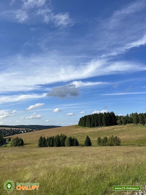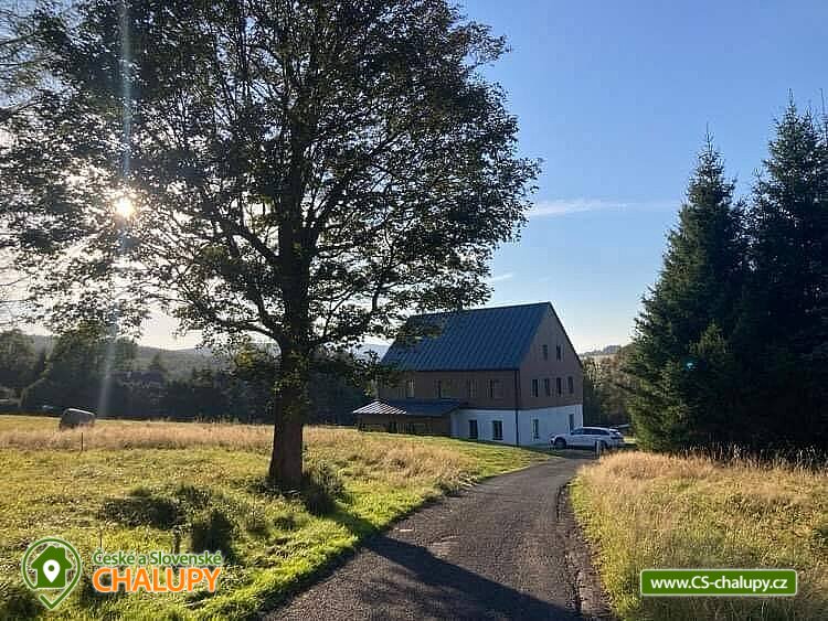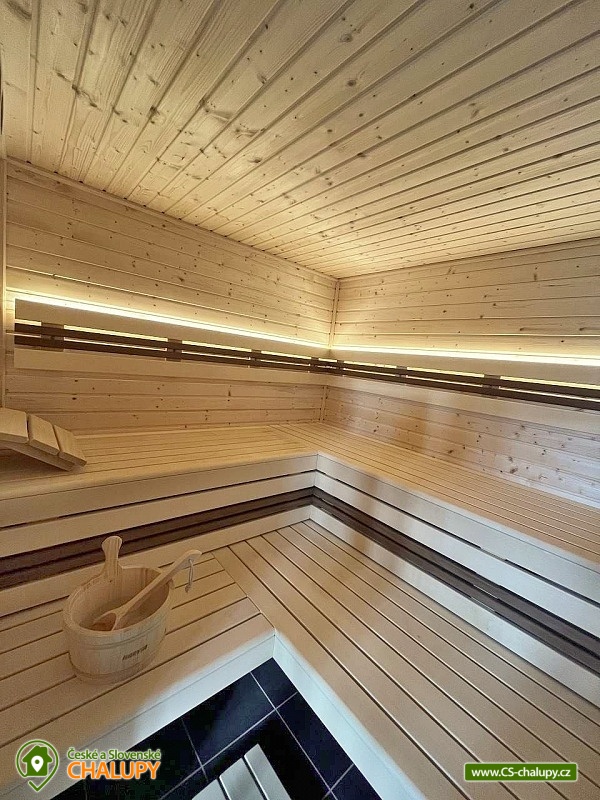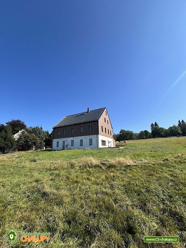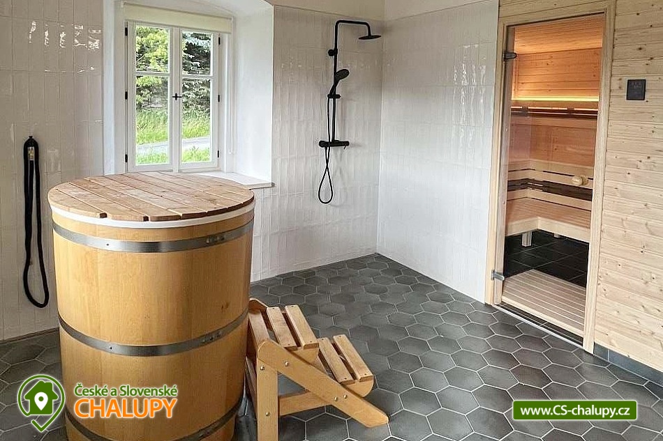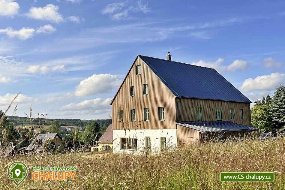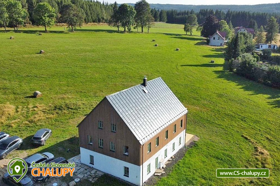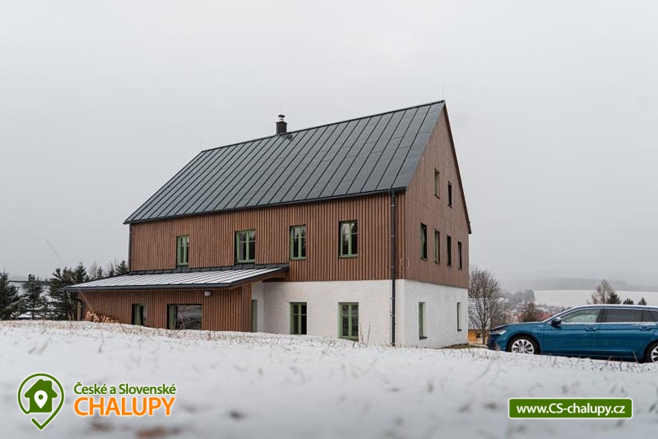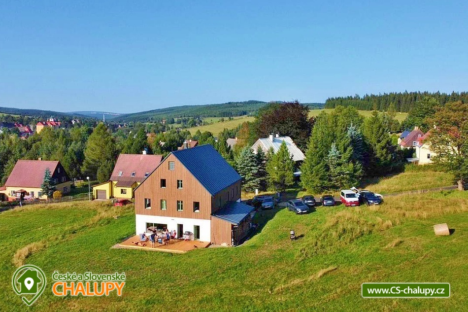 Chalupa s wellness se nachází v blízkosti lesa a luk na klidném místě nedaleko areálu Klínovec v malebném prostředí Krušných hor. Těšit se můžete na stylový interiér, kde se spojuje tradiční horská architektura s moderními prvky. Příjemný relax si užijete ve wellness místnosti s finskou saunou pro 6 osob, ledovou kádí, sprchou a lehátky. Chalupa nabízí ubytování pro až 18 osob v 5 ložnicích. Ubytování je vhodné pro rekreaci rodiny, větších skupin nebo pro pořádání oslav, teambuildingů, či cvičebních pobytů. V přízemí je umístěná dvoulůžková ložnice s 1x manželskou postelí. Další čtyři čtyřlůžkové ložnice se nachází v patře. Ve všech je k dispozici 1x manželská postel a 2x přistýlka řešená rozkládacím gaučem. V přízemí se nachází vstupní hala, technická místnost pračkou, sušákem na boty a stojanem na lyže nebo kola. Příjemné chvíle lze trávit ve společenské místnosti s krbovými kamny, se sedací soupravou, knihovnou, chytrou TV s O2TV, velkým oknem s možností sezení v něm, prostorným jídelním stolem a plně vybavenou kuchyní s ostrůvkem (lednice, mrazák, trouba, automatický kávovar na zrna, mikrovlnná trouba, spíž, hrnce, pánve, veškeré nádobí a příbory). Ke chvílím zábavy slouží podkrovní prostor s barem s chladničkou, sedací soupravou, stolky k posezení, pingpongovým stolem, stolním fotbálkem a v podhledu se zabudovanými reproduktory. K baru patří i chladící výčepní zařízení. Po domluvě lze zajistit sud piva. V celém objektu je k dispozici WIFI připojení na internet. Sociální zařízení zahrnuje v přízemí jednu koupelnu se sprchovým koutem a samostatné WC a v patře jednu koupelnu s vanou a WC. Další sprchový kout je u sauny. K dispozici jsou ručníky a prostěradla na saunování. Vytápění je řešeno ústředním vytápěním tepelným čerpadlem a elektrickým kotlem. V obývacím pokoji jsou k dispozici krbová kamna s výměníkem umožňujícím vytápění celého objektu. V chalupě si lze zapůjčit vysavač, koště, úklidové prostředky a erární pantofle. Součástí chalupy je dostatek úložných prostorů, hasící přístroj a lékarnička. Na obývací pokoj navazuje prostorná sluneční terasa, kde je připraveno posezení (stolek, židle a lavice), lehátka a plynový gril. Parkovat lze přímo u objektu. V blízkosti chalupy možnost turistiky, cykloturistiky, koupání, houbaření, lyžování a běžkování. Součástí obce je rybník, ve kterém je možné se vykoupat a v zimě na něm bruslit, a kuželna. Zhruba 10 minut od chaty se nachází areál Klínovec, který v zimě slouží k lyžování a v létě nabízí pro cyklisty upravované traily všech obtížností. Dále jsou k dispozici lyžařská střediska: Loučná pod Klínovcem, Alšovka - Měděnec, Neklid - Boží Dar a další. Mezi možnosti koupání patří také např.:aquapark Klášterec nad Ohří, Koupaliště Perštejn, aquapark Jáchymov, Černé jezírko, Velký rybník Hroznětín, atd. K výletům v okolí láká zaniklá vesnice Königsmühle, Muzeum letecké bitvy nad Kovářskou, vrch Měďník, vodní nádrž Přísečnice, vrch Velký Špičák, Zámek Klášterec nad Ohří nebo na německé straně Fichtelberg nad městem Kurort Oberwiesenthal. Těšíme se na Vás u nás.
