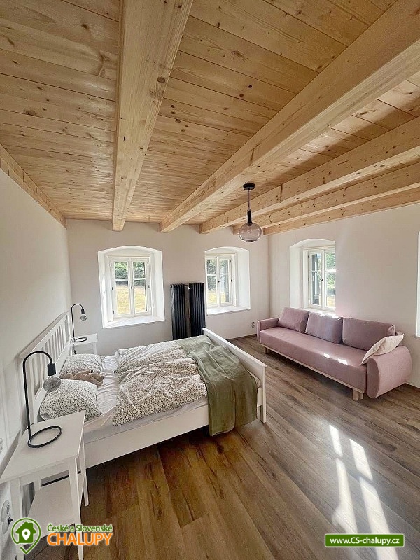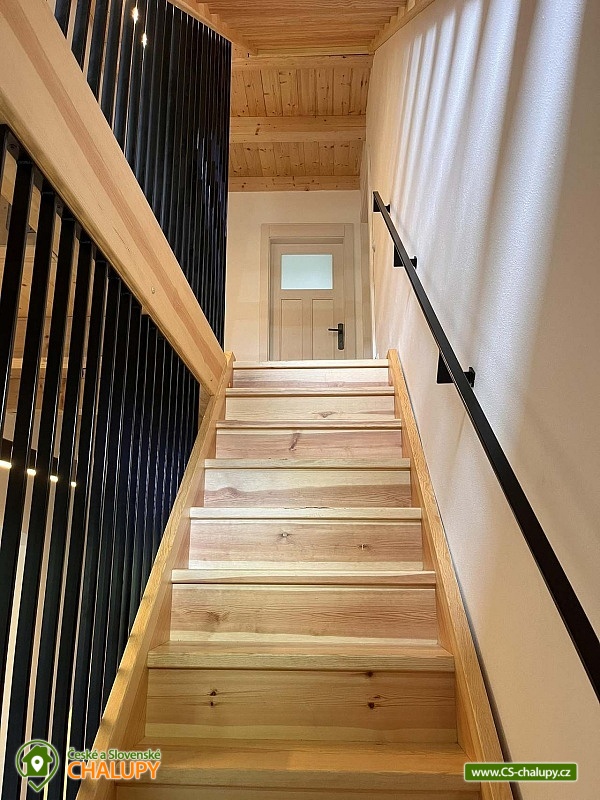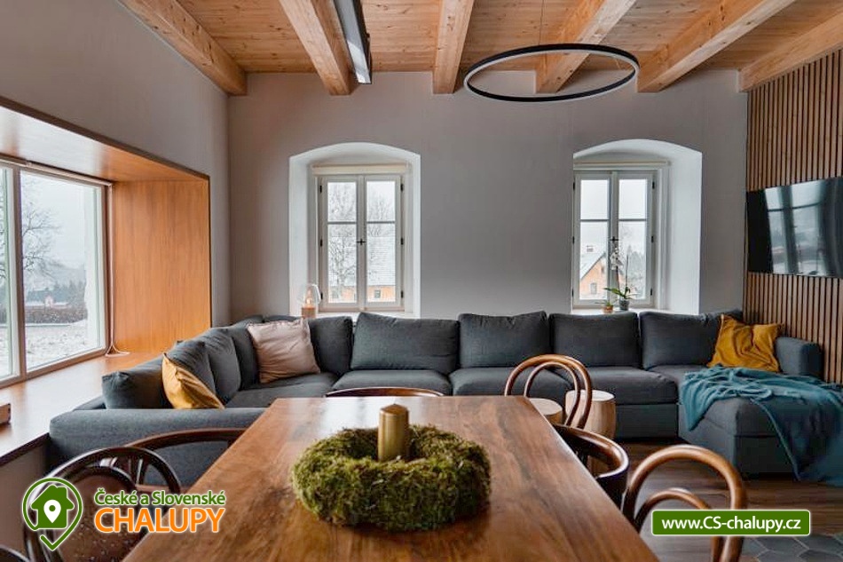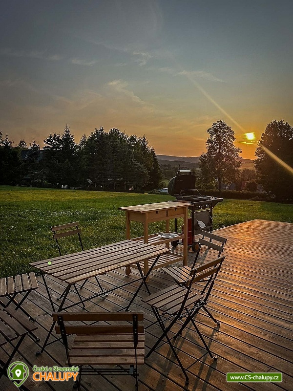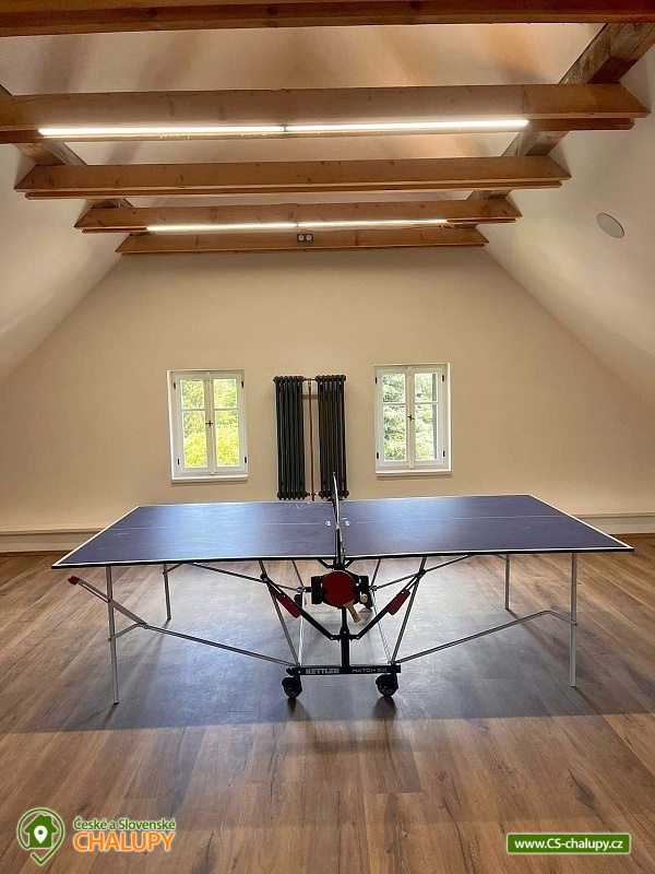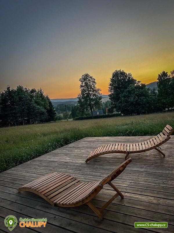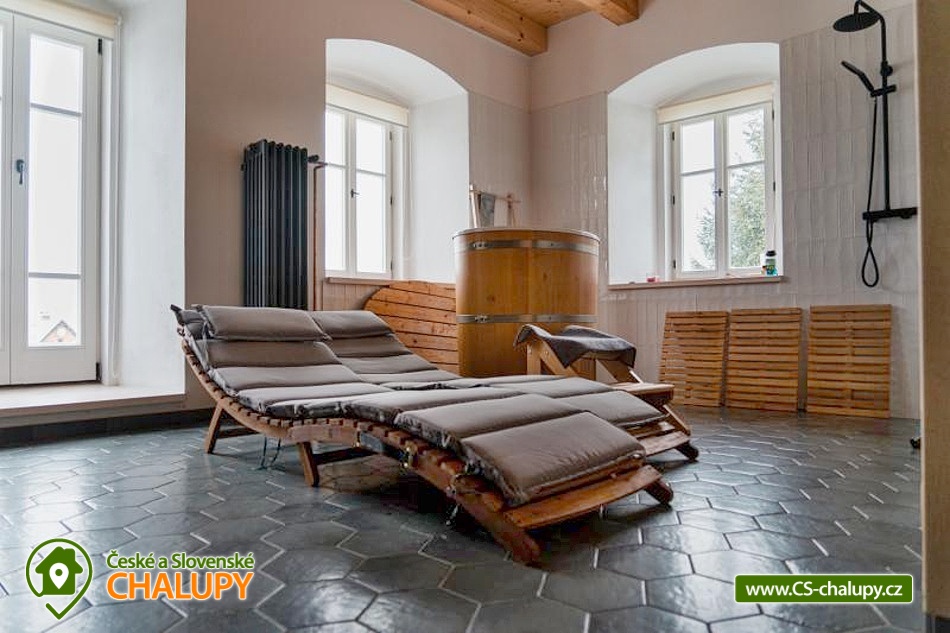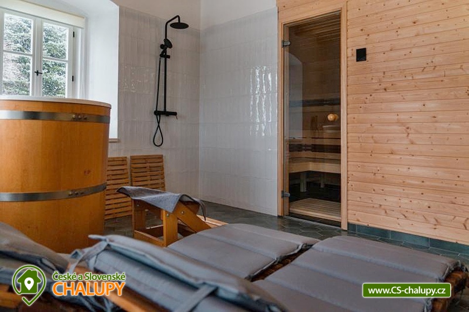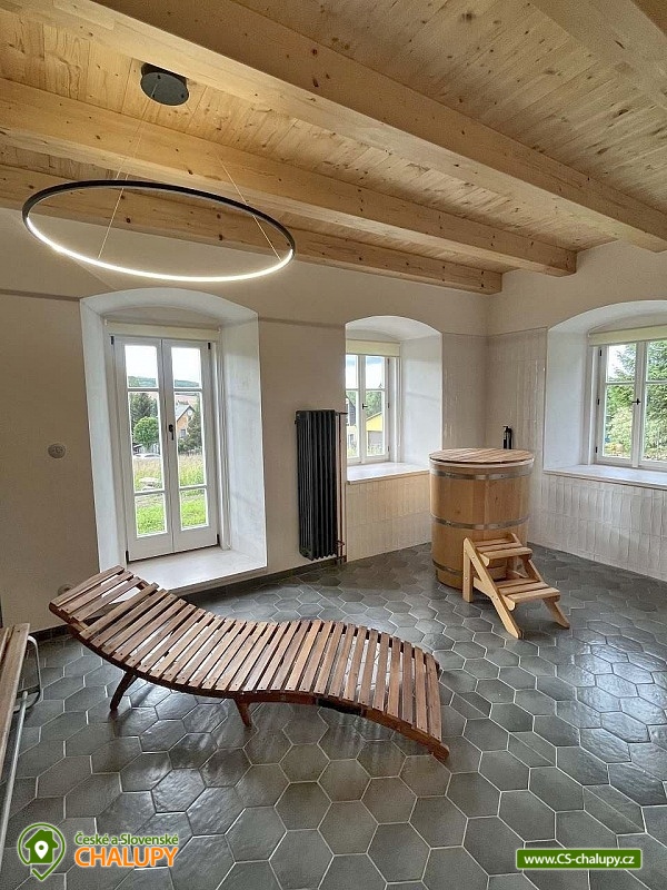 Chalupa s wellness se nachází v blízkosti lesa a luk na klidném místě nedaleko areálu Klínovec v malebném prostředí Krušných hor. Těšit se můžete na stylový interiér, kde se spojuje tradiční horská architektura s moderními prvky. Příjemný relax si užijete ve wellness místnosti s finskou saunou pro 6 osob, ledovou kádí, sprchou a lehátky. Chalupa nabízí ubytování pro až 18 osob v 5 ložnicích. Ubytování je vhodné pro rekreaci rodiny, větších skupin nebo pro pořádání oslav, teambuildingů, či cvičebních pobytů. V přízemí je umístěná dvoulůžková ložnice s 1x manželskou postelí. Další čtyři čtyřlůžkové ložnice se nachází v patře. Ve všech je k dispozici 1x manželská postel a 2x přistýlka řešená rozkládacím gaučem. V přízemí se nachází vstupní hala, technická místnost pračkou, sušákem na boty a stojanem na lyže nebo kola. Příjemné chvíle lze trávit ve společenské místnosti s krbovými kamny, se sedací soupravou, knihovnou, chytrou TV s O2TV, velkým oknem s možností sezení v něm, prostorným jídelním stolem a plně vybavenou kuchyní s ostrůvkem (lednice, mrazák, trouba, automatický kávovar na zrna, mikrovlnná trouba, spíž, hrnce, pánve, veškeré nádobí a příbory). Ke chvílím zábavy slouží podkrovní prostor s barem s chladničkou, sedací soupravou, stolky k posezení, pingpongovým stolem, stolním fotbálkem a v podhledu se zabudovanými reproduktory. K baru patří i chladící výčepní zařízení. Po domluvě lze zajistit sud piva. V celém objektu je k dispozici WIFI připojení na internet. Sociální zařízení zahrnuje v přízemí jednu koupelnu se sprchovým koutem a samostatné WC a v patře jednu koupelnu s vanou a WC. Další sprchový kout je u sauny. K dispozici jsou ručníky a prostěradla na saunování. Vytápění je řešeno ústředním vytápěním tepelným čerpadlem a elektrickým kotlem. V obývacím pokoji jsou k dispozici krbová kamna s výměníkem umožňujícím vytápění celého objektu. V chalupě si lze zapůjčit vysavač, koště, úklidové prostředky a erární pantofle. Součástí chalupy je dostatek úložných prostorů, hasící přístroj a lékarnička. Na obývací pokoj navazuje prostorná sluneční terasa, kde je připraveno posezení (stolek, židle a lavice), lehátka a plynový gril. Parkovat lze přímo u objektu. V blízkosti chalupy možnost turistiky, cykloturistiky, koupání, houbaření, lyžování a běžkování. Součástí obce je rybník, ve kterém je možné se vykoupat a v zimě na něm bruslit, a kuželna. Zhruba 10 minut od chaty se nachází areál Klínovec, který v zimě slouží k lyžování a v létě nabízí pro cyklisty upravované traily všech obtížností. Dále jsou k dispozici lyžařská střediska: Loučná pod Klínovcem, Alšovka - Měděnec, Neklid - Boží Dar a další. Mezi možnosti koupání patří také např.:aquapark Klášterec nad Ohří, Koupaliště Perštejn, aquapark Jáchymov, Černé jezírko, Velký rybník Hroznětín, atd. K výletům v okolí láká zaniklá vesnice Königsmühle, Muzeum letecké bitvy nad Kovářskou, vrch Měďník, vodní nádrž Přísečnice, vrch Velký Špičák, Zámek Klášterec nad Ohří nebo na německé straně Fichtelberg nad městem Kurort Oberwiesenthal. Těšíme se na Vás u nás.