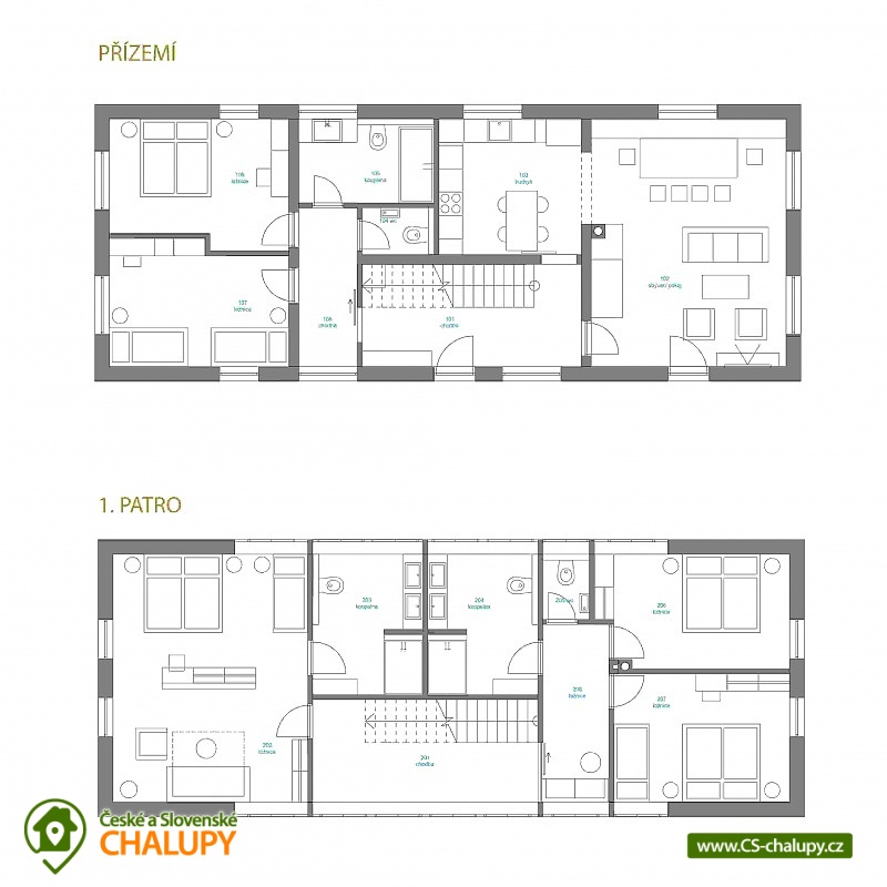 - 5 ložnic: 1x 4+1, 1x 3, 3x 2