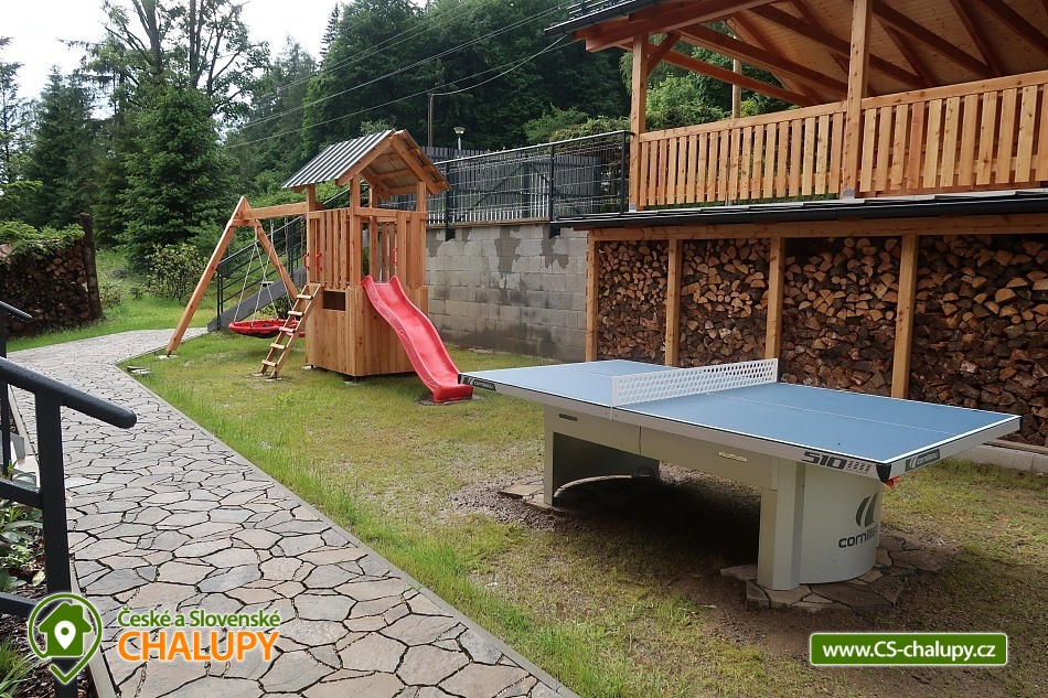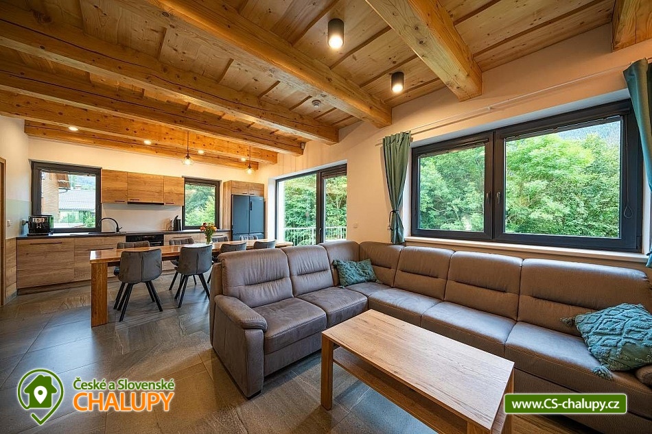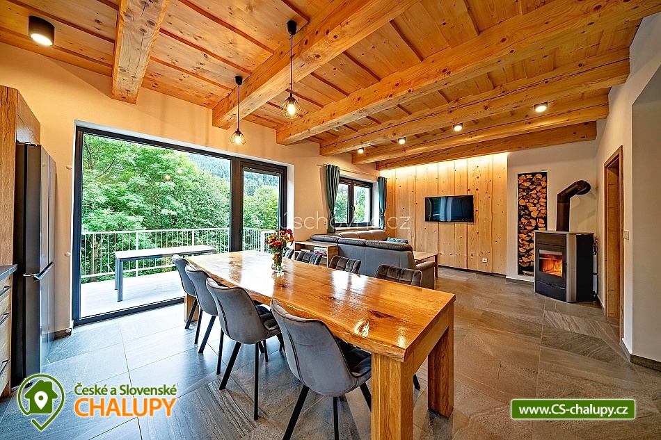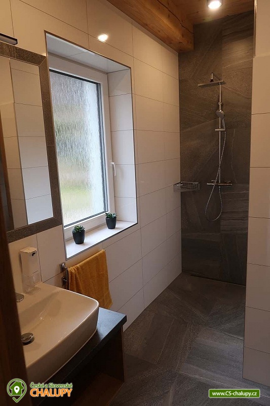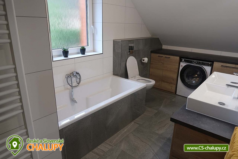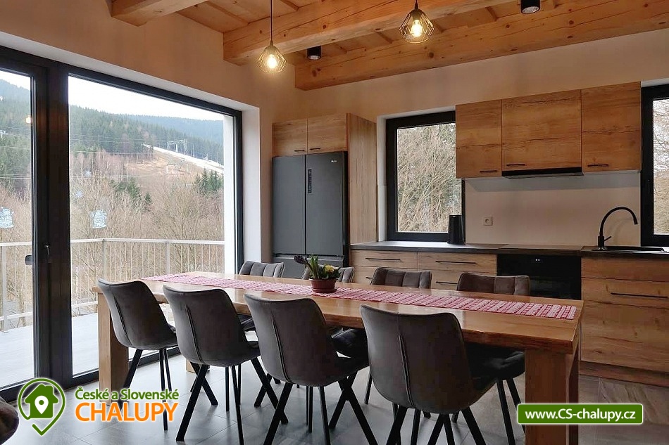 Chalupa s wellness (sauna a vířivka) nedaleko Červenohorského sedla a střediska Ovčárna v Jeseníkách. Chalupa se dělí na 2 části - každá část pro až 9 osob se pronajímá samostatně. Možný je samozřejmě i pronájem obou částí společně pro až 18 osob. Každá část chalupy má svůj vlastní wellness se soukromou vířivkou a saunou. Každá část má 2 ložnice (jedna ložnice má dvě dvojlůžka a druhá ložnice má dvě dvojlůžka a jedno samostatné lůžko) + k dispozici 2 přistýlky. Kuchyň je kvalitně vybavena všemi spotřebiči, myčka, indukce, trouba s mikrovlnkou, digestoř, americká lednice, kávovar, toustovač, atd. V obývacím pokoji je led televize s internetem. Na terase posezení a stůl s šesti křesly. V suterénu kvalitní vířivka a finská sauna. Každá polovina chalupy má tři koupelny - dvakrát sprchový kout a jedna vana a tři WC, z toho dvě WC jsou samostatné a jedno v koupelně. Podlahové vytápění je v celém objektu napojené na elektrokotel a na krb s výměníkem. Parkování je pro 4 auta v uzavřeném objektu a další 3 auta mohou stát u objektu za plotem venku. Celý pozemek je oplocen má 1300 m2 a ve spodní části má každá polovina chalupy oddělenou zahradu. K dispozici jsou houpačky a společný zahradní krb na opékání. Chalupa se nachází přímo u 6ti sedačkové lanovky, která vede k přečerpávací nádrži Dlouhé Stráně. V okolí objektu možnost turistiky, cykloturistiky, koupání, houbaření, rybaření, lyžování a běžkování. V blízkosti je také golfové hřiště. Mezi možnosti koupání patří např.: bazén Domašov - Bělá pod Pradědem, Velké Losiny - termály, termální koupaliště Velké Losiny, koupaliště Rapotín, Bazén Karlova Studánka, koupaliště Jeseník, bazén Jeseník - Priessnitz, přehrada Krásné, Hynčice pod Sušinou - rybník Úžas, koupaliště Šumperk - Bratrušák, bazén Šumperk - Aquacentrum, atd. V zimním období jsou k dispozici blízká lyžařská střediska: Kouty nad Desnou nebo např. Červenohorské sedlo. Těšíme se na Vás u nás.