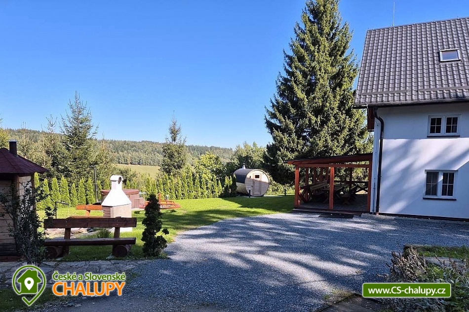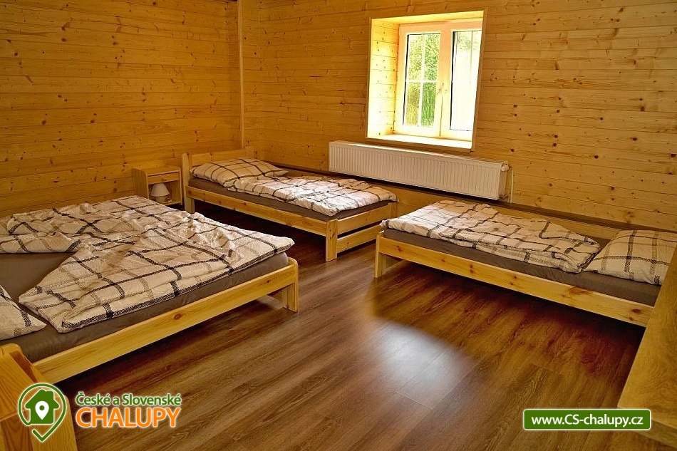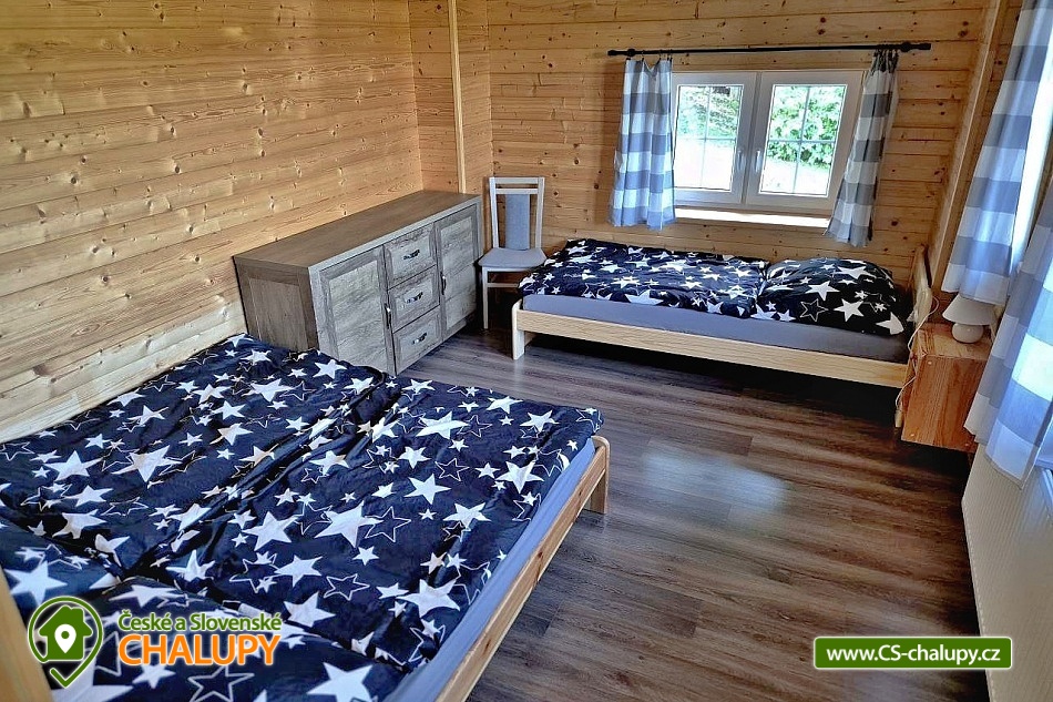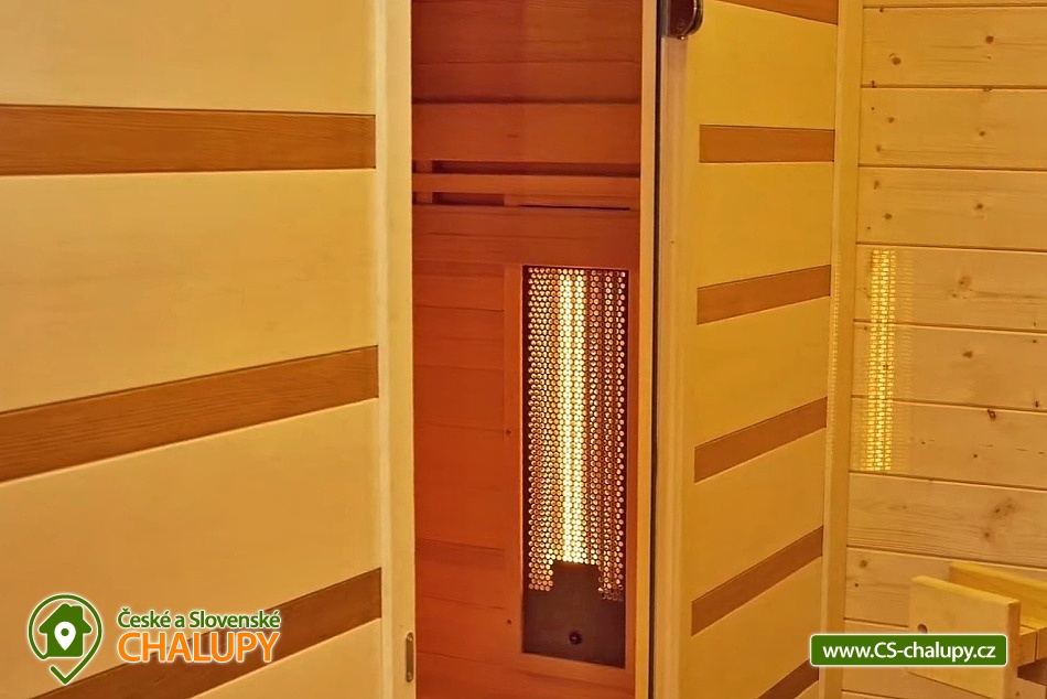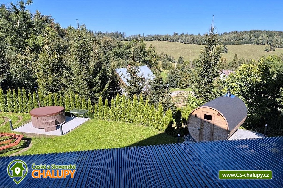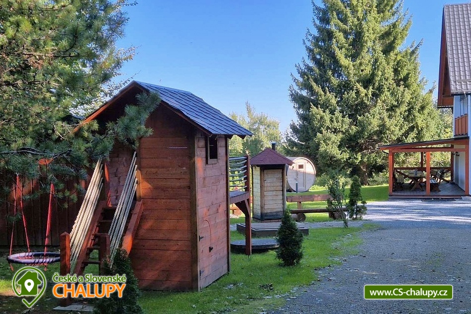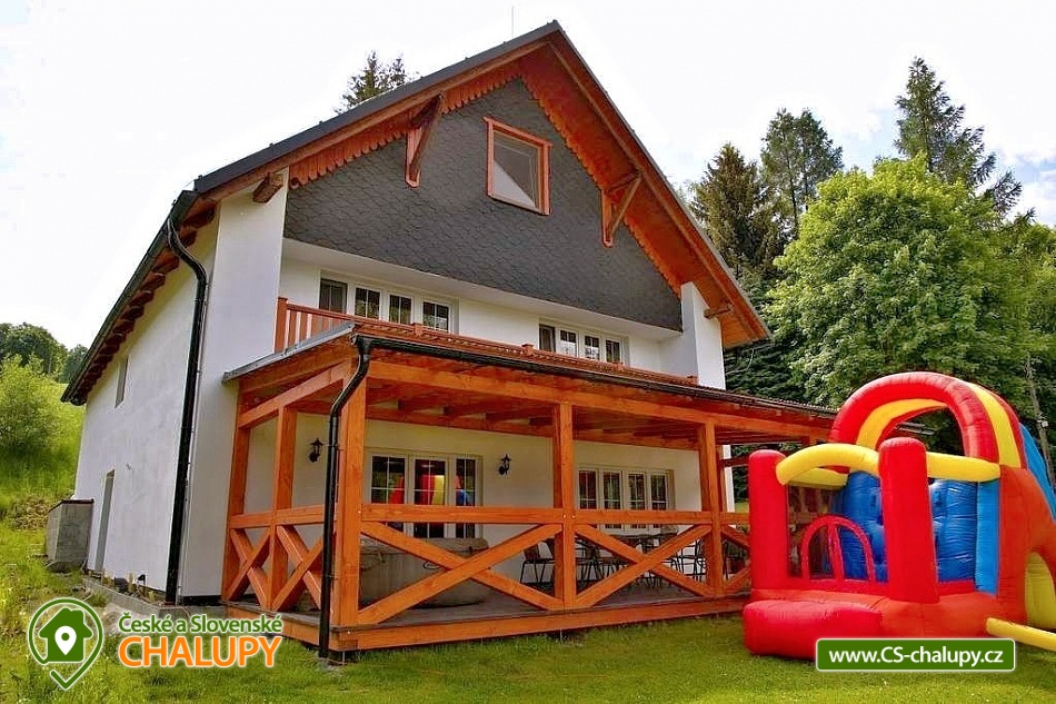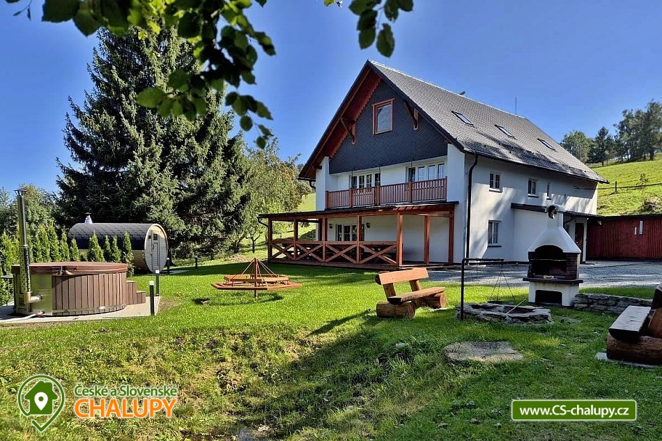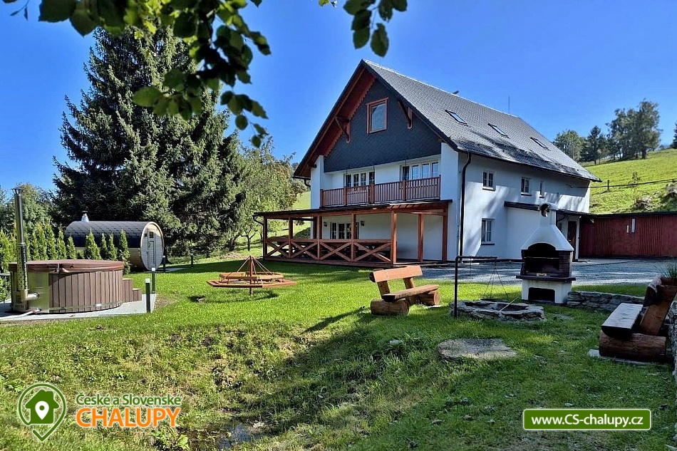 Wellness chalupa (finská sauna + vyhřívaný koupací sud + vířivka) vybavená pro maximální pohodlí i rodinné pobyty (nafukovací skákací hrad). Poloha v klidné části chatové osady nedaleko zámku Janský vrch v Rychlebských horách. Na své si u nás přijdou milovníci přírody pěší turistiky i na kolech, a nebo jen relaxovat a kochat se krásným výhledem na okolní pastviny a les. Maximální důraz klademe na čistotu - spokojení hosté ocení naší práci. Chalupa k pronájmu poskytuje ubytování pro až 22 osob v 7 ložnicích. POPIS: Přízemí - ložnice (manželská postel, 2 osoby). Obývací pokoj (rozkládací gauč), TV a SAT. Plně vybavená kuchyně (keramická varná deska, elektrická trouba, mikrovlnná trouba, rychlovarná konvice, lednice s mrazákem, kávovar na kapsle i myčka nádobí). Patro - pokoj č.1. (manželská postel + jednolůžko). Pokoj č.2.- (manželská postel). Pokoj č.3.- (manželská postel). Pokoj č.4. (manželská postel + jednolůžko). Pokoj č.5. (manželská postel + 2x jednolůžko). Pokoj č. 6. (manželská postel + 2x jednolůžko). V patře se dále nachází společenská místnost, kde si můžete posedět na pohovce nebo zahrát stolní fotbal. Sociální zařízení: 2x koupelna (sprchový kout) + 2x WC. Vytápění: krbová kamna + automatický kotel na pelety. Parkování přímo u chalupy, 10 parkovacích míst. Na zahradě u chalupy je pro Vaše děti skákací hrad (za poplatek) a pískoviště. Pod altánkem se nachází stolní tenis a šipky. Na zahradě můžete hrát také petangue, kriket nebo frisbee. Vaše sportovní potřeby můžete odložit do kůlny. V letních dnech můžete využít gril na dřevěné uhlí nebo ohniště. Dopřejte si točené pivo na terase s venkovním posezením - můžeme Vám zapůjčit pípu na čepování piva. Během pobytu Vás nebude nikdo rušit neboť na chalupě je velmi špatný mobilní signál a dokonce zde nemáme ani internet. Okolí: Rychlebské stezky - cykloturistika, Lesní bar Stříbrný pramen - Zálesí, který provozuje sám majitel chalupy. Dále zámek Jánský Vrch v Javorníku, Borůvková hora - nedaleký 899 m vysoký vrchol s možností návštěvy rozhledny, Tančírna v Račím údolí - zrekonstruovaná architektonická památka (koncerty, výstavy). Krytý bazén Javorník, Koupaliště Červenka a Otmuchowské jezero. V zimě skiareály: Filipovice, Horní Lipová, Ladek Zdrój. Těšíme se na Vás u nás.