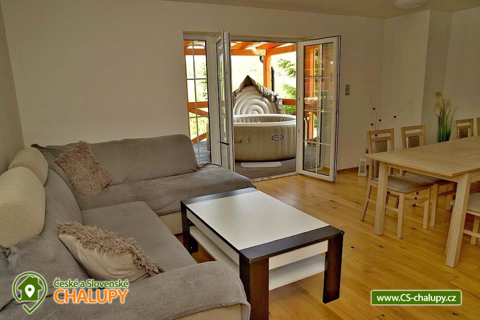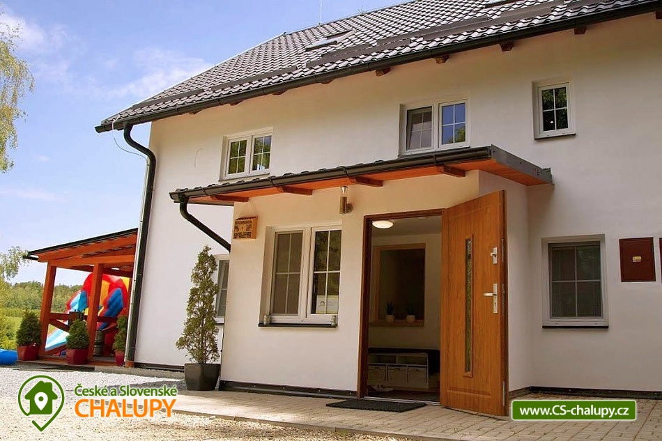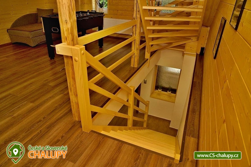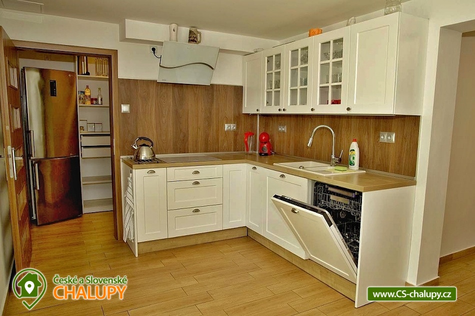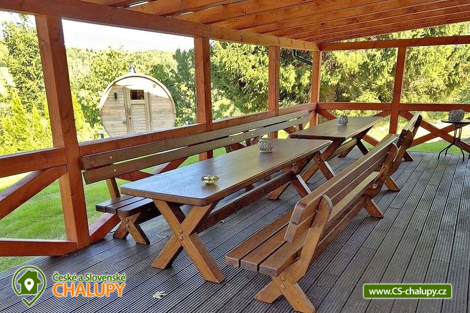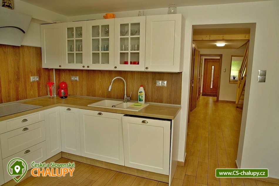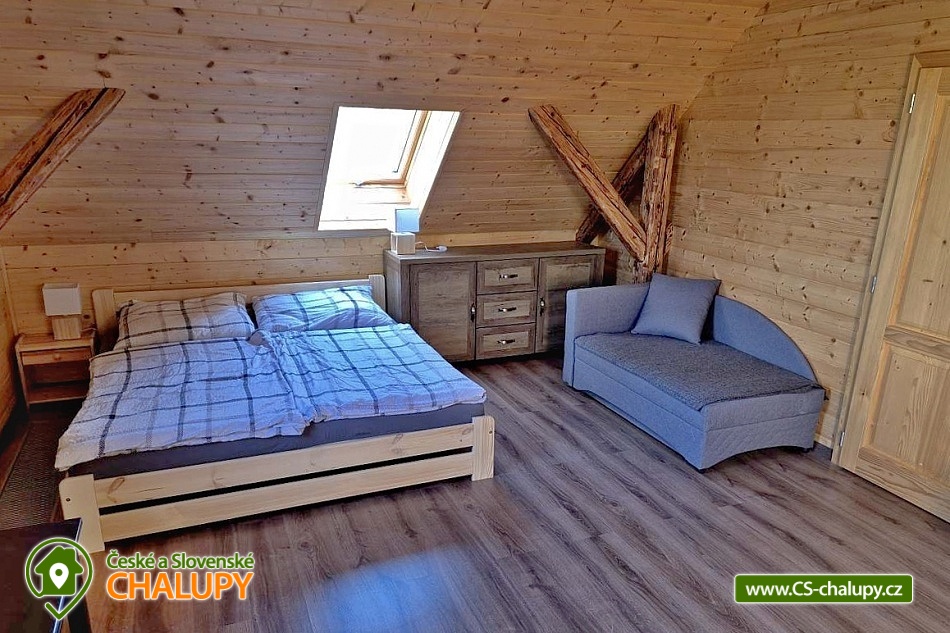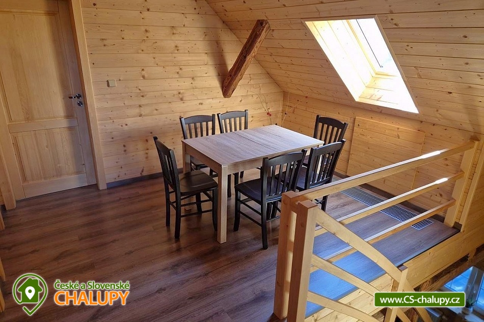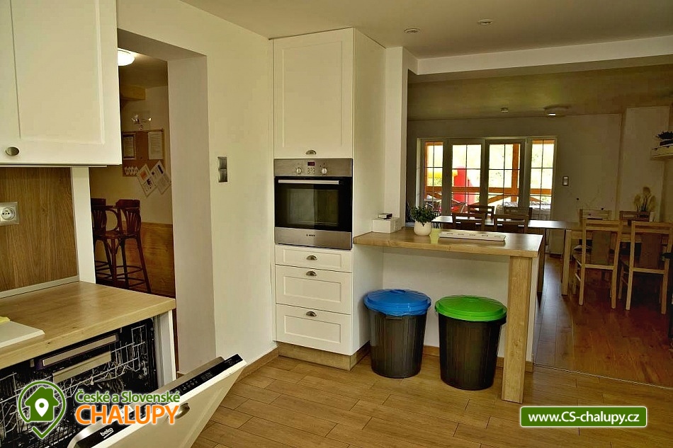 Wellness chalupa (finská sauna + vyhřívaný koupací sud + vířivka) vybavená pro maximální pohodlí i rodinné pobyty (nafukovací skákací hrad). Poloha v klidné části chatové osady nedaleko zámku Janský vrch v Rychlebských horách. Na své si u nás přijdou milovníci přírody pěší turistiky i na kolech, a nebo jen relaxovat a kochat se krásným výhledem na okolní pastviny a les. Maximální důraz klademe na čistotu - spokojení hosté ocení naší práci. Chalupa k pronájmu poskytuje ubytování pro až 22 osob v 7 ložnicích. POPIS: Přízemí - ložnice (manželská postel, 2 osoby). Obývací pokoj (rozkládací gauč), TV a SAT. Plně vybavená kuchyně (keramická varná deska, elektrická trouba, mikrovlnná trouba, rychlovarná konvice, lednice s mrazákem, kávovar na kapsle i myčka nádobí). Patro - pokoj č.1. (manželská postel + jednolůžko). Pokoj č.2.- (manželská postel). Pokoj č.3.- (manželská postel). Pokoj č.4. (manželská postel + jednolůžko). Pokoj č.5. (manželská postel + 2x jednolůžko). Pokoj č. 6. (manželská postel + 2x jednolůžko). V patře se dále nachází společenská místnost, kde si můžete posedět na pohovce nebo zahrát stolní fotbal. Sociální zařízení: 2x koupelna (sprchový kout) + 2x WC. Vytápění: krbová kamna + automatický kotel na pelety. Parkování přímo u chalupy, 10 parkovacích míst. Na zahradě u chalupy je pro Vaše děti skákací hrad (za poplatek) a pískoviště. Pod altánkem se nachází stolní tenis a šipky. Na zahradě můžete hrát také petangue, kriket nebo frisbee. Vaše sportovní potřeby můžete odložit do kůlny. V letních dnech můžete využít gril na dřevěné uhlí nebo ohniště. Dopřejte si točené pivo na terase s venkovním posezením - můžeme Vám zapůjčit pípu na čepování piva. Během pobytu Vás nebude nikdo rušit neboť na chalupě je velmi špatný mobilní signál a dokonce zde nemáme ani internet. Okolí: Rychlebské stezky - cykloturistika, Lesní bar Stříbrný pramen - Zálesí, který provozuje sám majitel chalupy. Dále zámek Jánský Vrch v Javorníku, Borůvková hora - nedaleký 899 m vysoký vrchol s možností návštěvy rozhledny, Tančírna v Račím údolí - zrekonstruovaná architektonická památka (koncerty, výstavy). Krytý bazén Javorník, Koupaliště Červenka a Otmuchowské jezero. V zimě skiareály: Filipovice, Horní Lipová, Ladek Zdrój. Těšíme se na Vás u nás.