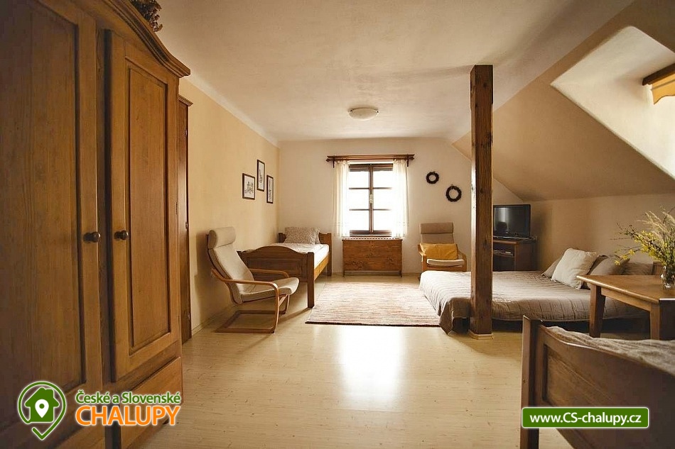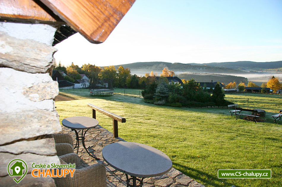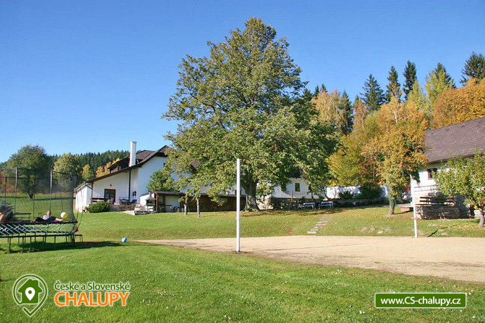 Chalupa na samotě s vnitřním bazénem nedaleko rozhledny Javorník a hradu Kašperk, poloha na jižním svahu Javornického masivu v krásné přírodě NP Šumava. Kapacita objektu je až 15 osob v 5 ložnicích s TV a koupelnou. Celkem je k dispozici 3x třílůžková ložnice, 1x čtyřlůžková ložnice a 1x dvoulůžková ložnice. U čtyř ložnic je po domluvě možnost další přistýlky. Dětská postýlka je k zapůjčení. Kvalitní postele, přikrývky a zdravotní matrace, spolu s klidem a horským vzduchem zajistí příjemný spánek. Každý pokoj má vlastní koupelnu se sprchovým koutem nebo vanou a WC. K dispozici je ložní prádlo, ručníky, fén a pantofle. Dominantou chalupy je prostorná společenská místnost s ochozem - originální kamna s krbovou vložkou a vyhřívanou lavicí, sedací souprava, jídelní stůl a kulečník "karambol" s hrací plochou 230 x 115 cm. Součástí chalupy je plně vybavená kuchyň (varná deska, rychlovarná konvice, lednice, myčka, mikrovlnná trouba, kávovar, kuchyňské potřeby a nádobí i dětská jídelní židlička). V celém objektu je k dispozici WIFI připojení na internet. Přímo v chalupě si lze užívat také koupání ve vnitřním bazénu, 9m dlouhém a celoročně ohřívaném na teplotu 29°C. Přímo z bazénu lze vstoupit do zahrady s posezením. Venku na prostorném travnatém pozemku je připraveno několik možností pro posezení - částečně zastřešená vyhřívaná terasa, otevřená terasa s grilem nebo venkovní ohniště. Součástí zahrady je také posezení u lípy s dokonalým výhledem, houpačka, bylinková a zeleninová zahrádka. Těšit se můžete na úchvatný panoramatický výhled od Boubína po Churáňov a Popelnou horu. Sportovce potěší pískové hřiště na nohejbal nebo volejbal a velká venkovní trampolína (5m). Síť a míče jsou k dispozici. Parkovat lze přímo u objektu. V okolí chalupy možnost turistiky, cykloturistiky, koupání, lyžování, běžkování a houbaření. Mezi možnosti koupání patří např.: koupaliště Rohanov, koupaliště Vimperk, Rybník Zdíkovec, Aquaparky Sušice nebo Horažďovice atd. K dispozici jsou blízká lyžařská střediska: Zadov, Nové Hutě, Javorník nebo Kašperské hory. K výletům v okolí láká lanové centrum Zadov, Hrad Kašperk, Hrad Rabí, rozhledny Zadov, Javorník, Boubínský prales, Šumavská jezera - Černé, Čertovo, Laka, Prášilské, Schwarzenberský plavební kanál - technická památka Svatobor a Sedlo, dále historické centrum města Vimperk, Tvrz Volyně, Vodní mlýn Hoslovice nebo Singltrek Prachatice. Těšíme se na Vás u nás.