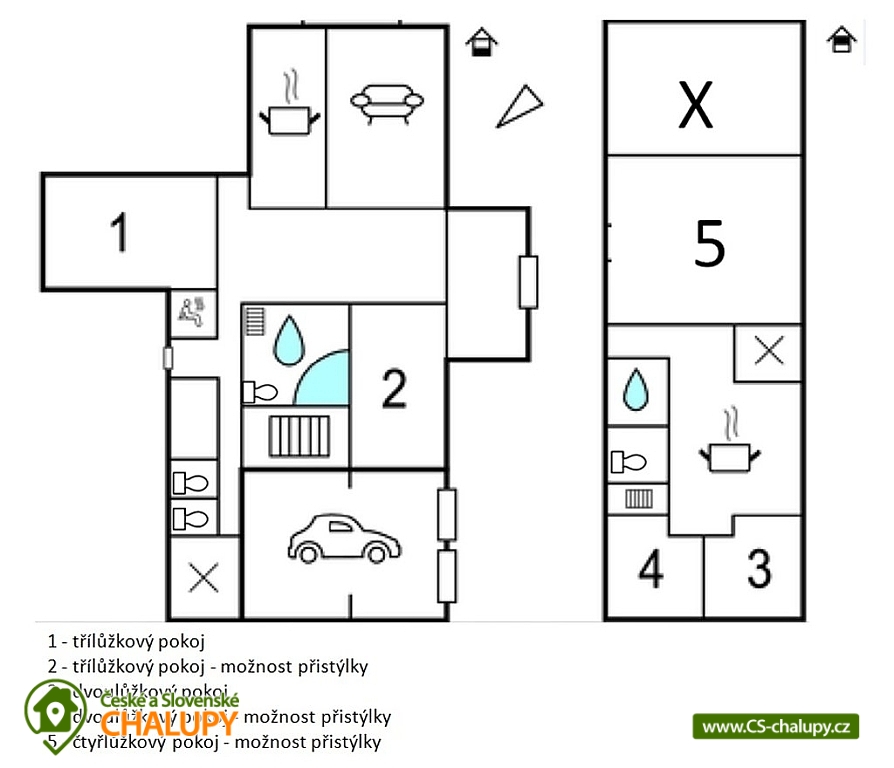 - 6 ložnic: 1x 4+1, 1x 3, 1x 3+1, 1x 2, 1x 2+1, 1x 0+1