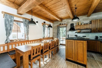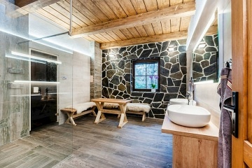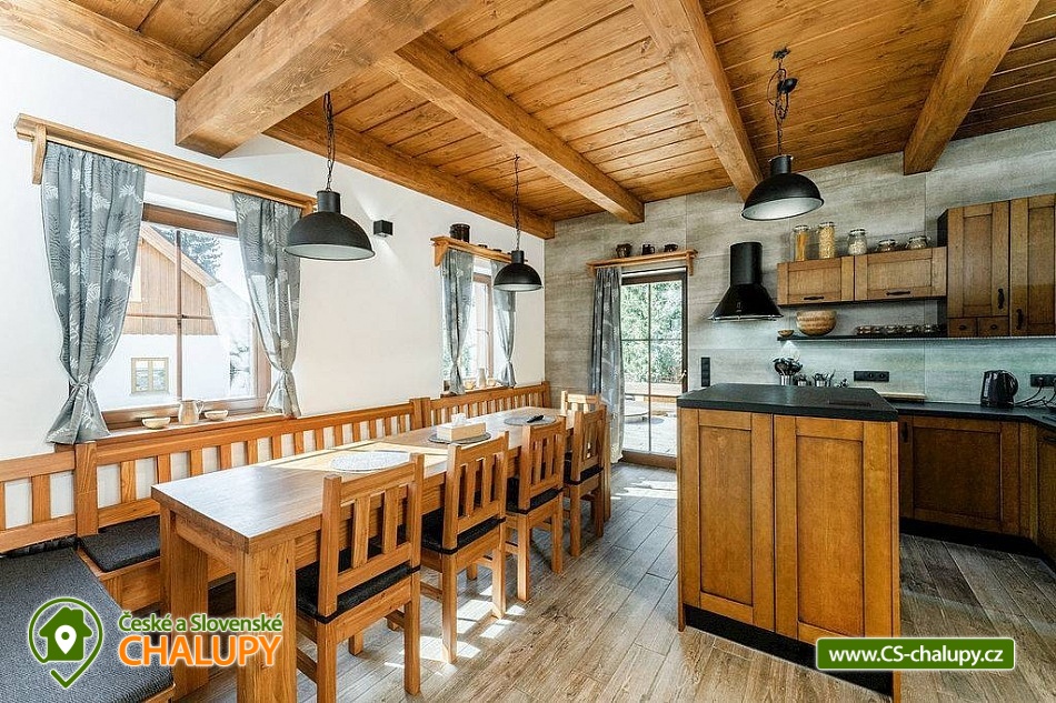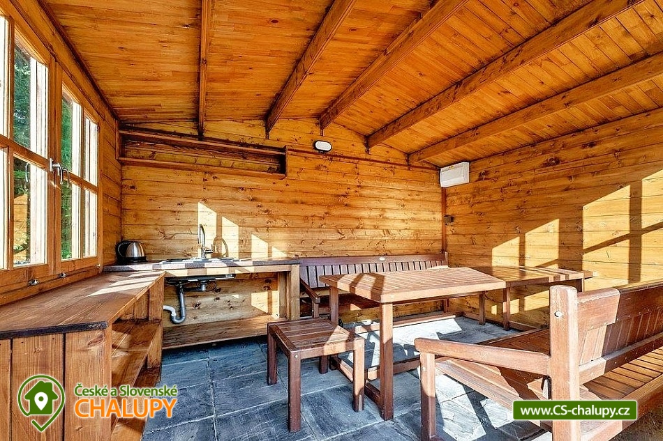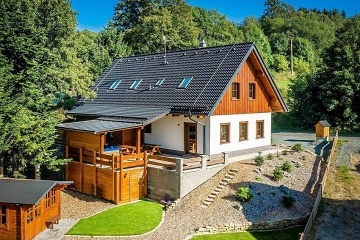 Luxusně vybavená Rodinná wellness chalupa - Pod Panským kopcem (se saunou a vířivkou) se nachází na krásném a klidném místě v horní části obce Olešnice v Orlických horách, která je součástí Chráněné krajinné oblasti Orlické hory v nadmořské výšce 610 m n. m. Místo je svou polohou ideální pro cykloturistiku, pěší turistiku, sjezdové i běžecké lyžování. Chalupa poskytuje ubytování pro až 18 osob, po domluvě jsou možné přistýlky. K dispozici jsou čtyři 4 -lůžkové ložnice (2x dvoulůžko) a jedna dvoulůžková ložnice (1x dvoulůžko + rozkládací sedací souprava po domluvě jako přistýlka pro děti). Jedna z ložnic je v přízemí a další v patře. Všechny ložnice jsou standardně vybavené včetně povlečení. K zapůjčení je také dětská postýlka. Dominantou chalupy je společenská místnost propojená s jídelnou. Zde je k dispozici televize s kabelovým příjmem, gauč a jídelní posezení. Místnost krásně doplňují velká kachlová kamna s ležením pro 2 osoby. Se společenskou místností je propojená plně vybavená kuchyň (keramická varná deska, kávovar, elektrická trouba, mikrovlnná trouba, lednička, myčka na nádobí a rychlovarná konvice). V chalupě najdete ještě jeden kuchyňský kout vybavený lednicí, pračkou, sušičkou a výčepním zařízením. V celém objektu je k dispozici WIFI připojení na internet. Relax si můžete dopřát ve finské sauně s odpočinkovou místností. V podkroví chalupy se mohou děti těšit na dětskou hernu s hračkami, sedacími vaky, televizí s kabelovým příjmem a se společenskými hrami. V chalupě je k dispozici také úschovna pro lyže a kola. Sociální zařízení zahrnuje dvě koupelny se sprchovým koutem, umyvadlem, sušákem na prádlo a ručníky. V chalupě se nacházejí dvě samostatné toalety. Vytápění je řešeno elektrickým podlahovým vytápěním a kachlovými kamny. Příjemné chvíle můžete trávit na zastřešené terase s grilem a venkovním posezením. Také lze posedět u ohniště. Odpočívat můžete ve vířivce pro 5 osob. Pro děti jsou k dispozici prolézačky se skluzavkou. Parkovat lze přímo u objektu. V okolí chalupy možnost turistiky, cykloturistiky, koupání, houbaření, lyžování a běžkování. Mezi možnosti koupání patří např.: koupaliště Bystré, bazén Deštné v Orlických horách, aquapark Kudowa Zdroj, koupaliště Dobré, bazén Náchod, koupaliště Náchod, bazén Nové Město nad Metují, Přírodní koupaliště Radków, koupaliště Dobruška, atd. V zimním období blízká lyžařská střediska: Olešnice v O.h., Kačenčina sjezdovka - Olešnice v O.h., Hartman - Olešnice v O. h., Čihalka - Olešnice, Sedloňov, Šerlišský mlýn, Nový Hrádek - Panská stráň a další. K výletům láká zámek Nové Město nad Metují (16,5 km), zámek Náchod (18,5 km), zámek a obora Opočno (23 km), Babiččino údolí, Ratibořice (29,5 km), zámek Rychnov nad Kněžnou (34,5 km) či skály Adršpach, Teplice (46 km). Těšíme se na Vás u nás.