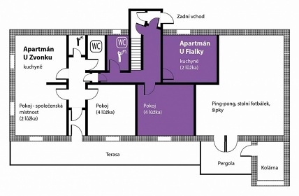 Chalupa Žďárské vrchy - Roženecké Paseky v obci Věcov je přímo stvořená pro strávení klidné a příjemné dovolené. Žďárské vrchy, které ji obklopují, jsou vyhledávanou oblastí v létě i v zimě. Přijeďte si k nám odpočinout a naplno si užít své volné dny. Chalupa poskytuje ubytování pro až 23 osob ve 4 apartmánech. Každý apartmán má vlastní vybavenou kuchyni s lednicí, mikrovlnnou troubou, sporákem, varnou konvicí, hrnci i nádobím. Samozřejmostí je také sociální zařízení a vlastní vchod pro každý apartmán. Apartmán Zvonek: Bezbariérový apartmán v přízemí s vlastním vstupem pro 4 až 6 hostů. Tvoří ho samostatný pokoj se 4 lůžky, společenská místnost, kde se vyspí další 2 hosté, velká kuchyně a sociální zařízení. Kuchyni od společenské místnosti odděluje posuvná stěna. Apartmán Fialka: Apartmán v přízemí pro 4 až 6 osob tvoří prostorný pokoj se 4 lůžky a samostatná kuchyně s dalšími 2 lůžky. Příjemné zázemí doplňuje koupelna s vanou a toaleta. Apartmán Kopretina: Apartmán v podkroví pro 3 hosty. Kromě pokoje s lůžky v něm najdete také velkou kuchyni, sociální zařízení a předsíňku. Apartmán Slunečnice: Největší z našich apartmánů pro 8 hostů najdete v podkroví. Má tři samostatné pokoje, dva menší s 2 lůžky, jeden větší se 4 lůžky. Krajina Žďárských vrchů s krásnými lesy, skálami a rybníky je půvabná v každém ročním období. V létě jsou Žďárské vrchy ideální pro pěší turistiku a cykloturistiku. Nejčastějšími cíli pěších výletů našich hostů jsou zřícenina hradu Štarkov, Bohdalecká skála, Devět skal, Žákova hora, skála Prosička a další. V blízkém okolí naší chalupy je také vyhlášený houbařský ráj. Rájem cyklistů jsou zase singltreky v nedaleké Cyklo aréně Vysočina v Novém Městě na Moravě, kde se jezdí i závody Světového poháru na horských kolech. Milovníci jízdy v terénu tu najdou téměř 30 kilometrů stezek rozdělených do 5 stupňů obtížnosti.