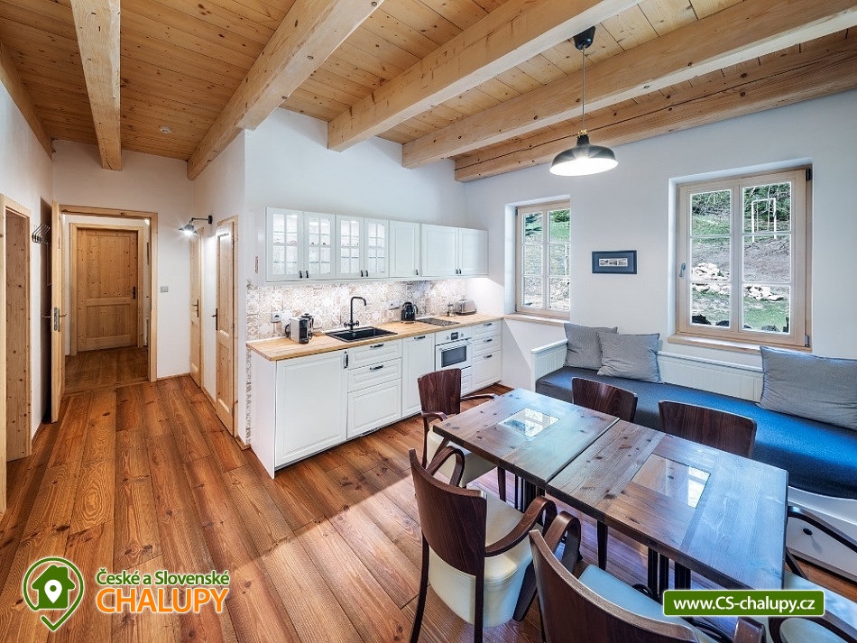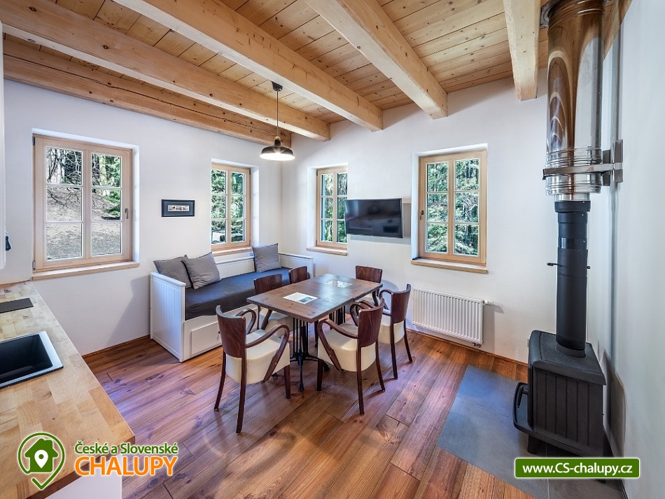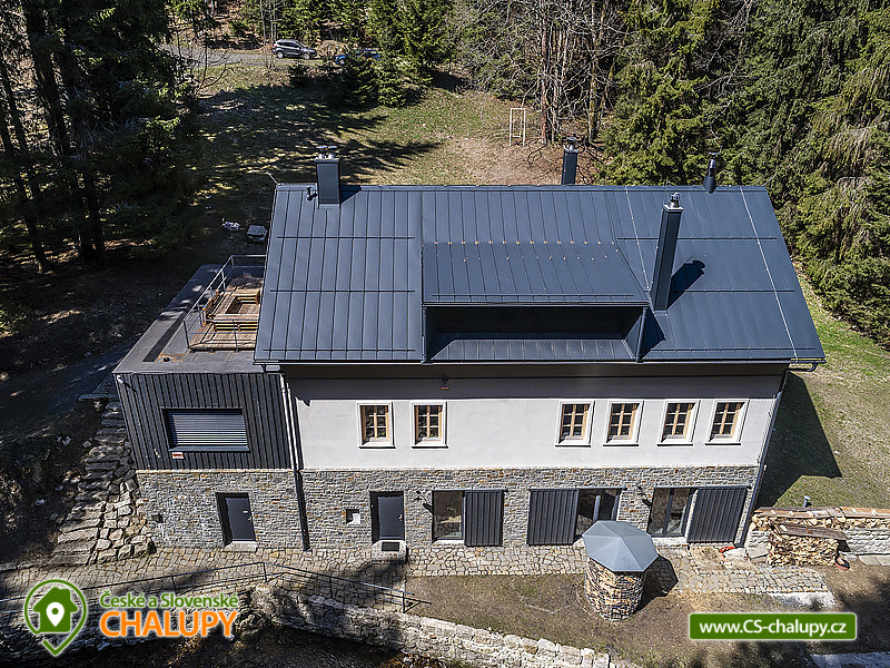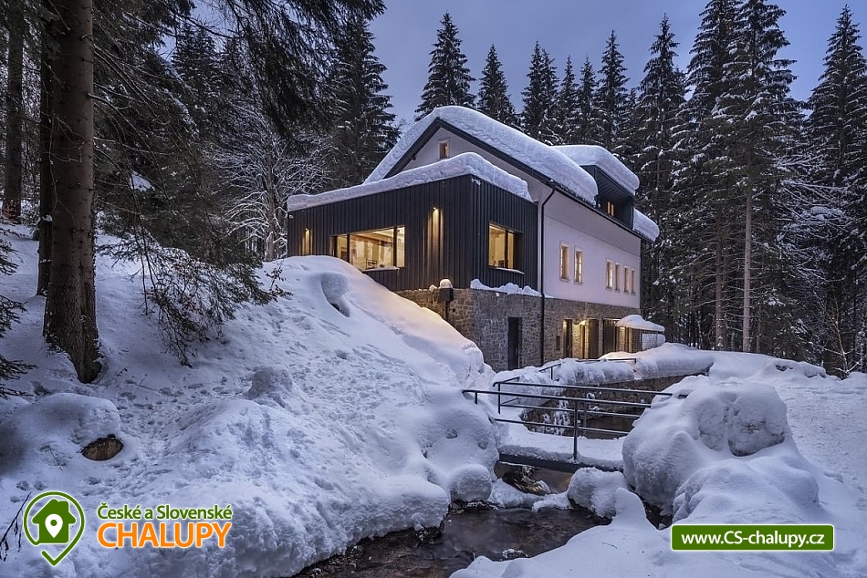 Chalupa u Tesařovského potoka - Krkonoše a Jizerky. Chalupa se saunou se nachází na romantické samotě v lese na rozhraní Krkonošského národního parku a Chráněné krajinné oblasti Jizerské hory. Chalupa nabízí ubytování ve dvou nadstandardně zařízených apartmánech. Každý apartmán umožňuje komfortní ubytování čtyřem osobám, s přistýlkami pak šesti osobám (apartmán L) , resp. sedmi osobám (apartmán P). Některé přistýlky jsou vhodné pouze pro děti do 12-ti let. Maximální celková kapacita obou apartmánů je tedy 13 osob (max. 10 dospělých). Apartmán "L" má dvě samostatné ložnice (každá je vybavena manželskou postelí), jídelnu s kuchyňským koutem, sprchový kout a dvě toalety. Kuchyňský kout je vybaven veškerým potřebným nádobím, včetně rychlovarné konvice a opékače toastů, el. varnou deskou, kombinovanou troubou (elektrický gril, mikrovlnka), lednicí, myčkou nádobí, odsavačem par, krbovými kamny, TV a také kapslovým kávovarem Nespresso. V apartmánu je přistýlka (rozkládací gauč pro dvě osoby) situována v jídelně. Přistýlka (pro dvě osoby) je vhodná jak pro děti, tak pro dospělé. Apartmán "P" má dvě samostatné ložnice (každá je vybavena manželskou postelí), jídelnu s kuchyňským koutem, sprchový kout a dvě toalety. Kuchyňský kout je vybaven veškerým potřebným nádobím, včetně rychlovarné konvice a opékače toastů, el. varnou deskou, kombinovanou troubou (elektrický gril, mikrovlnka), lednicí, myčkou nádobí, odsavačem par, krbovými kamny, TV a také kapslovým kávovarem Nespresso. V apartmánu je přistýlka pro dvě osoby na tzv. hambálku (půda) přístupném po mlynářských schodech. Přistýlka je vhodná zejména pro děti, ale i pro sportovně založené dospělé menšího vzrůstu. V případě potřeby je možné jako další lůžko využít i gauč v jídelně s kuchyňským koutem. Kromě popsaných apartmánů disponuje chalupa vlastní kombinovanou saunou (klasická + infrazářiče) pro max. 6 osob a společenskou místností pro až 13 osob. Ve společenské místnosti jsou k dispozici šipky, karty, společenské hry a ozvučení (CD přehrávač se zesilovačem a reprobednami), na vyžádání pak projektor a promítací plátno. V celém objektu je Wi-Fi připojení. Přímo na místě lze zakoupit omezený sortiment nápojů (víno, pivo, balenou vodu a kapsle do kávovaru Nespresso). Kola, lyže, kočárek, atp. lze uschovat v samostatné, alarmem chráněné a vyhřívané místnosti. Přímo před objektem lze zdarma parkovat (chalupa je přístupná po lávce přes Tesařovský potok). U objektu je dále k dispozici menší hřiště (cca 12 x 6 m) na volejbal, badminton nebo jiné sporty a také kryté venkovní posezení. Síť, míč, rakety na badminton, atp. jsou zdarma k zapůjčení v chalupě. Rovněž tak plynový zahradní gril (za poplatek). V celém objektu je zákaz kouření! V okolí: Oblíbené lokality jsou na dosah nejen na území Jizerských hor, ale i Krkonoš mezi nejznámější z nich patří osada Jizerka, rašeliniště na Smědavě, rozhledna Štěpánka, golfové hřiště Mýtiny (Harrachov), Mumlavský vodopád, Dvoračky, vodní nádrž Souš, pramen Labe, naučná stezka Jizerských hor, a mnoho dalších. Navštívit se dá taky polská strana - třeba Szklarki vodopád a Sklarska Poręba. Chalupa je ideálním východiskem pro letní i zimní sporty, hlavně pěší turistiku, cykloturistiku, golf, běžecké a sjezdové lyžování. Zimních radovánek si můžete do sytosti užít na sjezdovkách v Harrachově, Příchovicích a Rejdicích. Na běžky se můžete vydat třeba po proslulé Jizerské magistrále. V letních měsících je možné vyrazit za vodními hrátkami v okolí nebo na golf v Harrachově, kde najdete také squashové kurty nebo fitness centrum. Tenisové kurty jsou pak v nedalekém Tanvaldu. Na své si přijdou také milovníci cykloturistiky a samozřejmě houbaři.