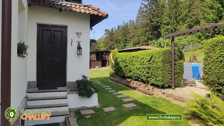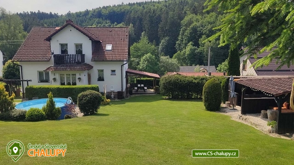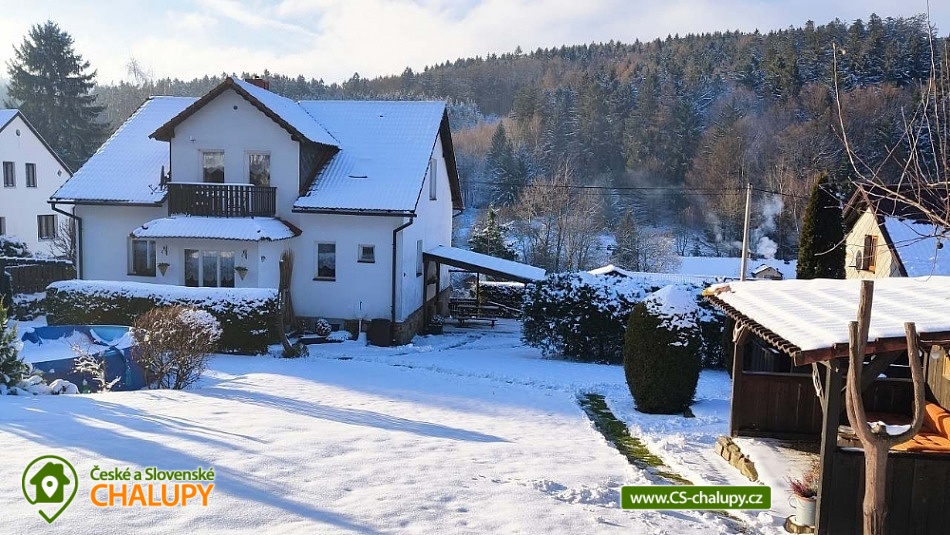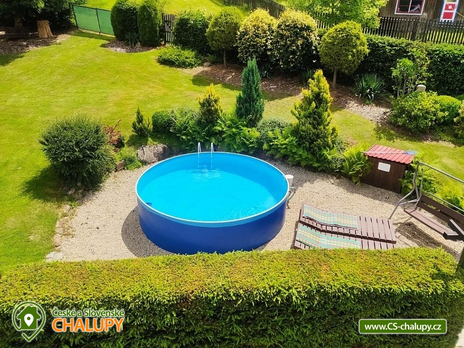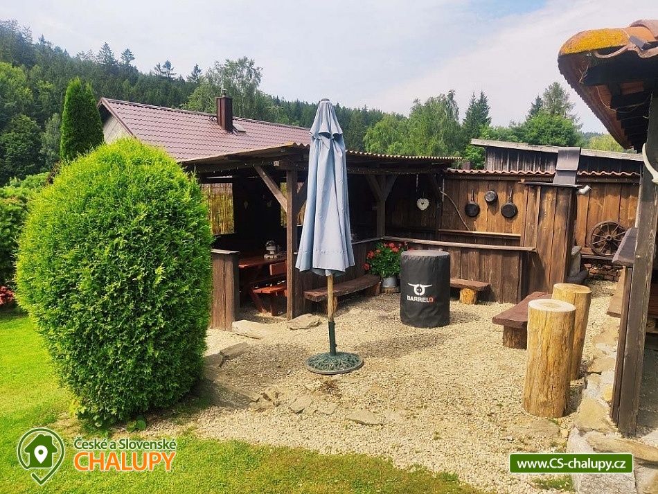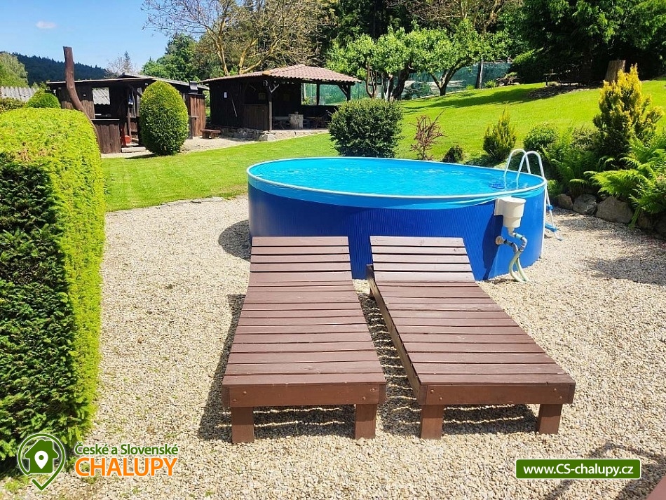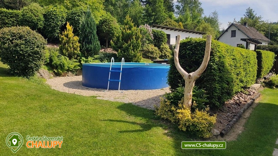 Chalupa s bazénem, koupacím sudem a infra-saunou v CHKO Český les na Šumavě a - CHKO Český les. Chalupa k pronajmutí v lokalitě měst Domažlice, Horšovský Týn a Kdyně. Chalupa nabízí ubytování pro až 18 osob v 5 ti samostatných pokojích, kdy žádný není průchozí a tudíž i větší skupina osob má v pokojích soukromí. V přízemí chalupy je velká společenská místnost s TV a satelitem, dětským koutkem a knihovnou. Společenská místnost sousedí s plně vybavenou kuchyní - plynový sporák, lednice, mrazák, elektrická konvice a mikrovlnná trouba. V přízemí je dále koupelna s vanou a samostatné WC. V patře jsou 3 ložnice (1. se 4 lůžky + sedací souprava, 2. ložnice se 4 lůžky, 3. ložnice se 3 lůžky. V patře je také druhá kuchyň s plynovým sporákem, ledničkou, el. konvicí a druhá koupelna se sprchovým koutem a WC. Vytápění chalupy je řešeno krbovými kamny a patro je vytápěno ústředním topením napojeným na krbová kamna. Ve sklepních prostorech naleznete bar s posezením kde je k dispozici výčepní zařízení na pivo. Pro soutěživé jsou připraveny šipky, stolní fotbal a v samostatné místnosti stolní tenis. Dále si můžete prohřát tělo v infrasauně, která je umístěna v samostatné místnosti nebo ve vyhřívaném koupacím sudu. Místnost pro uskladnění kol je také samozřejmostí. Na velké, udržované zahradě naleznete nadzemní bazén o průměru 4,5 m a lehátka na opalování. V dětské části zahrady naleznou děti pískoviště s hračkami, houpačkami a rodiče je mohou v klidu a pohodě sledovat z posezení v dětské části zahrady. Dalším posezením na zahradě jsou dvě zastřešené pergoly s krbem a samostatným grilem pro opékání a grilování. Parkování je možné přímo u objektu. Okolí chalupy je ideální prostředí pro odpočinkovou dovolenou a sběr hub ve velmi krásných lesích. Výborné podmínky pro turistiku po chráněné krajinné oblasti Český les (výšlapy na Lysou horu, Herštejn, Čerchov – nejvyšší vrchol v Českém lese s rozhlednou, prameny Radbuzy) a cykloturistice (značená síť cyklotras). Koupání: nově otevřený aqaupark Waldmünchen (12 km - Německo), Poběžovice - přírodní koupaliště (7 km), Babylon - rekreační středisko (20 km), Domažlice - krytý bazén (15 km), aqaupark Kdyně (25 km). Jízda na koni v místě (0,2 km). Tenisové kurty v Poběžovicích (7 km). Turistické cíle: augustiniánský klášter ze 14.století v Pivoni, zámek Poběžovice a Horšovský Týn, Domažlice (muzeum Chodska, náměstí s krásnými štítovými domy), Kozinův statek v Újezdě, Muzeum spisovatele J. Š. Baara v Klenčí pod Čerchovem, rekreační rybník Babylon a další. Doporučujeme také výlet na Haltravu. Haltrava je součástí souvislého pásma kopců v chráněné krajinné oblasti Český Les, který se zvedá severozápadním směrem nad městečkem Klenčí pod Čerchovem. Pásmo kopců tvoří vrcholky Velká skála (852 m), Škarmanka (888 m), Tyrolka (865 m), Haltrava (882 m) a Sádek (854 m). Na stráních kopců je smíšený a v některých místech i pralesovitý podrost. Kolem vrcholku Sádek je oblast chráněného území Skalky na Sádku. V chráněném území rostou především buky a občas nějaký smrk na křemenném podloží. Na vrcholku kopce Sádek měli Chodové své strážní místo. Výchozím bodem k návštěvě výše jmenovaného horkého masívu je místo zvané Výhledy (702 m), jihozápadním směrem od města Chodov.