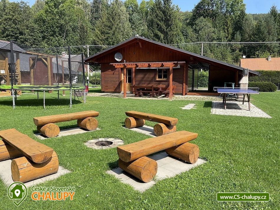 Dvě chaty s bazénem a saunou u Lipovské stezky - Horní Lipová - Jeseníky. Chaty nabízí bezbariérové ubytování ve dvou samostatných objektech s vlastním parkovištěm. Chaty jsou identické, vzdáleny od sebe cca 10 m, obě mají kapacitu 8 osob. Celkem tedy ubytují až 16 osob. Pronajímáme je každou zvlášť, ale i obě dohromady. V každé jsou dvě dvoulůžkové a jedna čtyřlůžková ložnice, plně vybavená kuchyň (lednice s mrazákem, sklokeramická deska, myčka, kávovar, varná konvice, topinkovač, mikrovlnná trouba, pečící trouba), která je spojena se společenskou místností, kde je velký jídelní stůl, LCD televizor a kachlová kamna. V každé chatě je koupelna se sprchovým koutem s WC, pračkou a fénem a jedno samostatné WC. Vytápění je řešeno elektrickým kotlem a výkonnými kachlovými kamny. Čeká vás zde relaxace ve vlastní venkovní finské sauně, pohodička pod zastřešenou teráskou s grilem nebo posezení pod širým nebem u otevřeného ohniště. Každá chata má svou velkou trampolínu, pingpongový stůl, venkovní ohniště i ruské kuželky. Chaty mají část zahrady společnou, kam se zejména mohou těšit malí návštěvníci, kde je velké dětské hřiště s houpačkami, lezeckou stěnou, skluzavkou a pískovištěm, workoutové hřiště a nadzemní bazén. V období květen - říjen je u našeho ubytování k dispozici venkovní občerstvení s cukrovinkami, pitím, horkou čokoládou a zrnkovou kávou. V blízkém okolí je pro vás velké množství vyžití cykloturistika, turistika, houbaření, lyžování i běžkování. Těšíme se na Vás u nás!
