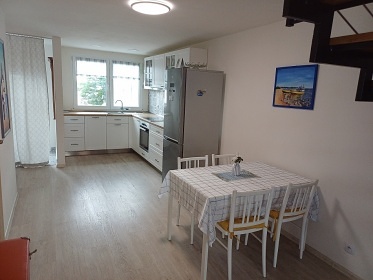 Chata a vinný sklep přímo u vody - na břehu Novomlýnských nádrží s krásným výhledem na Pálavu. Domeček s vinným sklepem je spojením kouzla vodního živlu a přívětivosti vinařského kraje. Domek je dvoupatrový, s vinným sklepem, s oplocenou zahrádkou a posezením na terase. V přízemí je plně vybavená kuchyň s jídelním koutem, sociální zařízení se sprchou a prostor pro posezení s gaučem a dvěma křesílky. V přízemí je podlahové topení, atmosféru ale jistě zútulní i krbová kamna. Televize a Wi-fi jsou k dispozici. Kuchyňský kout je vybavený linkou, elektrickou troubou, keramickou varnou deskou, je zde lednice a mrazák, myčka nádobí, rychlovarná konvice a množství kuchyňských pomůcek. V prvním patře jsou dva pokoje. Ložnice s manželskou postelí a balkonem, s výhledem na vodní plochu. Druhý pokoj, kde mohou přespat 4 nocležníci, má manželskou postel a dvě samostatná lůžka. Takže pohodlné ubytování pro 6 lidí. Pokud Vás bude víc, lze zajistit ubytování u našich milých sousedů. Určitě si zamilujete terasu pod pergolou, kde budete relaxovat se sklenkou vína a s dobrotami z grilu. Genius loci je umocněn výhledem na vodní hladinu. Vinný sklípek je k dispozici, i posezení pro více osob. Parkování pro 1 auto je přímo před sklepem, pro více vozů „za rohem“, na malém parkovišti. Nudit se nebudete! Vodní radovánky si můžete užít přímo z mola (5 m od objektu) i přímo z vody. Po jezeře pravidelně jezdí parník a nabízí vyhlídkové okružní plavby, i s občerstvením. Vodní sporty naleznete v Aqualand Moravia. Kdo rád rybaří, přijde si také na své. Výjimečná pálavská krajina je ideální pro turistiku a cyklistiku. Cyklostezka vede přímo u sklepa. Tradiční vinařská oblast napěchovaná historií nabízí zážitky nejen v podobě památek, ale i ochutnávek vín. Těšíme se na Vás u nás.
