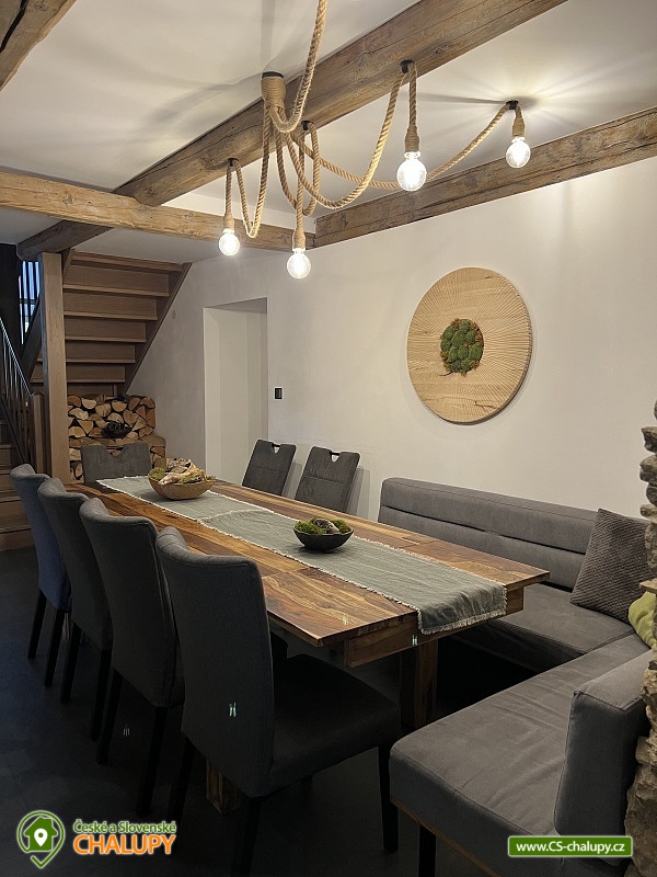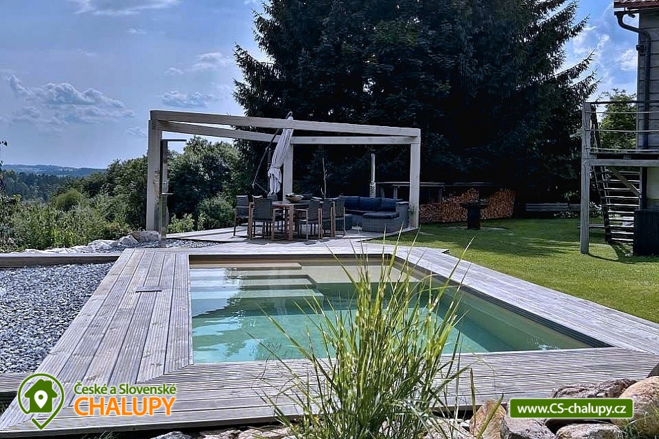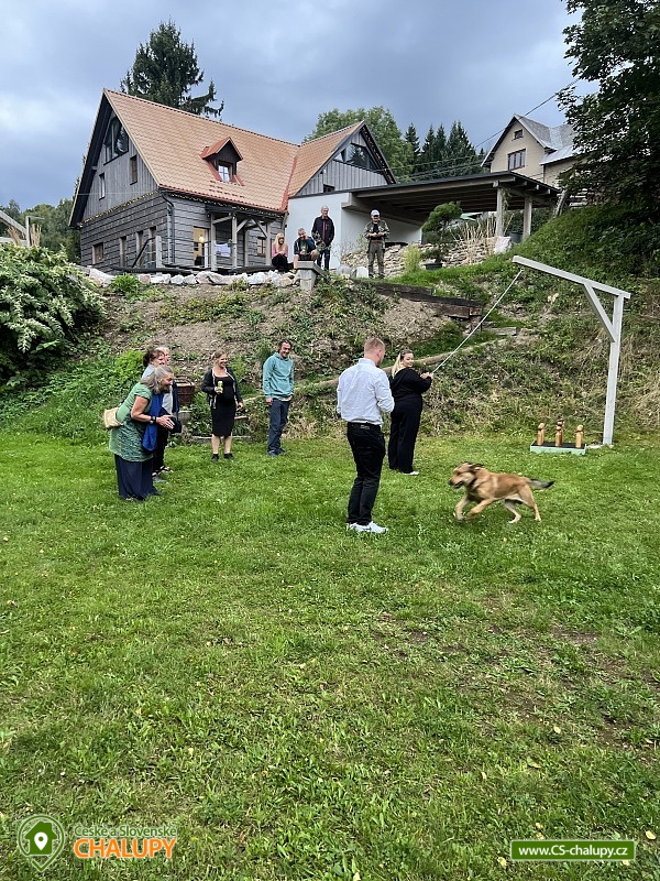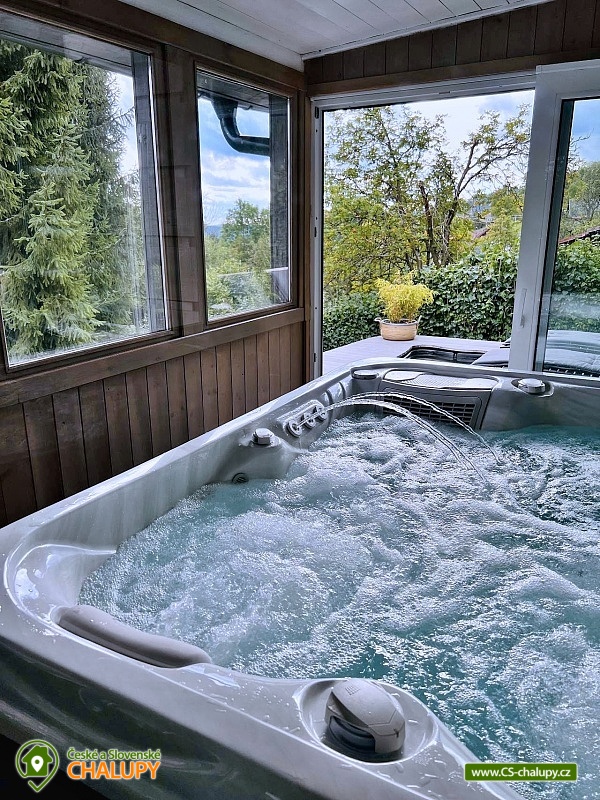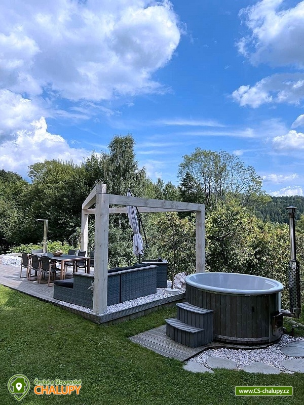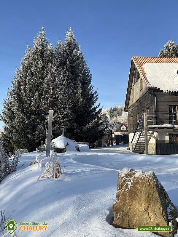 Wellness horská chata s bazénem se nachází na okraji malé obce Český Šumburk na pomezí Krkonoš a Jizerských hor - lokalita obcí Příchovice a Kořenov. Na terase u chaty je pro Vás připravený vyhřívaný bazén se slanou vodou a posezením, odkud je kouzelný výhled do horského údolí a nedalekých lesů. Možnost využití venkovního vířivého sudu a vnitřní infrasauny a vířivky. Chata nabízí ubytování pro až 24 osob v celkem 6 pokojích. Pokoje jsou v prvním patře, každé dva pokoje mají vždy společnou koupelnu a toaletu plus jeden samostatný záchod je na chodbě. Kuchyně je plně vybavená s plynovým sporákem, velkou troubou, mikrovlnkou, americkou lednicí, a druhá lednice s mrazákem na chodbě, varná konvice, espresso, toustovač. Posezení u stolu v kuchyni je pro 12 osob a dalších 8 je ve společenské místnosti s televizí a krbem.Větší společenská místnost je na vyžádání a vejde se do ní 20 osob a další židle se dají přidat z menší společenské místnosti ,třeba na teambuilding a větší oslavy. Chata je v zimě vytápěna tepelným čerpadlem. Ve spodní části zahrady vás okouzlí velké prostorné posezení s grilem a ohništěm. Pro děti jsou připraveny houpačky, globus kolotoč a velká obdélníková trampolína zapuštěná v zemi s rozlehlou zahradou a loukou. K dispozici je také velké hřiště na volejbal nebo fotbal, dále stolní tenis, badminton,kuželky,petanque.OKOLÍ: V Příchovicích je krásná naučná stezka Járy Cimrmana U čápa s restaurací a hřištěm, opodál minigolf 5 min autem. Poblíž ve vsi Zlatá Olešnice se nachází koupaliště s beachvolejbalovým hřištěm a hřištěm pro děti. V obci Kořenov je možné využít bowling 10 min autem. Lanové centrum Harrachov 13 min autem, Bobová dráha Harrachov, Vodopády Jedlové, Rozhledna Bramberk, Mumlavský vodopád a Rozhledna Štěpánka. V Tanvaldu je úžasná pekárna, cukrárna, pizzerie, kebab. V zimě je v dosahu 3km sjezdovka v Příchovicích U čápa, 3km Rejdice s vyžitím pro snowboardy, ski areál Rokytnice nad Jizerou, Harrachov a Tanvaldský Špičák vzdálený 20 km. Trasa pro běžkaře je u rozhledny Štěpánka (4 km). Těšíme se na Vás u nás.