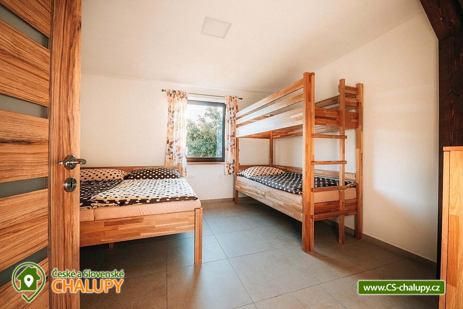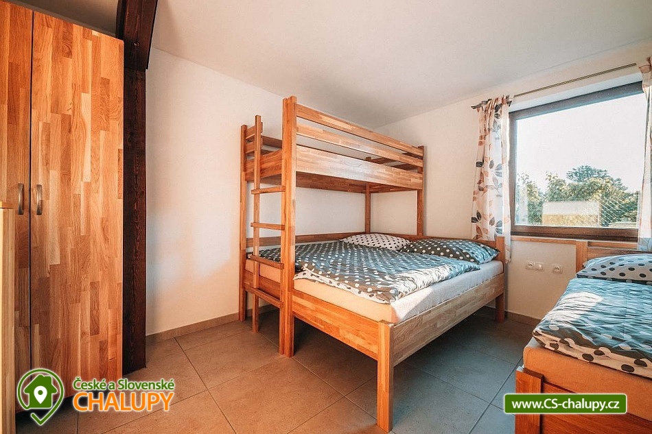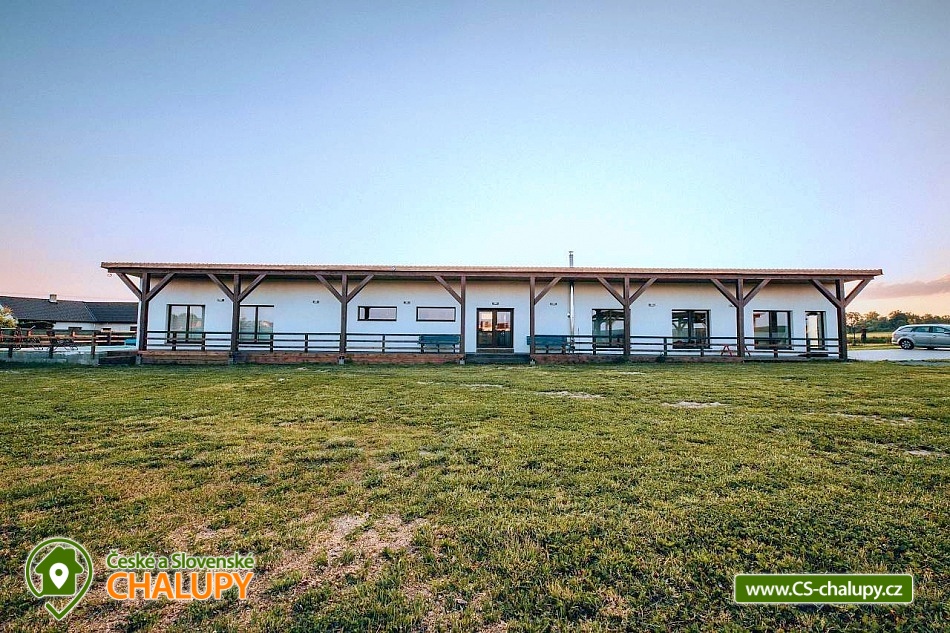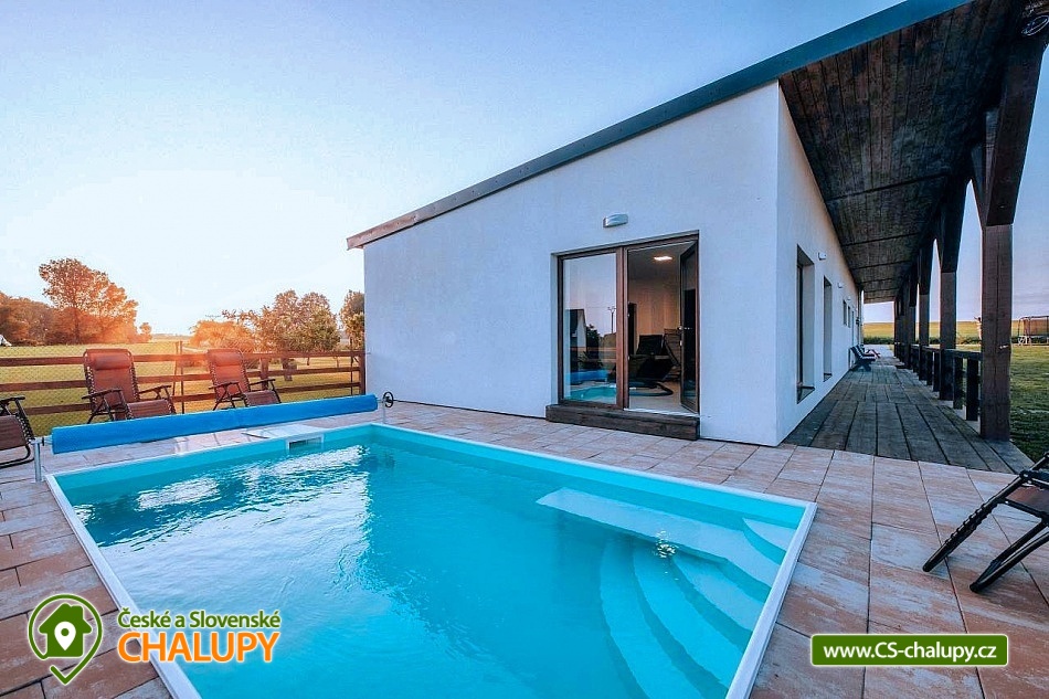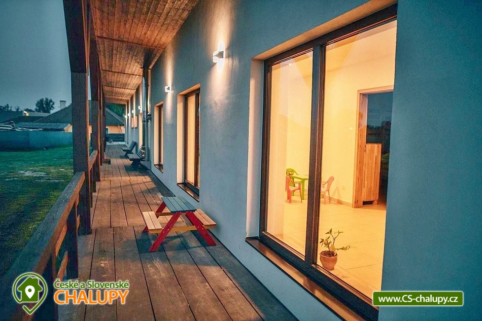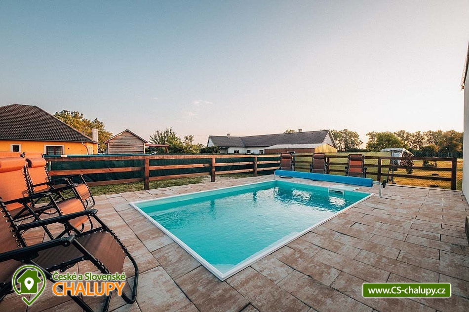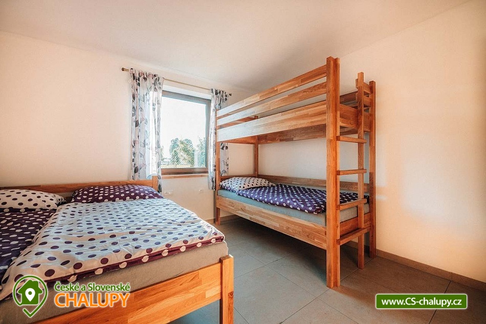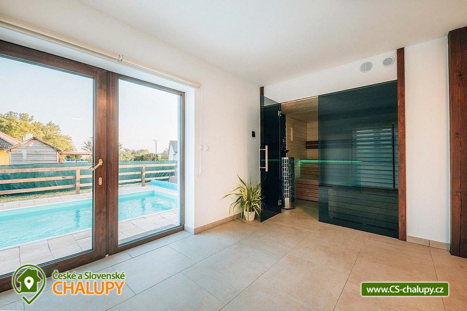 Chata s bazénem a wellness se nachází 12 km od Vranovské přehrady, poloha na okraji obce Mladoňovice na Vysočině. V blízkém okolí si přijdou na své příznivci pěkné přírody, historických pamětihodností i cykloturisté. Chata je v oploceném areálu s pestrým vyžitím a nabízí ubytování pro až 16 osob ve čtyřech čtyřlůřkových ložnicích. Dvě ložnice mají k dispozici 1x dvoulůžko a 1x patrovou postel. V dalších dvou ložnicích je umístěné 1x jednolůžko, 1x dvoulůžko a 1x jednolůžková patrová postel nad dvoulůžkem. Chata je přízemní, vstupuje se do ní z vlastního parkoviště. Prochází se přes prosvětlenou širokou chodbu, z které se vstupuje do 4 ložnic. Součástí obytné chodby je menší dětský koutek a fotbálek. Dále na chodbu navazuje společenská místnost s jídelnou s TV. Součástí místnosti je také plně vybavená kuchyň, ve které jsou k dispozici 2 lednice (z toho jedna s mrazícím boxem), myčka na nádobí, indukční varná deska (4 varné jednotky), mikrovlnná trouba, elektrická trouba, pračka a toustovač. Ze zadní části jídelny se vchází do wellness zázemí, jehož součástí je finská sauna pro 6 osob, zapuštěná podsvícená ochlazovací káď, dva sprchové kouty a prostorná odpočívárna s relaxačními lehátky. Dále sociální zařízení zahrnuje dvě koupelny s dvojumyvadly a a walk - in sprchovým koutem. K dispozici je povlečení, kuchyňské utěrky, základní mycí prostředky, ručníky na toaletě, podložky do sauny. Ručníky a osušky je nutné mít vlastní. Vytápění je řešeno elektrickým podlahovým topením v celé chatě. K dispozici je v celém objektu WIFI připojení na internet. Z jídelny a z wellness zóny lze přes balkónové dveře vstoupit na terasu, které je podél celé chaty. Tato terasa bezbariérově navazuje jak na parkoviště, tak na dlážděnou terasu s venkovním zapuštěným bazénem (5x3m) a s lehátky. Kolem chaty se rozléhá oplocená zahrada (1200m²), na kterou je přístup bránou z příjezdové cesty, vchodovými dveřmi u parkoviště, dveřmi z jídelny či balkonovými dveřmi z wellness zázemí. Součástí zahrady je zastřešená pergola (5x15m) s posezením, plynovým grilem, elektronickými šipkami a disponuje též houpacím kruhem a houpací sítí. Dále se na zahradě nachází venkovní posezení s ohništěm a dětské hřiště s domečkem, skluzavkou, trampolínou a houpačkou pro nejmenší. Parkovat lze přímo u objektu. V okolí objektu možnost turistiky, cykloturistiky, koupání, houbaření a rybaření. V blízkosti jsou také tenisové kurty a jízdárna. Mezi možnosti koupání patří např.: Vranovská přehrada, Biotop Jemnice, koupaliště Nimpšov, rybník Hrachovec, přehrada Plichťák, Bítovská zátoka, rybník Vidlák, koupaliště Moravské Budějovice, rybník Dolní Modletický, koupaliště Dačice, Nový rybník, koupaliště Jaroměřice nad Rokytnou a další. K výletům v okolí láká Mladoňovice - Expozice Petra Mladoně, Police - zámek, Muzeum RAF, židovský hřbitov, Uherčice – zámek, Bítov - hrad, rozhledna Rumburak, Vranov nad Dyjí - zámek, Národní park Podyjí, Jaroměřice nad Rokytnou – zámek nebo Znojmo - Jihomoravské muzeum, Znojemský hrad, Rotunda sv. Kateřiny, Památník Prokopa Diviše, Minoritský klášter, Znojemské podzemí a Vlkova věž nebo Telč, Dačice a další. Těšíme se na Vás u nás.
