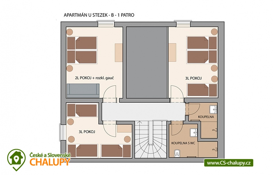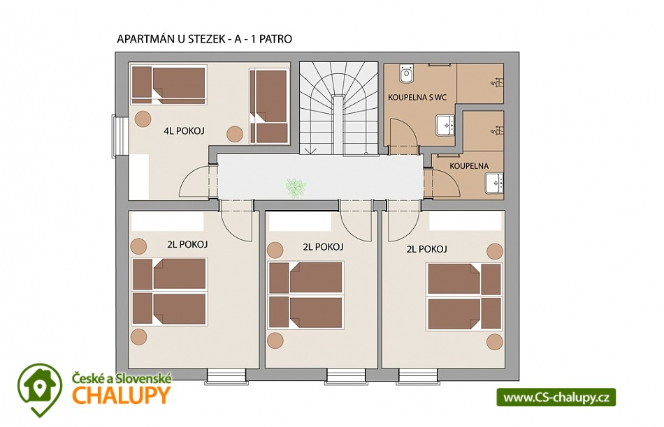 - 8 ložnic: 1x 4, 2x 3, 1x 2+1, 4x 2