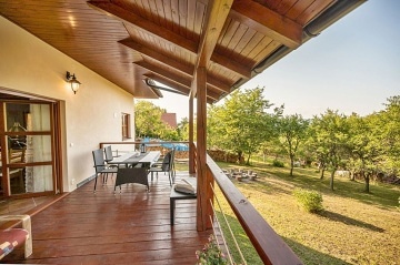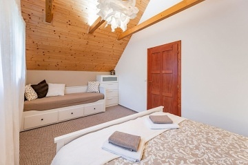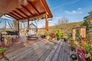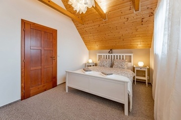 Komfortně vybavená rekreační chata s rozlehlou zahradou a koupacím sudem v CHKO Bílé Karpaty je posazená nad malebným údolím lázní Luhačovice, obklopená hlubokými lesy. V okolí si můžete o samotě užívat pěší a cyklo výlety krásnou přírodou Bílých Karpat. Chata poskytuje ubytování pro až 8 osob ve dvou ložnicích umístěných v patře. Obě ložnice disponují jednou manželskou postelí a jedním rozkladatelným lůžkem (1+1). K zapůjčení je dětská postýlka. Kromě toho se v patře nachází toaleta a komody na oblečení. V přízemí najdete hlavní obytný prostor. Součástí obývací části jsou krbová kamna, sedací souprava, jídelní stůl a chytře schovaná velkoplošná TV obrazovka. Na obývací prostor navazuje plně vybavená kuchyňská linka (sporák, trouba, lednice, mikrovlnná trouba, myčka, topinkovač, rychlovarná konvice a kapslový kávovar Nespresso). V celém objektu k dispozici WIFI připojení na internet. Sociální zařízení zahrnuje jednu přízemní koupelnu s toaletou a v patře jednu samostatnou toaletu. Pro veškeré pohodlí je k dispozici ložní povlečení, dostatečná zásoba osušek a ručníků i toaletního papíru. Chata je vytápěna pomocí krbových kamen, které jsou napojeny na podlahové topení i radiátory v ložnicích. O atmosféru se v létě postará prostorná terasa s posezením přístupná přes francouzské okno přímo z obývací části. Odtud je to jen krůček na velkou zahradu a k zahradnímu grilu. Během pobytu můžete neomezeně využívat dřevem vytápěný koupací sud s masážními tryskami. Každý si na zahradě najde své místo pro odpočinek. Pozemek lemují dostatečné zásoby palivového dříví. Využijete jej v chladných měsících do krbu a v létě na opékání buřtů na zahradním ohništi. Parkovat lze přímo u objektu. V zimním období výhodou vybavení sněhovými řetězy. V okolí chaty možnost turistiky, cykloturistiky, koupání, wellness, houbaření a rybaření. V blízkosti je také minigolf, bowling a tenisové kurty. Mezi možnosti koupání patří např.: Luhačovická přehrada, bazén Luhačovice - Městská plovárna, koupaliště Ludkovice, koupaliště Bojkovice, Koupaliště Slavičín, koupaliště Pitín, koupaliště Uherský brod, aquapark Uherský Brod - Delfín, koupaliště Zlín - Zelené, atd. K okolním výletům láká Muzeu luhačovického Zálesí s kabinetem architekta Dušana Jurkoviče, Jurkovičova alej (vhodná pro in -line) vedoucí k přehradě v Pozlovicích, Bílá a Pražská čtvrť s jejich vilami, nejstarší minerální pramen v Luhačovicích Aloiska, Dům Bedřicha Smetany, Jurkovičův dům, Vizovické vrchy, Vlachovice s tradiční sušárnou bylin a ovoce, typické roubenky ve Valašských Kloboukách, Uherský Brod či Zlín a mnoho dalších. Těšíme se na Vás u nás.
